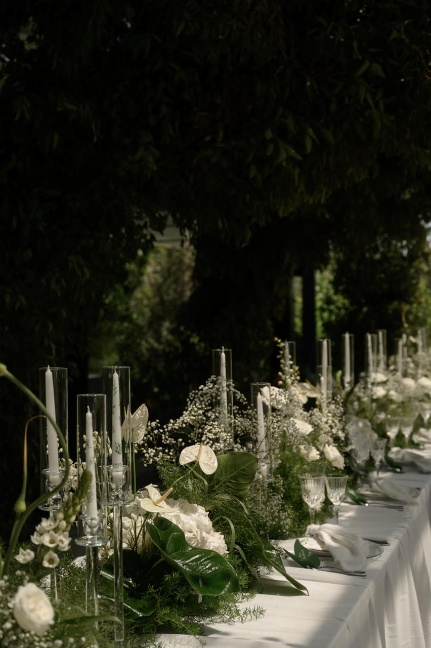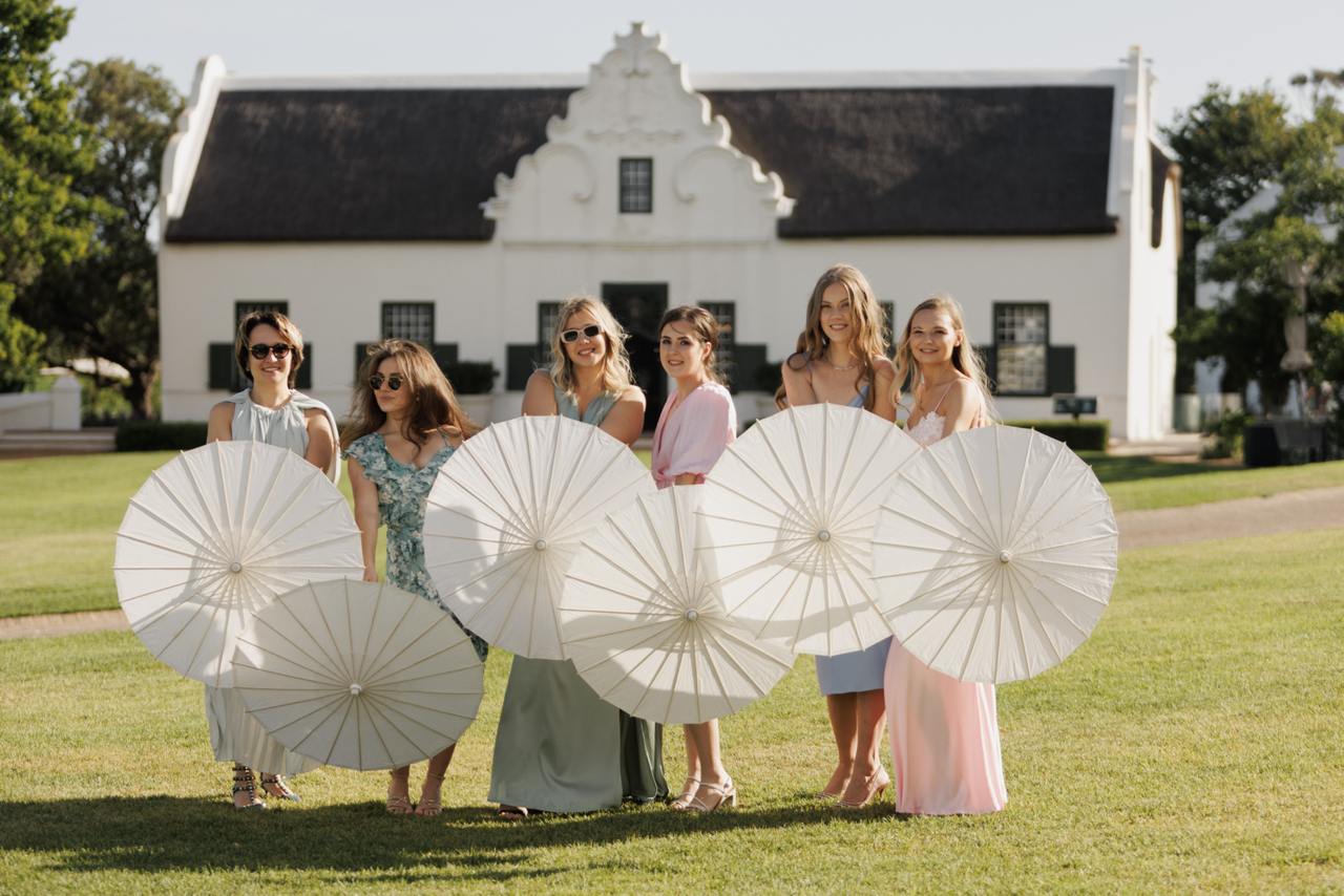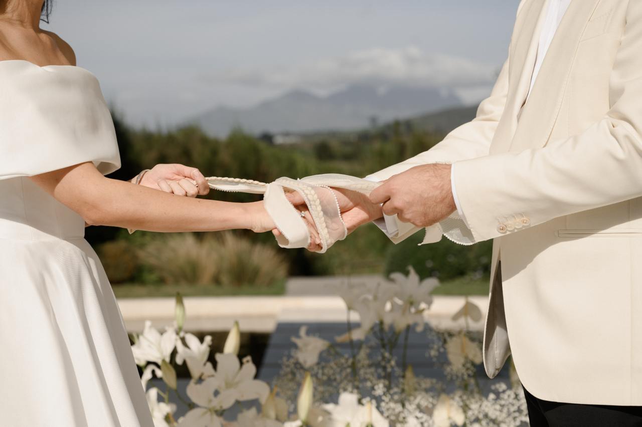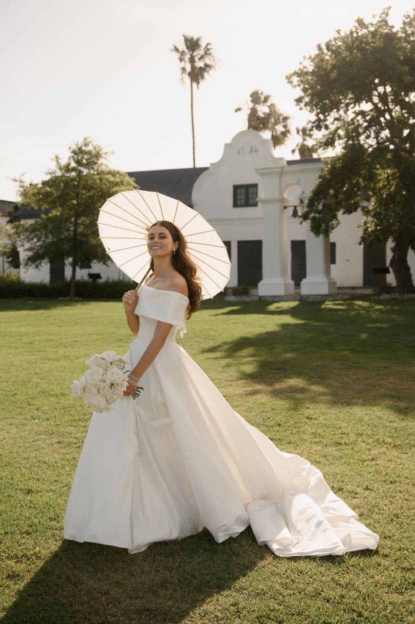 Три дня свадьбы прошли в бутиковом отеле Hazendal Wine Estate в винодельческом регионе Стелленбош. Сердце отеля — исторический белый павильон на воде с видом на горы превратился в зону церемонии. Декор основного свадебного дня был выбран в естественных бело-зеленых тонах, чтобы подчеркнуть мощь природы.