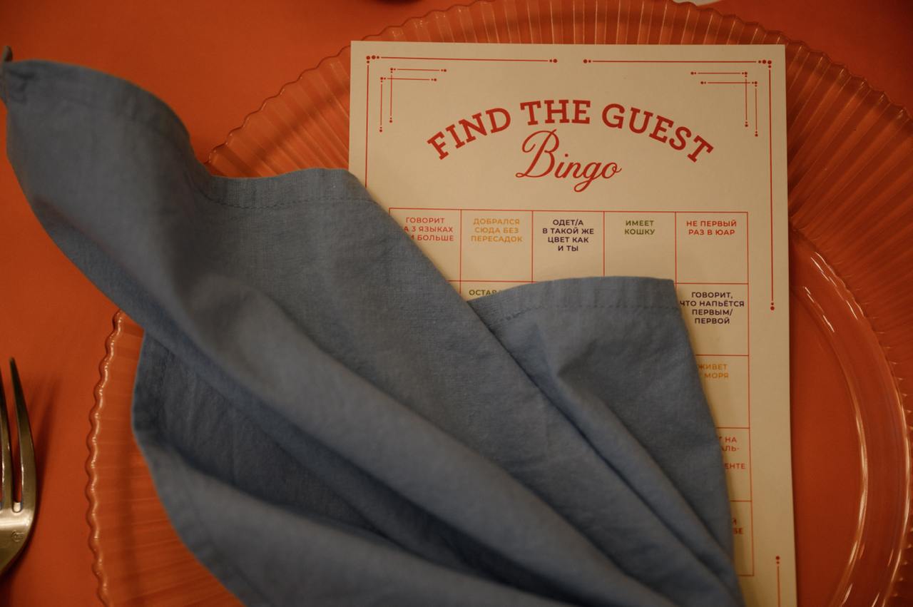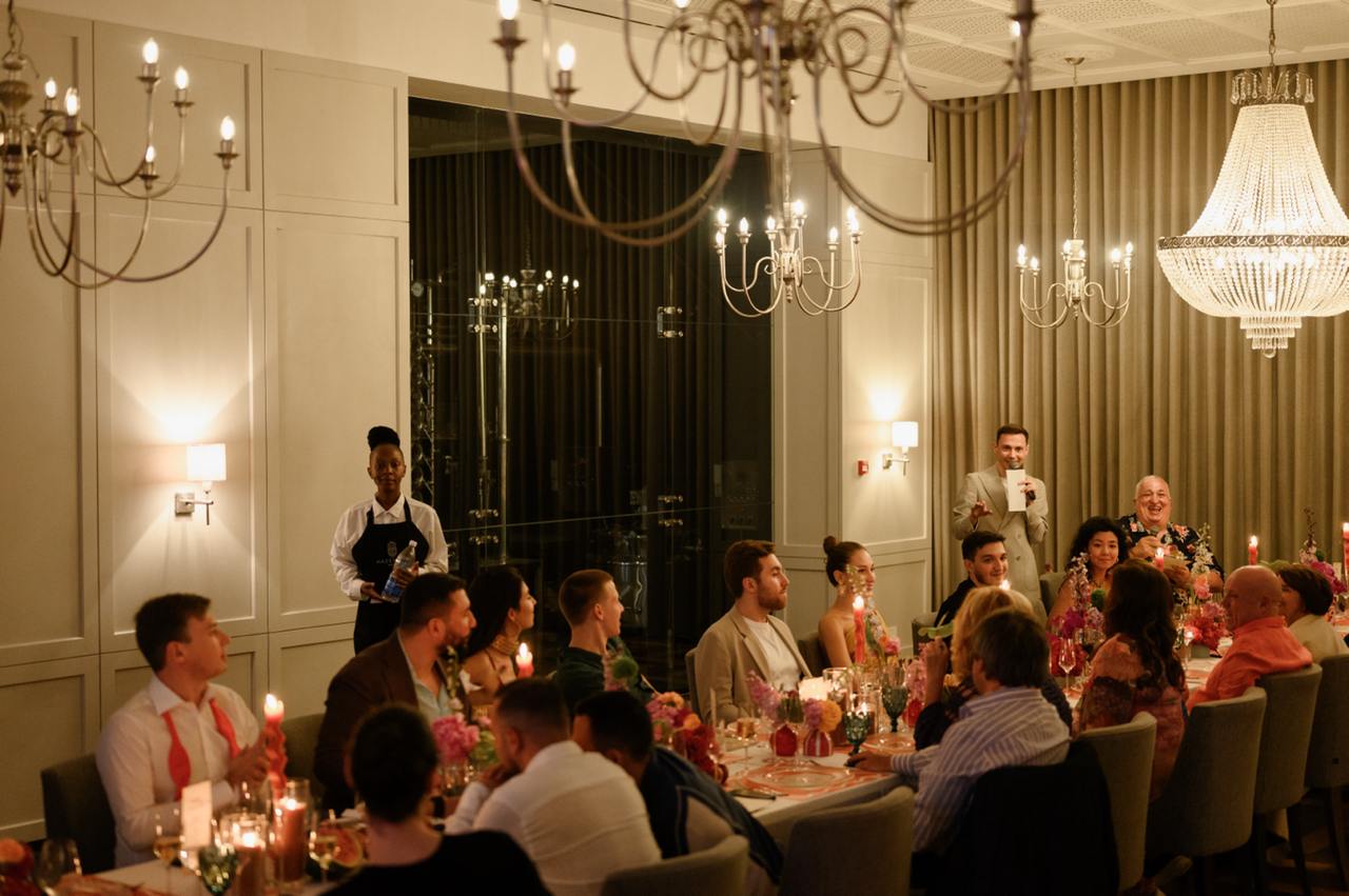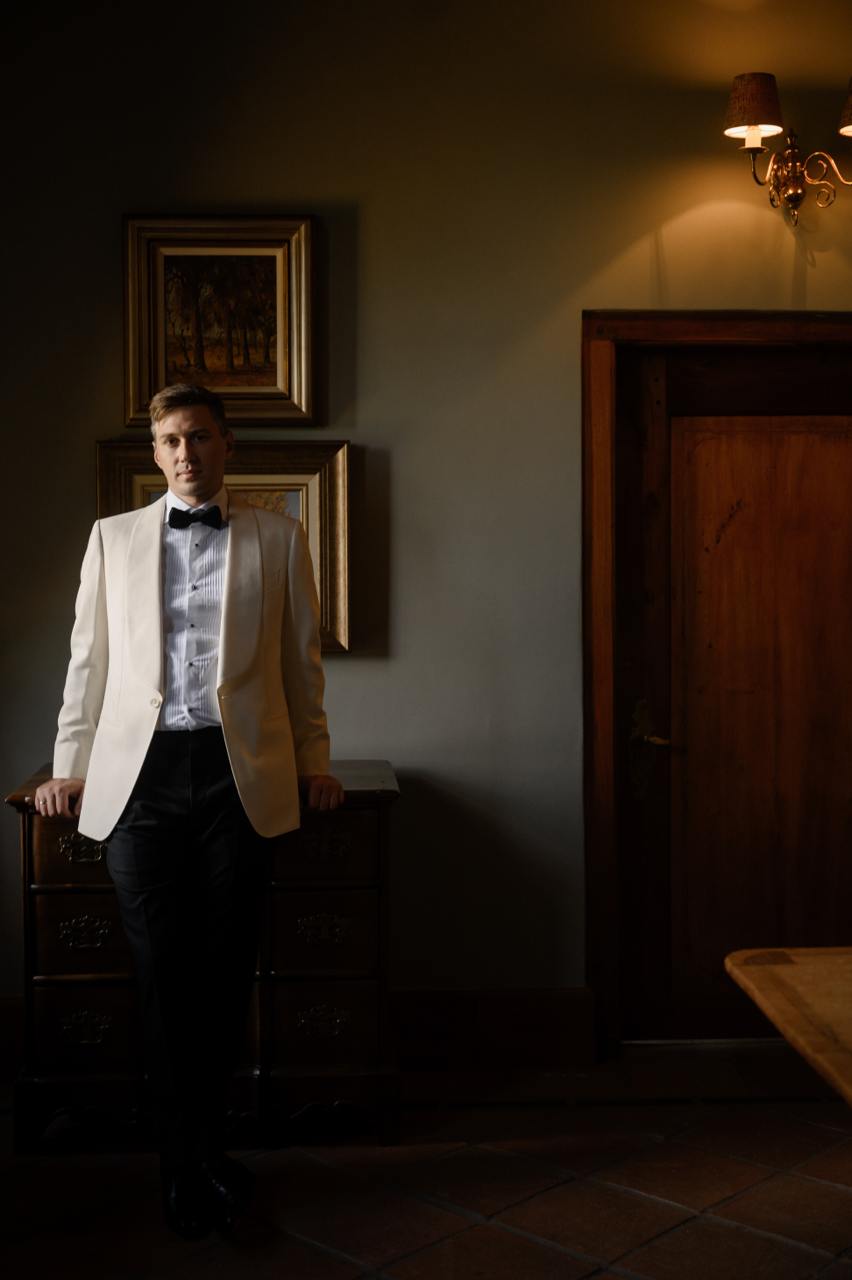 Идеей для концепции и развлечений послужили фильмы и стиль любимого режиссера ребят — Уэса Андерсона. Уикенд получил название The Grand Cape Town Wedding. Все элементы — от сайта до подарков — были персонализированы и служили сюрпризом для всех гостей. Особенно всех удивила газета о паре с их историей, генеалогическим деревом, гороскопами и даже кроссвордом. Образы пары подчеркнули стиль свадьбы: Ксюша выбрала романтичное платье в Москве, а стилист дополнила его аксессуарами. Саша был в классическом белоснежном смокинге.