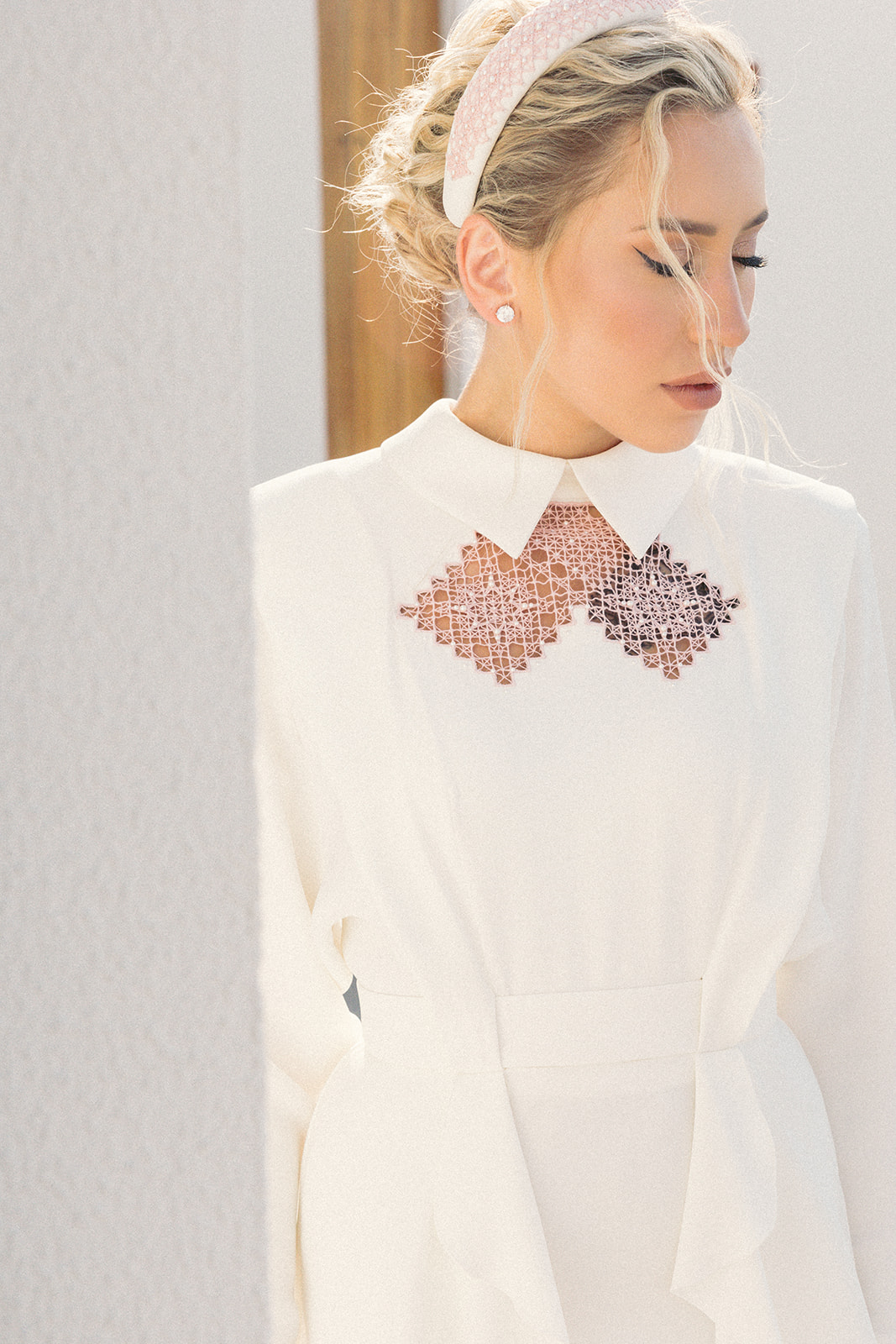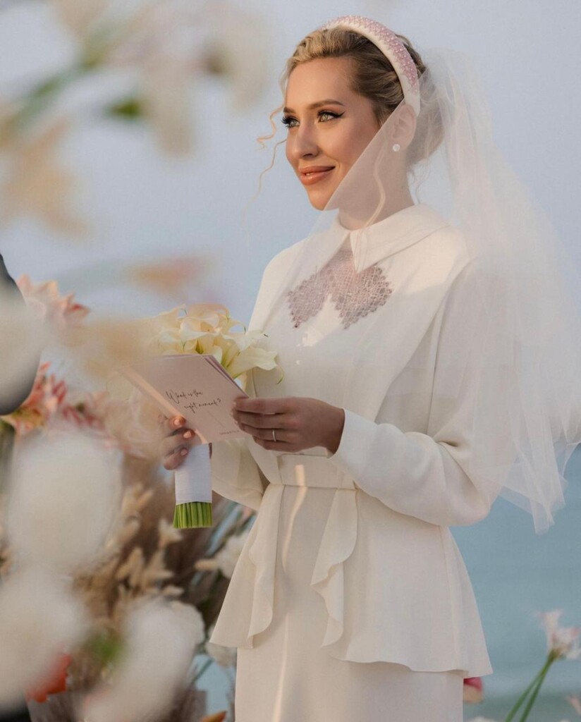 «Театральные образы в пустыне и на пляже — это очень эстетично, но и нетривиальные классические варианты возможны. Например, на свадьбе Юли в Nikki Beach у нас было платье Ulyana Sergeenko с вышивкой в русском стиле. Юля любит яркие акценты, поэтому мы выбрали активные стрелки, достаточно плотный тон. На голове невеста разрешила мне поэкспериментировать с небрежной волной на тройную плойку. Локоны я дополнительно прорабатывала текстурайзером. Это все сложилось в небрежный пучок, из которого красиво выпадали прядки. Этому пучку были не страшны ветер и погодные условиях, он смотрелся очень натурально в условиях пляжа и обстановки отеля. Также мы обыграли все стильными аксессуарами, обручем ручной работы. Несмотря на то, что образ получился не совсем типичным для Дубая, у нас была гармоничная картинка».
