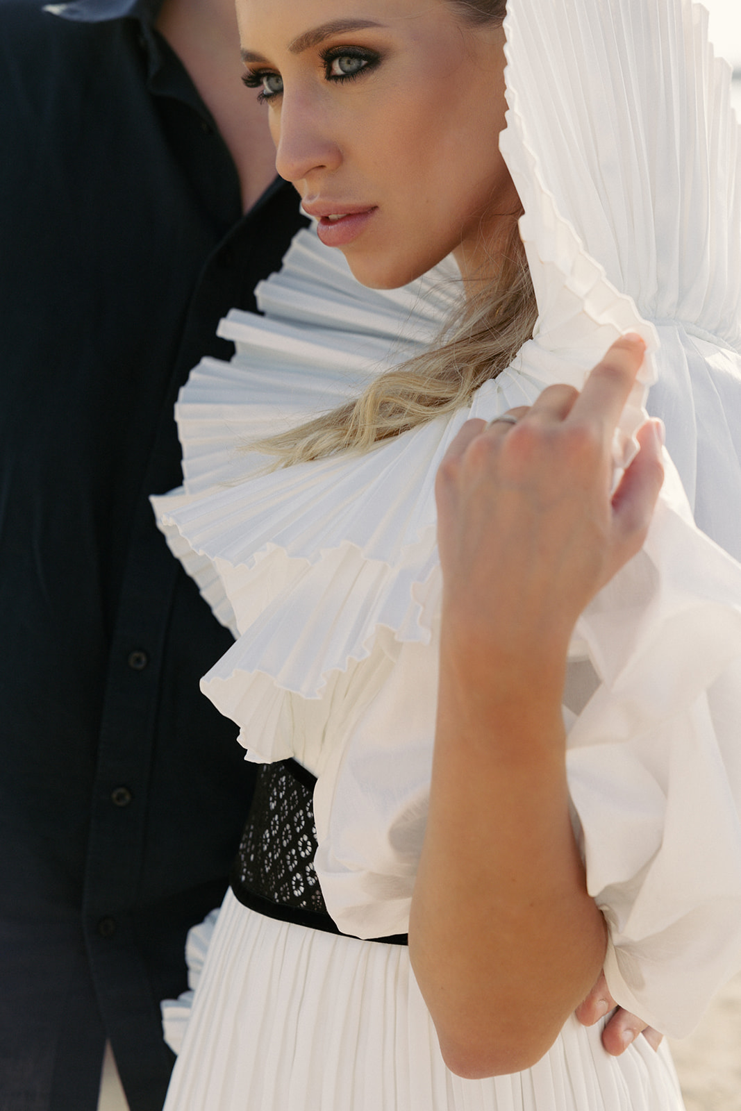 «У многих срабатывает стереотип, что в ветреную погоду и на жаре лучше всего прочно зафиксировать прическу лаком. Но тогда мы уйдем от природности образа, а случайно выбившаяся прядка будет выглядеть неестественно. Поэтому для свадьбы на пляже и в эстетике пустыни советую выбирать летящие волны, небрежные пучки, косы, хвосты, чтобы прическа спустя несколько часов выглядела натурально и эстетично. Здесь преимущество у текстурайзеров и средств с морской солью — они придают легкую небрежность и отлично подчеркивают струящиеся волосы».