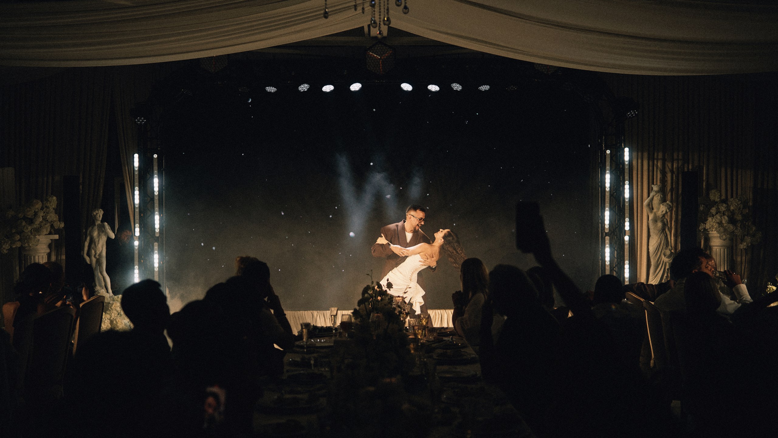 Мы со Стасом любим Италию, несмотря на то, что были там всего лишь раз. Но мы чувствуем себя будто бы причастными к ней. Я из Тольятти, и каждый тольяттинец считает себя немножечко итальянцем, поэтому за основу концепции было взято всё, что связано с Италией. Спасибо нашим прекрасным декораторам Оле Буробиной и Мадине Валиевой, они воплотили наши фантазии. В декоре были использованы колонны, которые как-то связаны и с Италией и с греческой мифологией. Там была Vespa, внутри на полу был газон. В общем, все детали были не просто так. Грубо говоря, концепция была в том, что мы пригласили к себе в маленькую Италию наших гостей. И прожили с ними вечер итальянской свадьбы.
