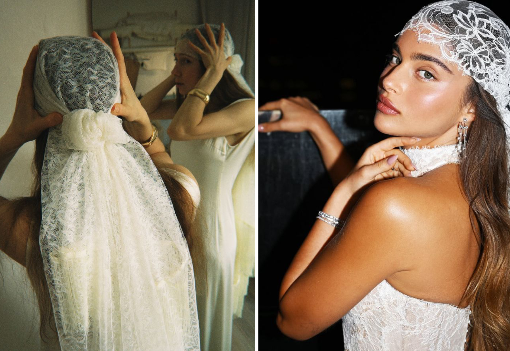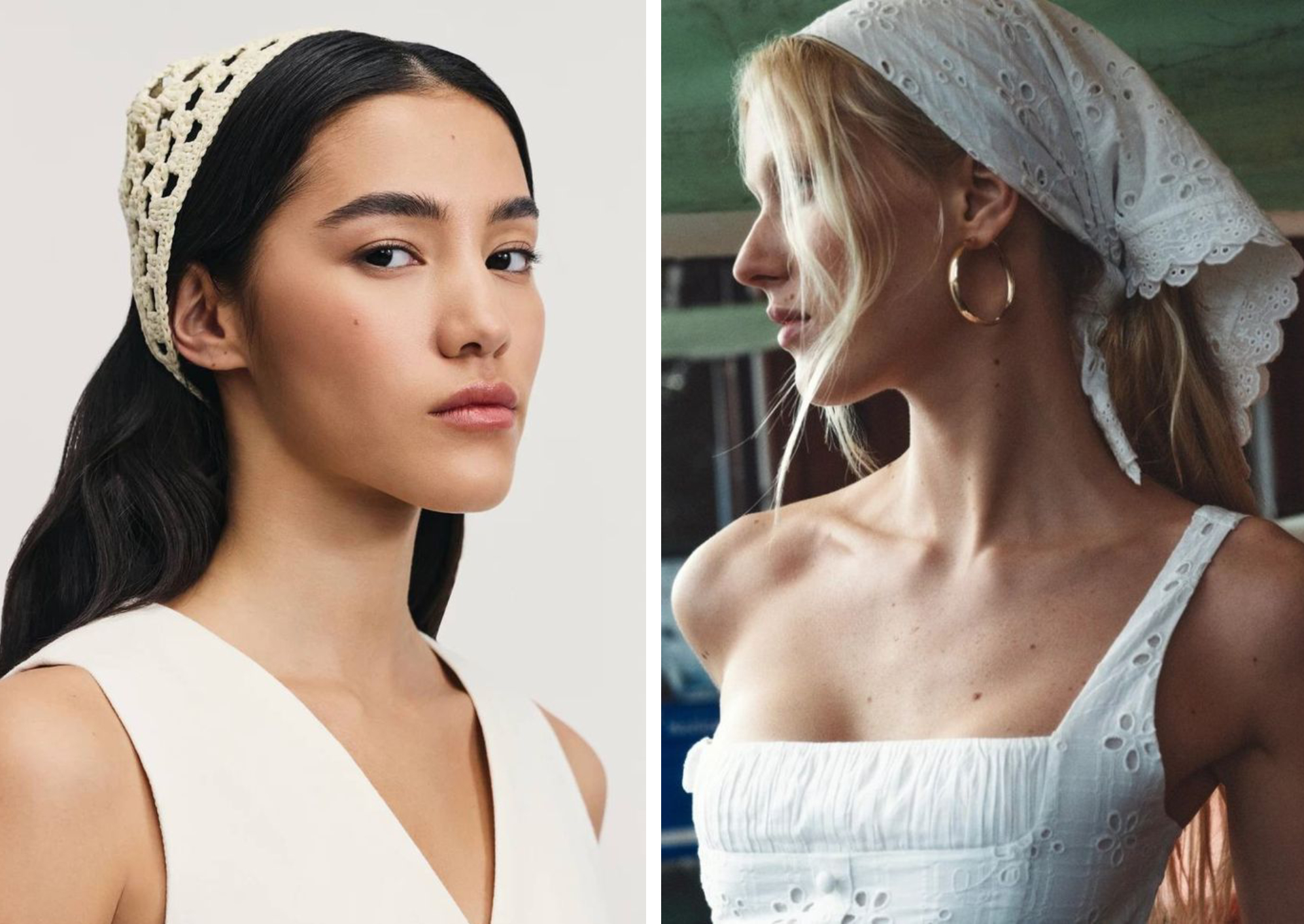 Абсолютный хит последних сезонов. В отличие от банданы, косынка (обычно треугольная) завязывается под подбородком, обрамляя лицо и придавая образу трогательное, кукольное очарование. Такой аксессуар из кружева кроше станет идеальным дополнением к свадебному костюму или лаконичному платью. Выглядит дерзко, но в то же время невероятно женственно.