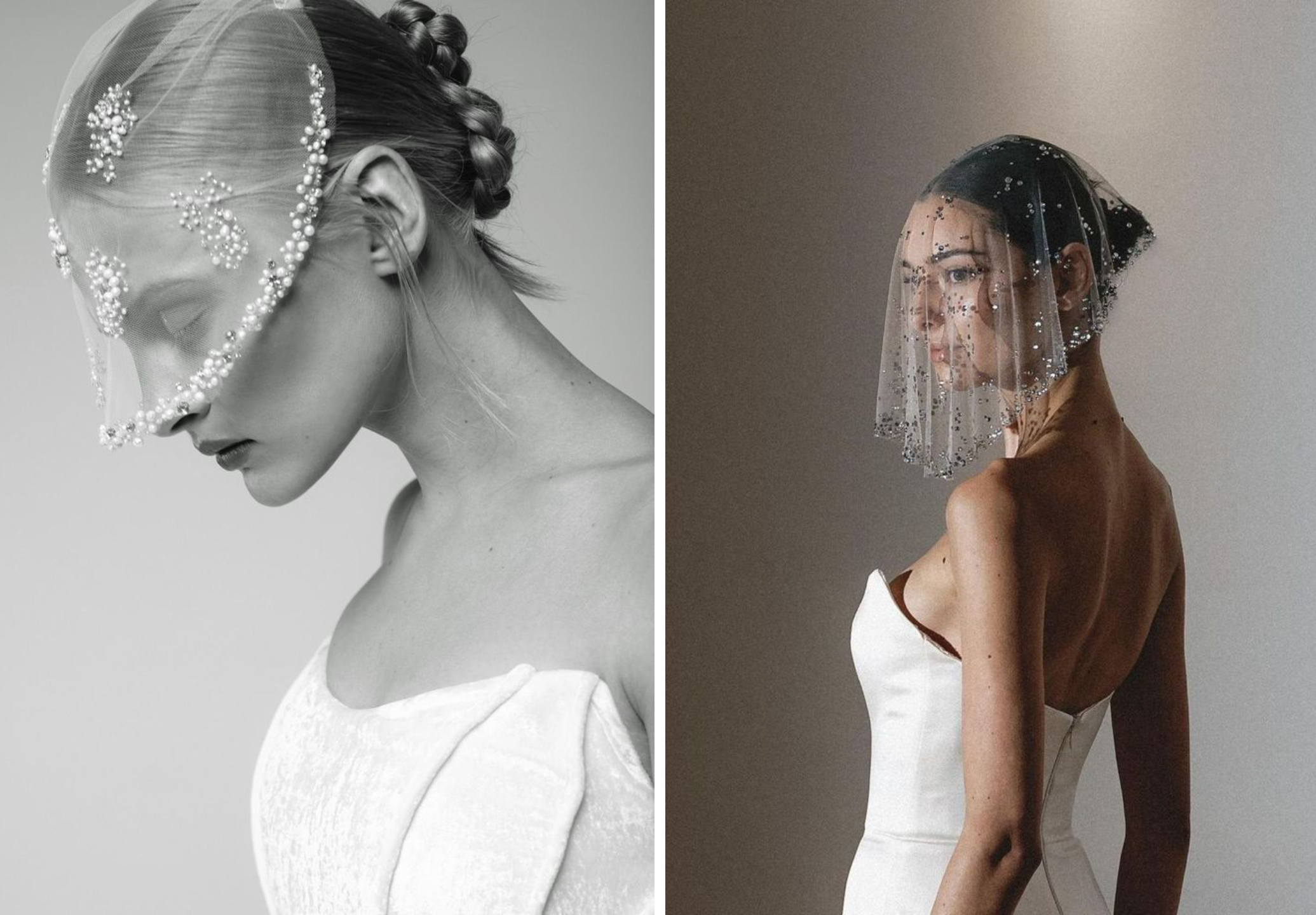 Вуаль — это младшая сестра фаты, но с более современным характером. Небольшая накидка из сетки или полупрозрачной ткани закрывает лицо или только глаза, крепясь к шляпке, ободку или просто к прическе на невидимках. Кстати, вуаль может быть цветная и даже черная. Последняя добавит образу драмы. Это идеальный выбор для камерной свадьбы.
