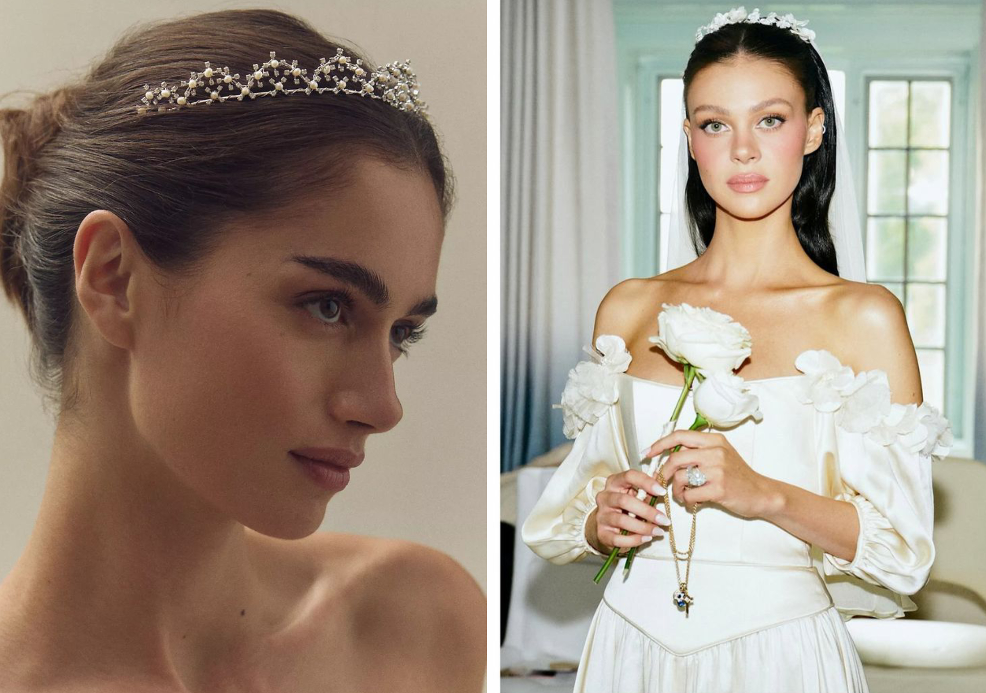 Ювелирные дома все чаще предлагают невестам диадемы, и это не просто «корона принцессы», а признак утонченной роскоши. В тренде тонкие, филигранные линии из золота или серебра с россыпью мелких бриллиантов. Диадема отлично смотрится с гладкими, стянутыми назад волосами, открывает лицо и делает осанку идеальной. Это выбор для торжества в классическом стиле или вечеринки со строгим дресс-кодом.