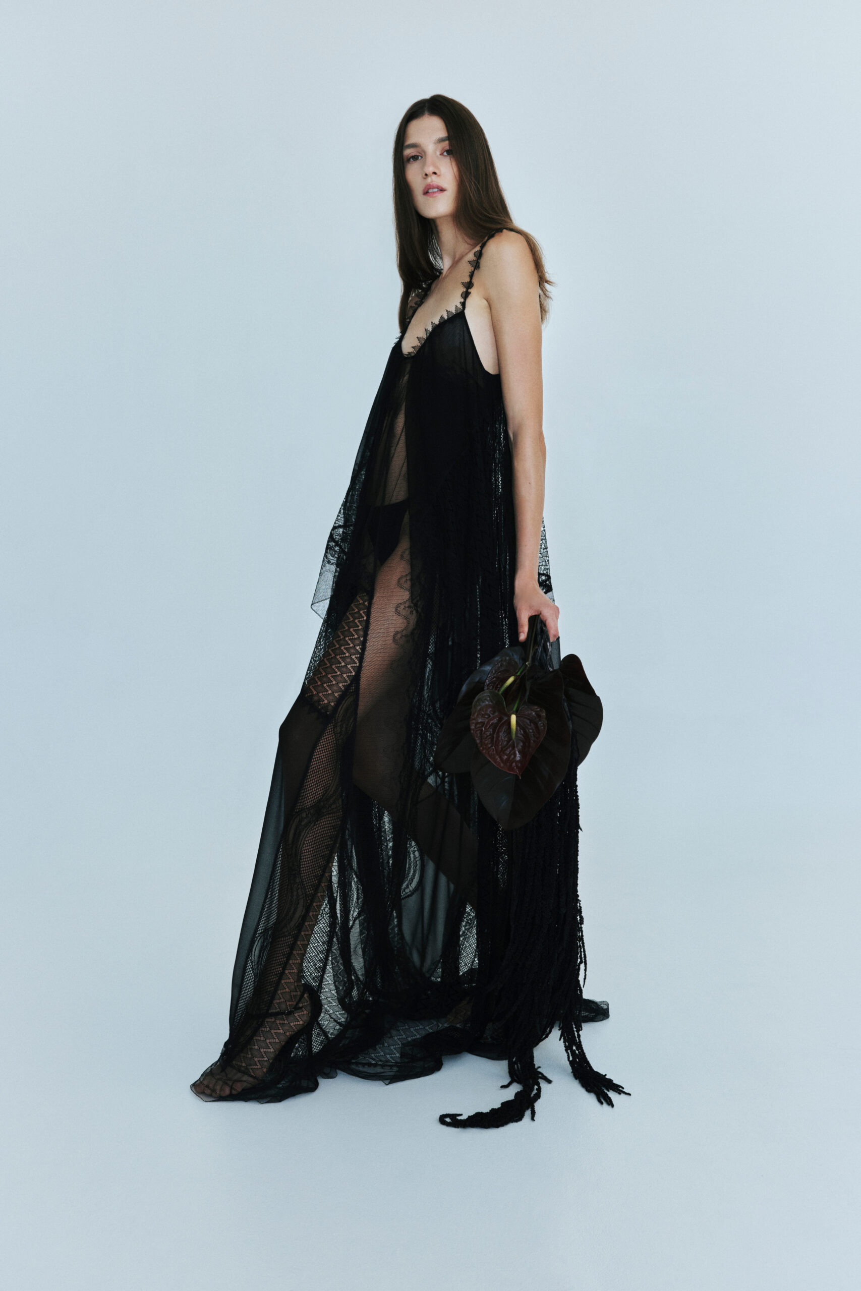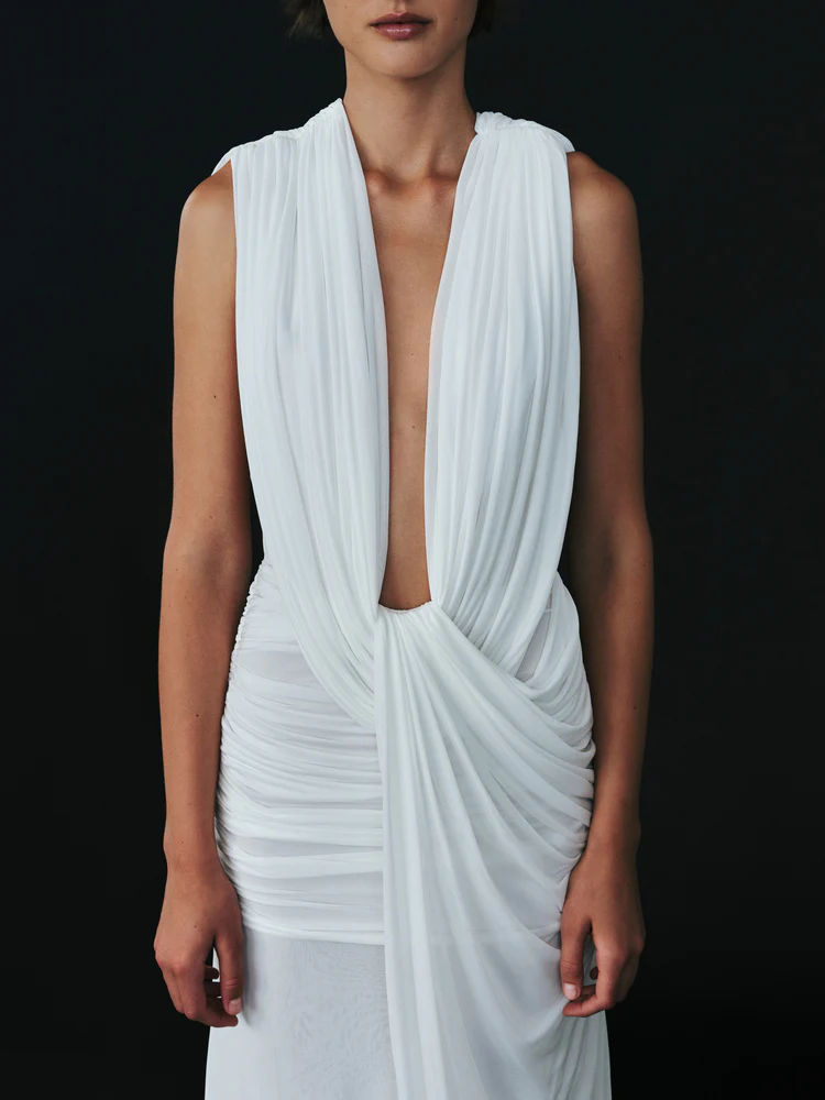 Предметы из коллекции примечательны сочетанием классического кроя, плавных форм и неожиданными деталями. Некоторые платья украшены перьями, другие — многослойным кружевом, третьи — драматической греческой драпировкой.
