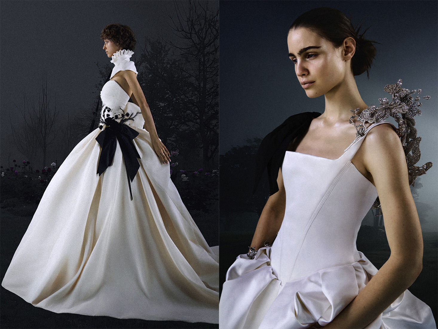 Коллекция построена на дерзких контрастах: архитектурные конструкции из тафты соседствуют с воздушной органзой, а викторианские корсеты — с асимметричным минимализмом. Каждое платье — символ личной свободы, подчеркнутый ручной вышивкой, экспериментами с кроем и деталями вроде драматичных съемных рукавов.