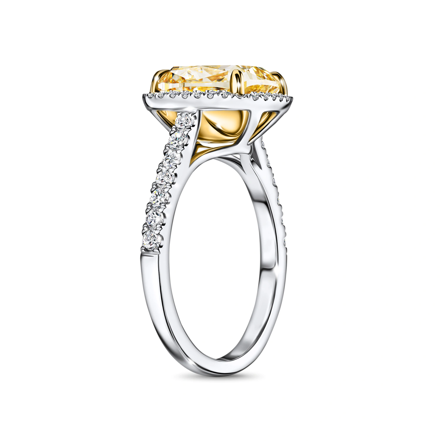 В центре внимания этой недели — эффектное кольцо российского бренда MIUZ. Главный герой лаконичной композиции — цветной бриллиант редкого лимонного оттенка. Его исключительный размер в 4,01 карата и чистая красота бережно раскрыты изысканной огранкой «кушон». Камень буквально парит в сияющем ореоле из бесцветных бриллиантов (общим весом 0,439 ct) круглой огранки, которые усиливают его внутреннее свечение.