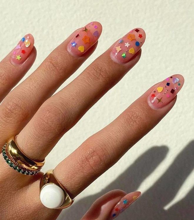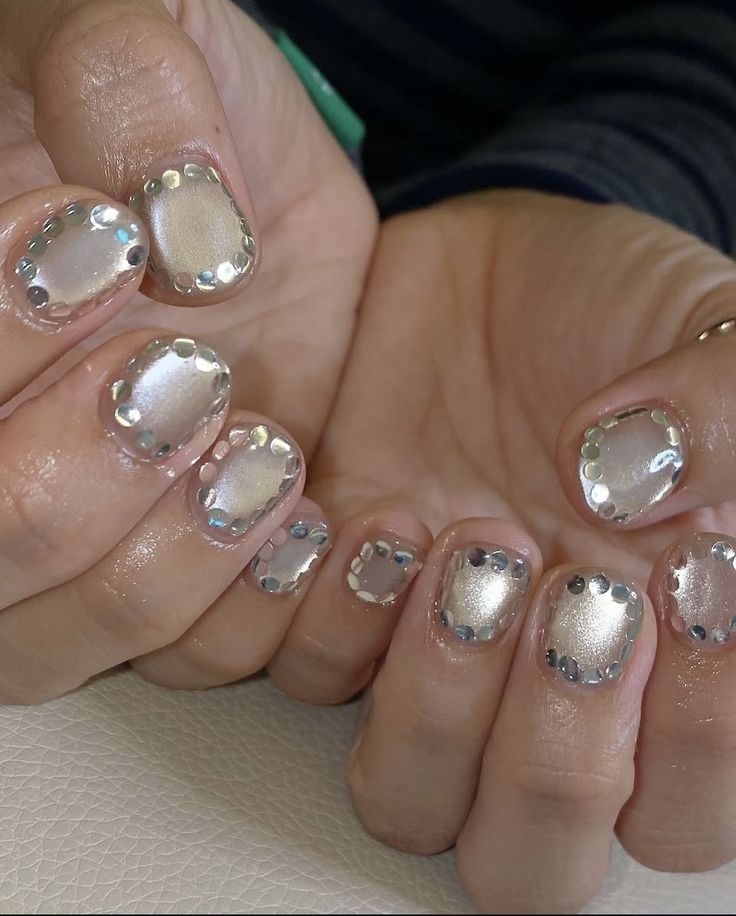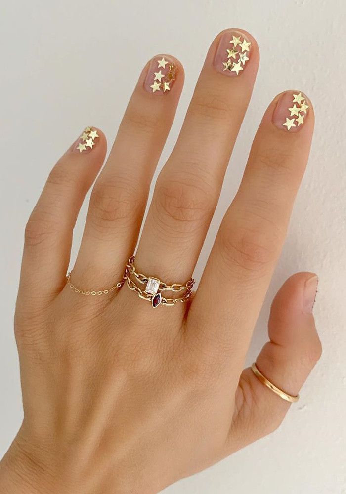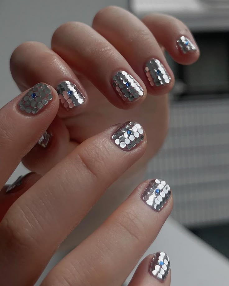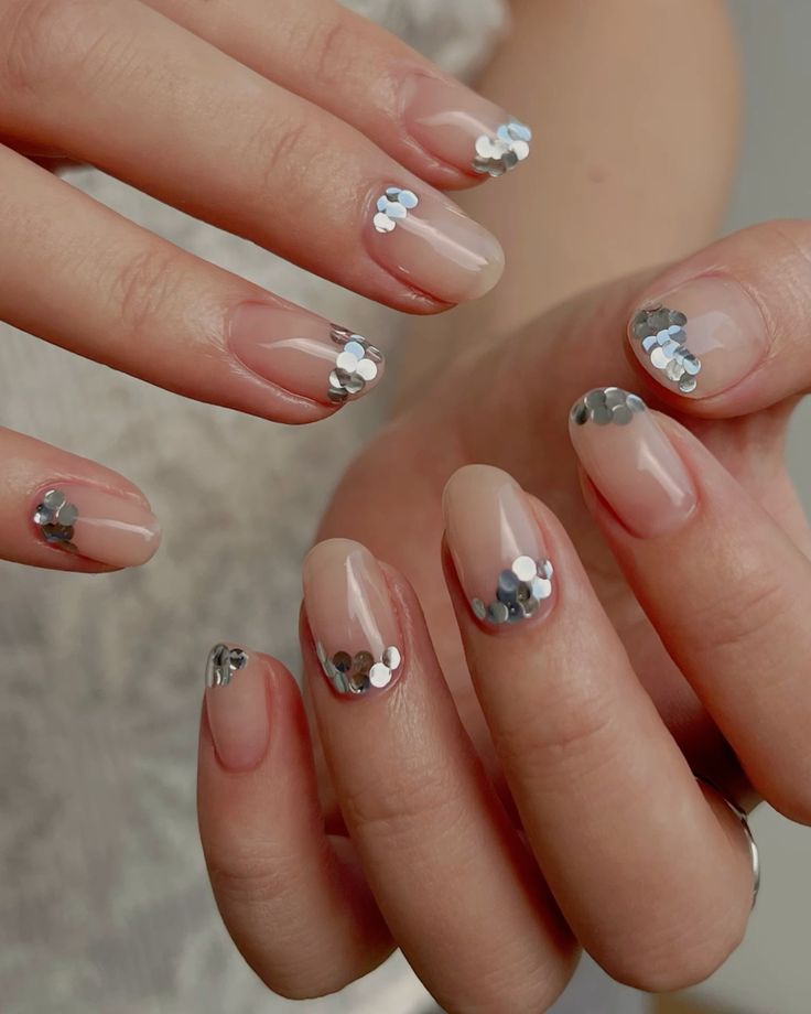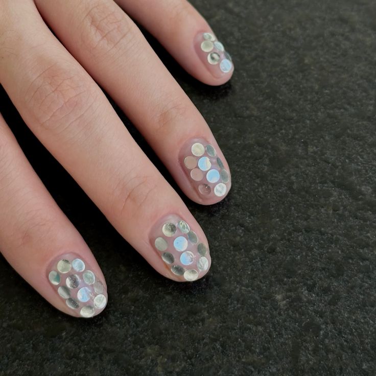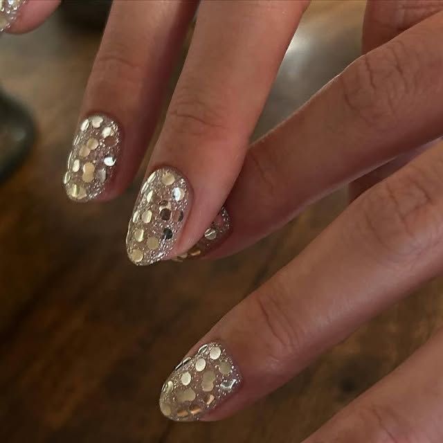 Крошечные круглые блестящие пластинки создают эффект диско-шара или праздничного салюта. Особенно волшебно это смотрится поверх нюдовой базы или прозрачного лака. Можно расположить пайетки хаотично (в таком случае достаточно использовать лак с крупными блестками), а можно ровно, тогда получается эффект знаменитой металлической кольчуги Rabanne.
