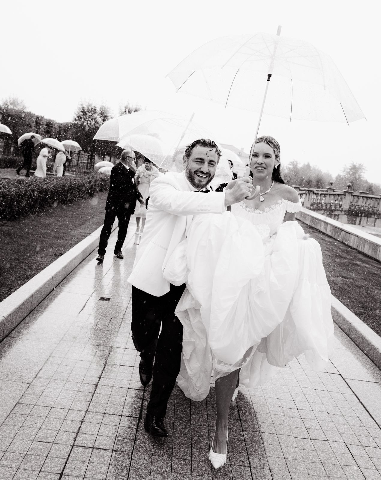 Далее при очередном визите в «Кураж», я увидела новое платье MEZZO с корсетом из коллекции 2026 года и решила просто его примерить. Оно село настолько фантастически, что я купила его тоже, хотя оно тоже было длинным. На свадьбе оно меня спасло, ведь после церемонии, на которой был проливной дождь, именно в это платье я переоделась на банкет.