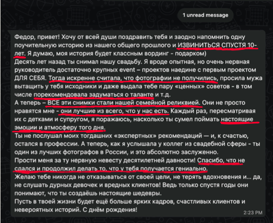 В моей практике был случай, когда невеста была недовольна съемкой. Спустя 10 лет мне пришло от нее поздравление с днем рождения, где она написала, что сделанные мной фотографии — самое ценное, что у нее есть.