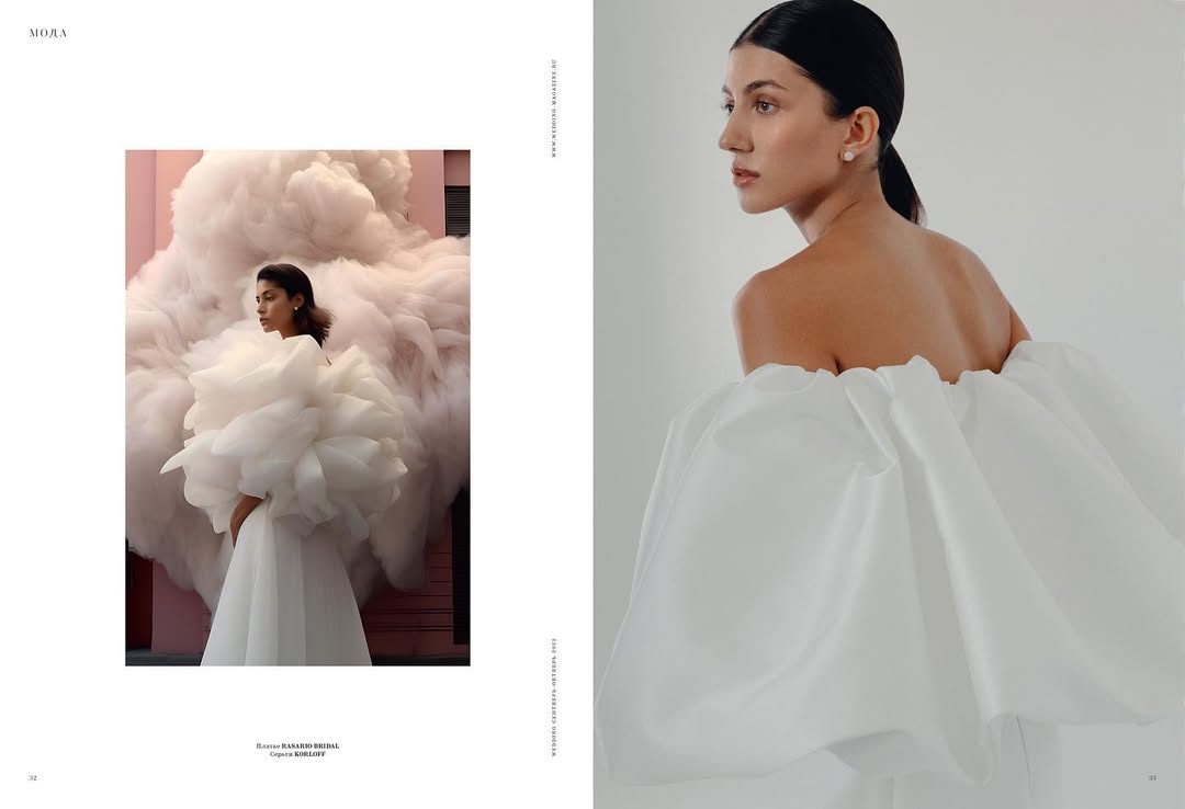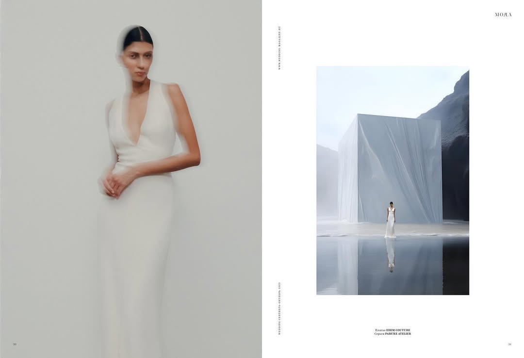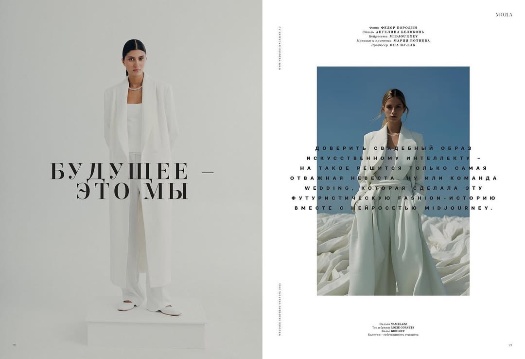 Пример съемки, где генерация переходит в жизнь: два года назад мы делали Cover Story с журналом Wedding. Часть кадров была снята с моделью, а часть — сгенерирована.