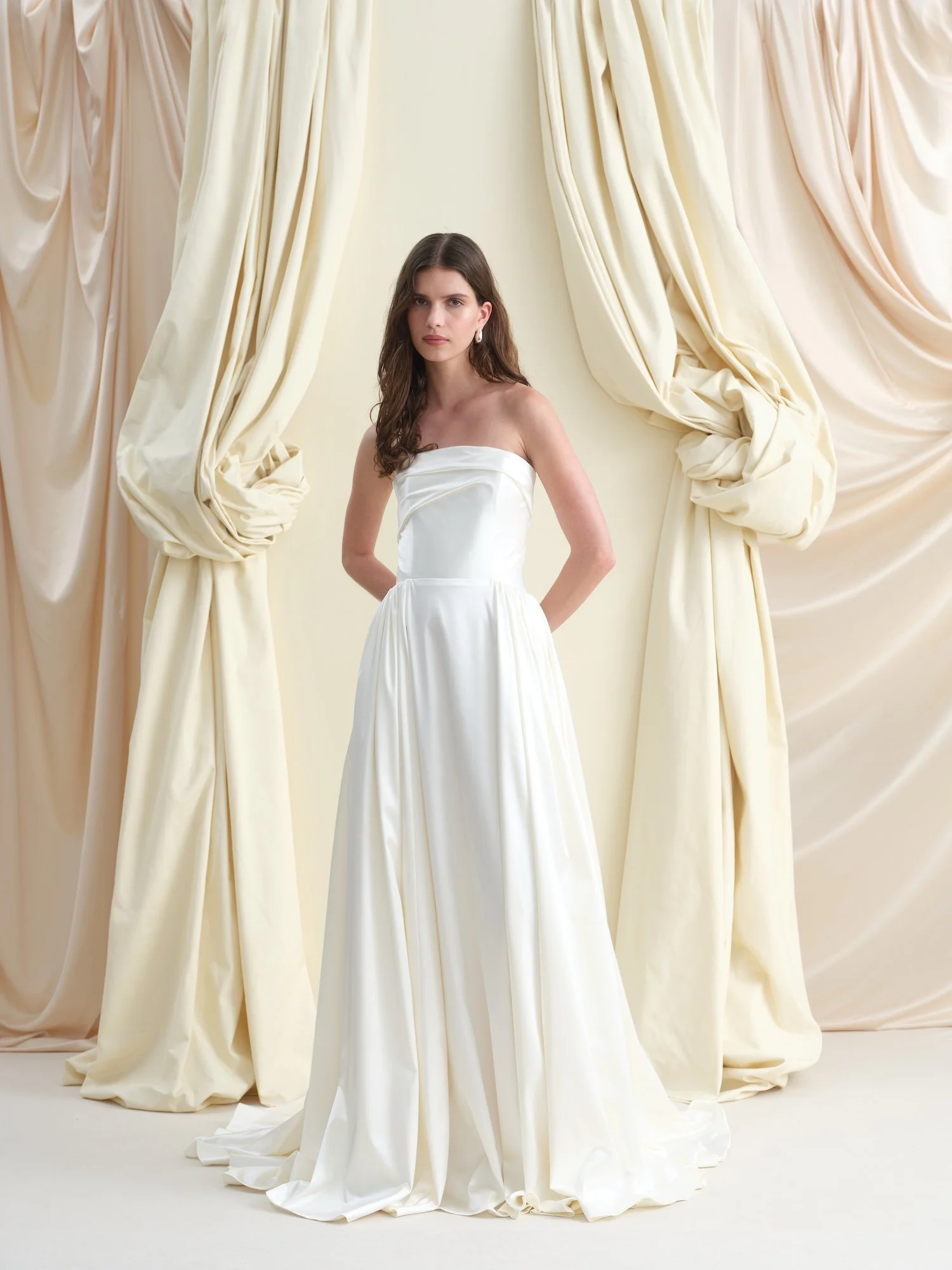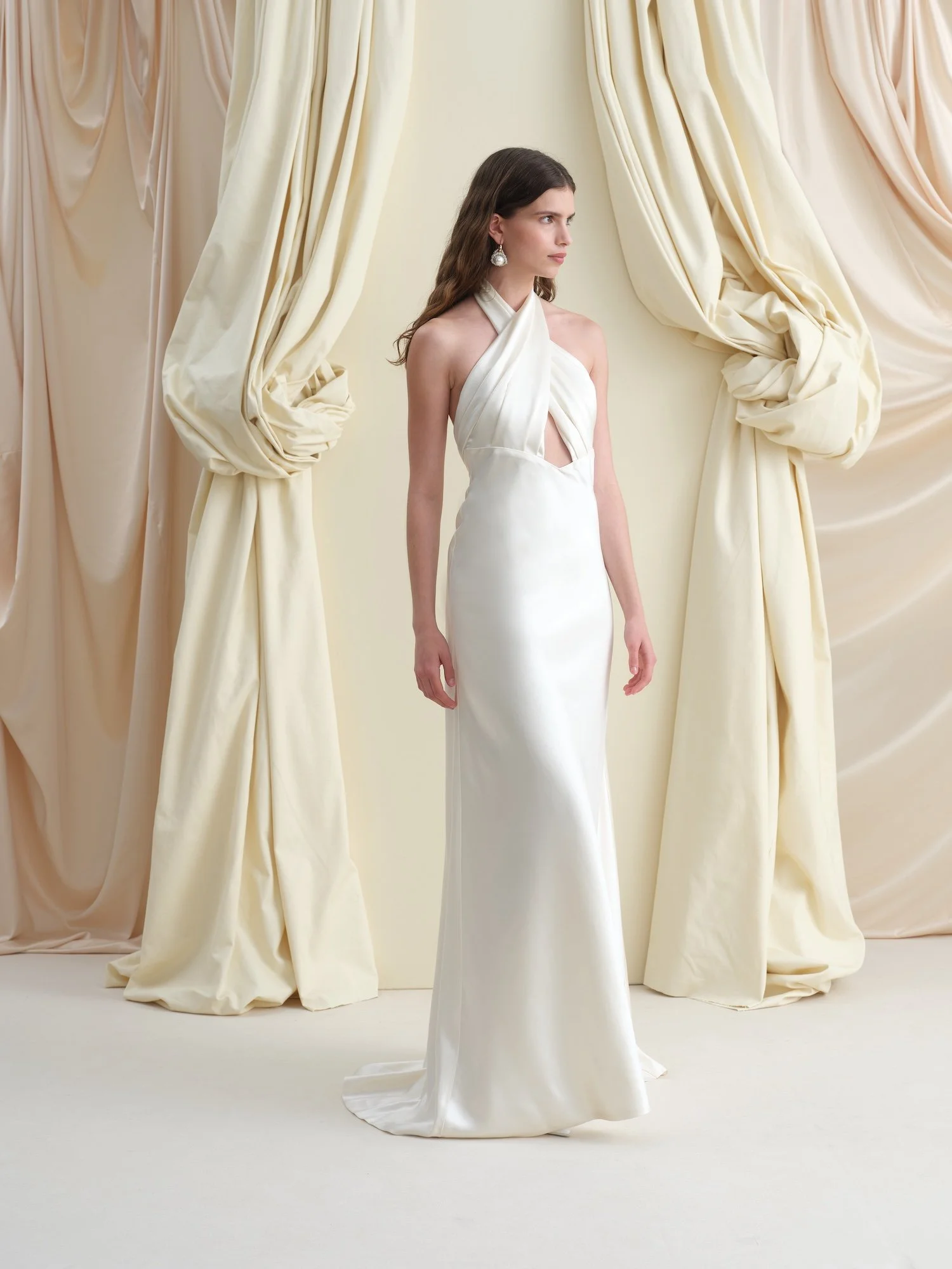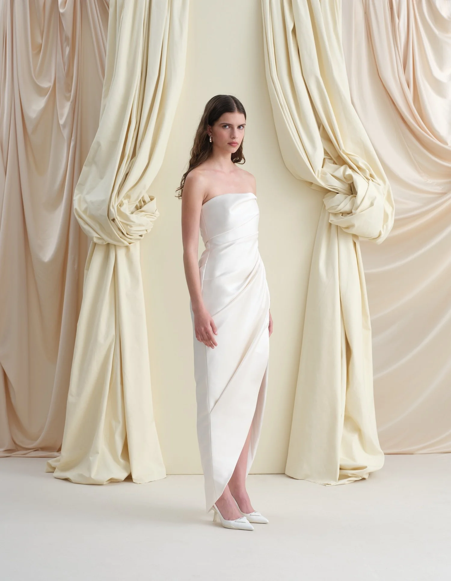 Капсула из подразделения Bridal 2026 — это размышление о вневременной красоте. Коллекция виртуозно играет на контрастах структуры и пластики. Жесткий, скульптурный корсаж неожиданно и плавно растворяется в струящемся атласе, скроенном по косой. Драпировки ниспадают, словно жидкий шелк, подчеркивая женственность силуэта. Четкие минималистичные линии смягчаются нежными кружевными акцентами — изящными и воздушными.
