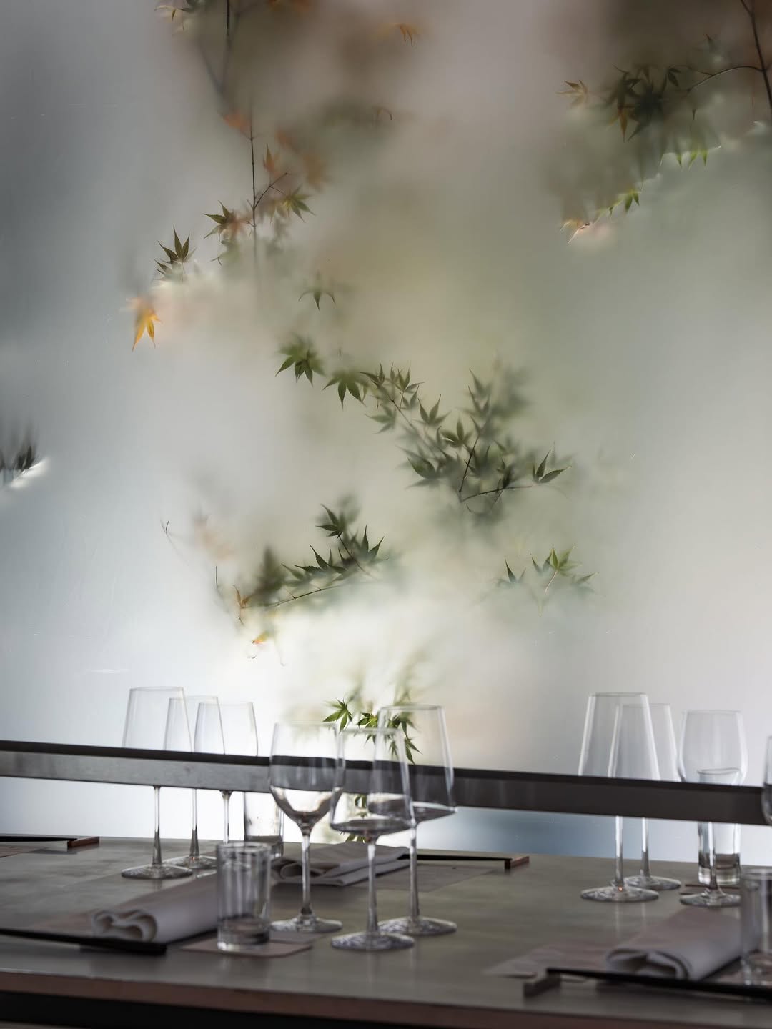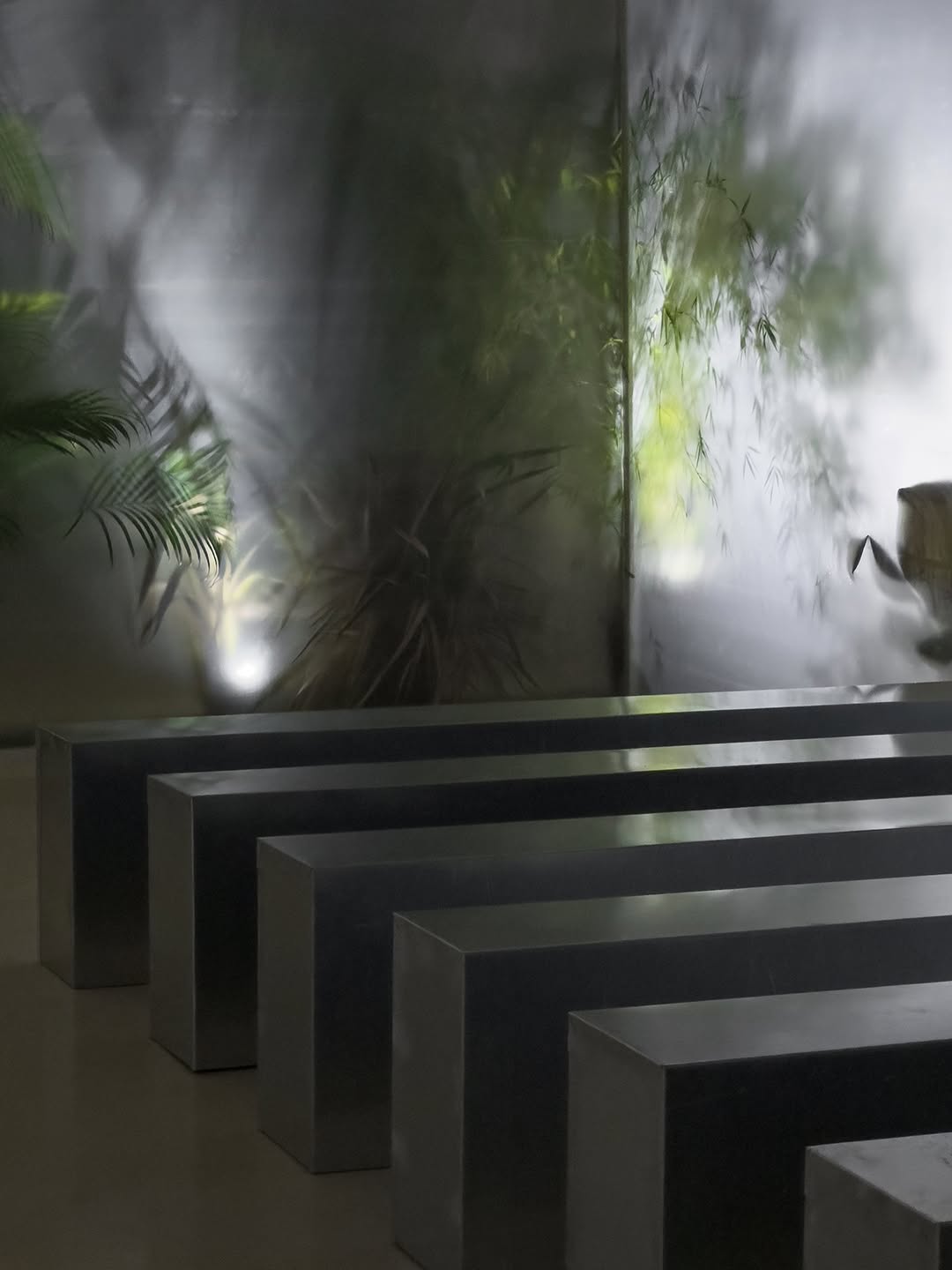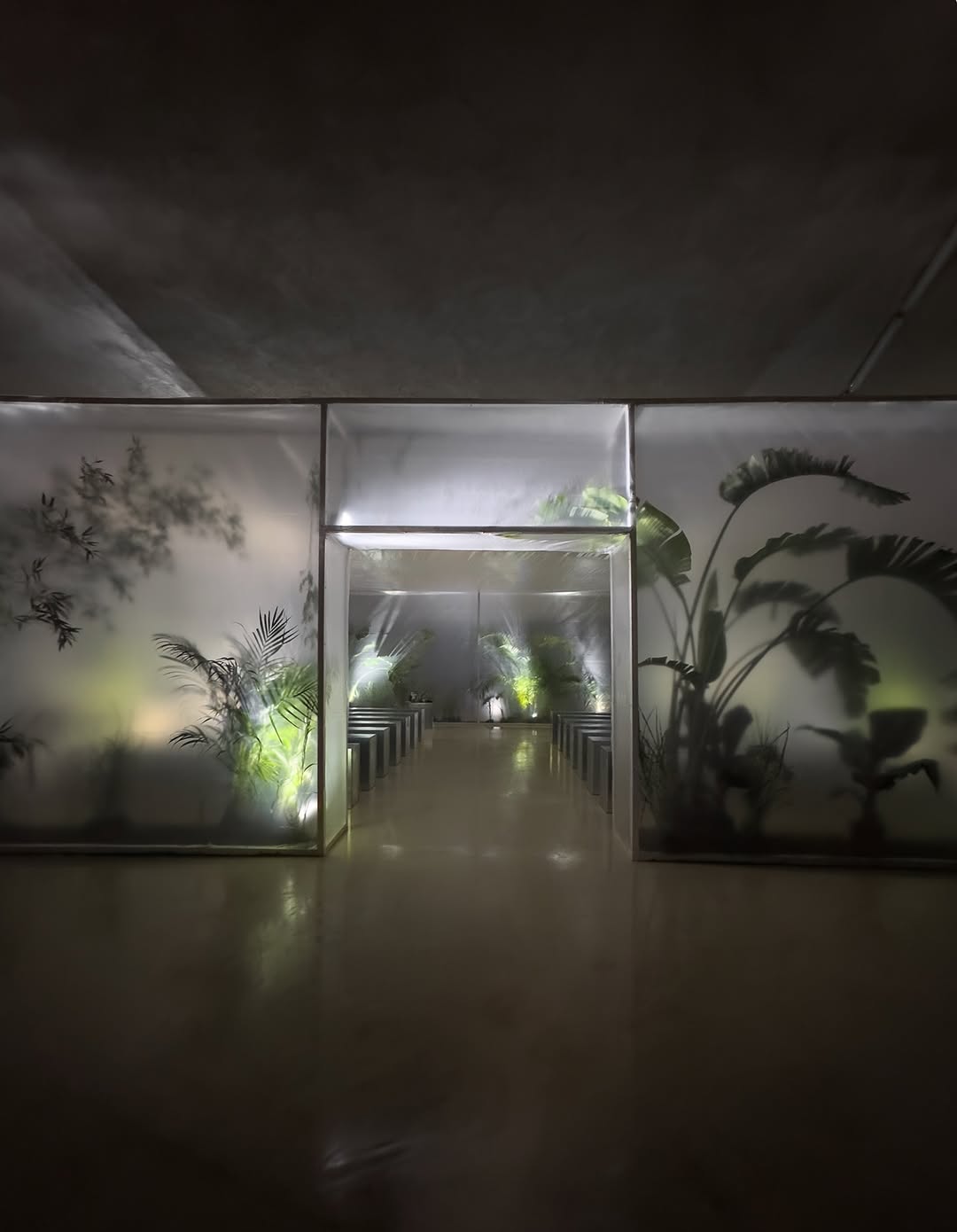 Полупрозрачное стекло создает парниковый эффект, оставляя лишь силуэты и тени растений. Использование подсветки, в свою очередь, рождает игру теней. Все это добавляет пространству таинственности и объема.