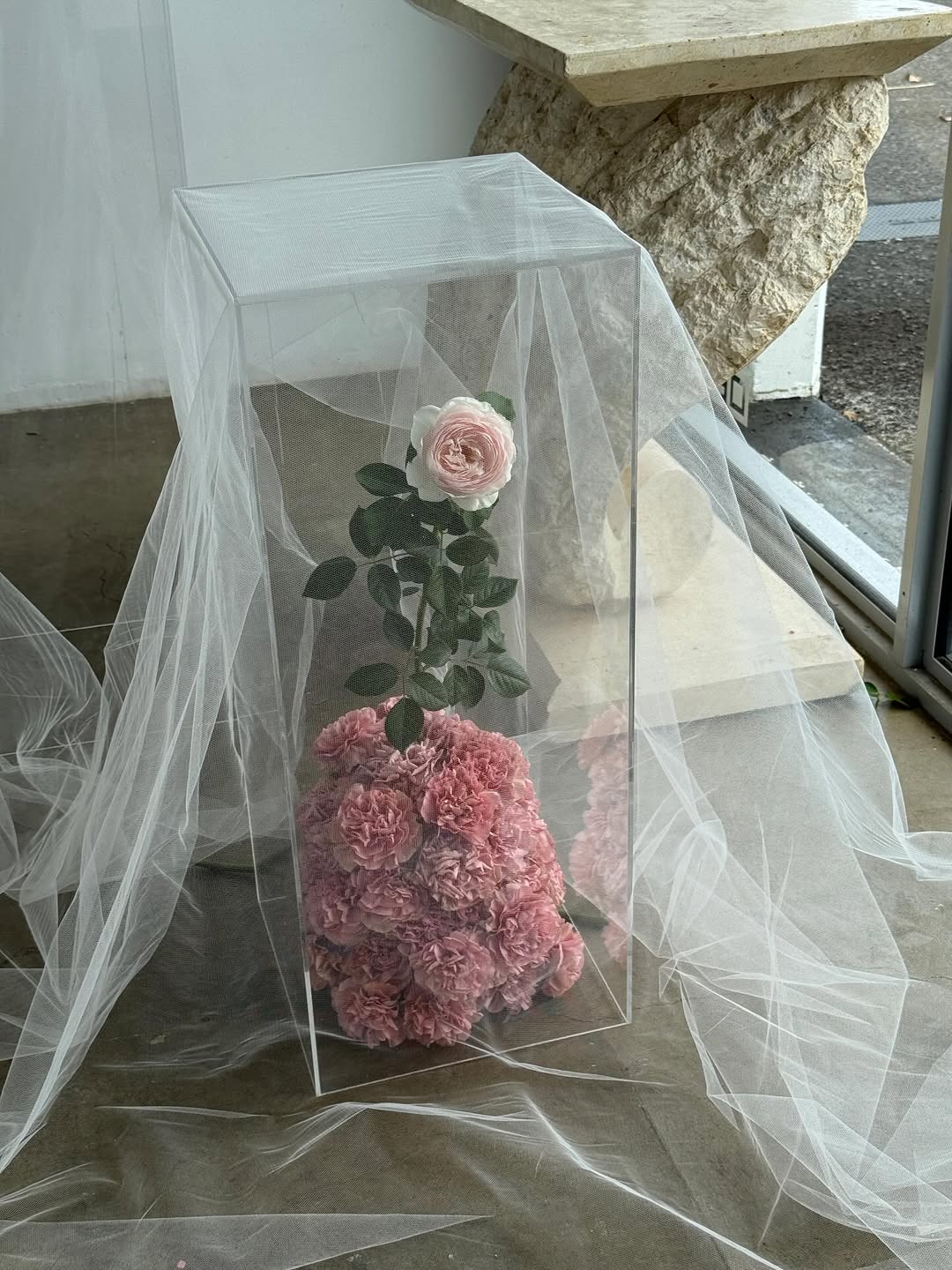 В свадебном и ивент-декоре флористика все чаще выходит за рамки привычных форм. В 2026 году декораторы экспериментируют со стеклом. Цветочные композиции и растения могут быть открыты взгляду или восприниматься через полупрозрачную поверхность — оба приема работают внутри одного тренда, создавая визуальные эффекты.