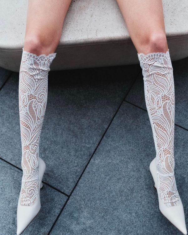 В случае с платьем длины мини кружевные гольфы смотрятся смело и экстравагантно. Более утонченный вариант — сочетание с платьем в пол. В тот момент, когда невеста приподнимает подол, чтобы сделать шаг, кружево едва заметно, но при этом красиво дополняет картину образа. Сочетайте такие гольфы с классическими лодочками на каблуке, балетками или мюлями.