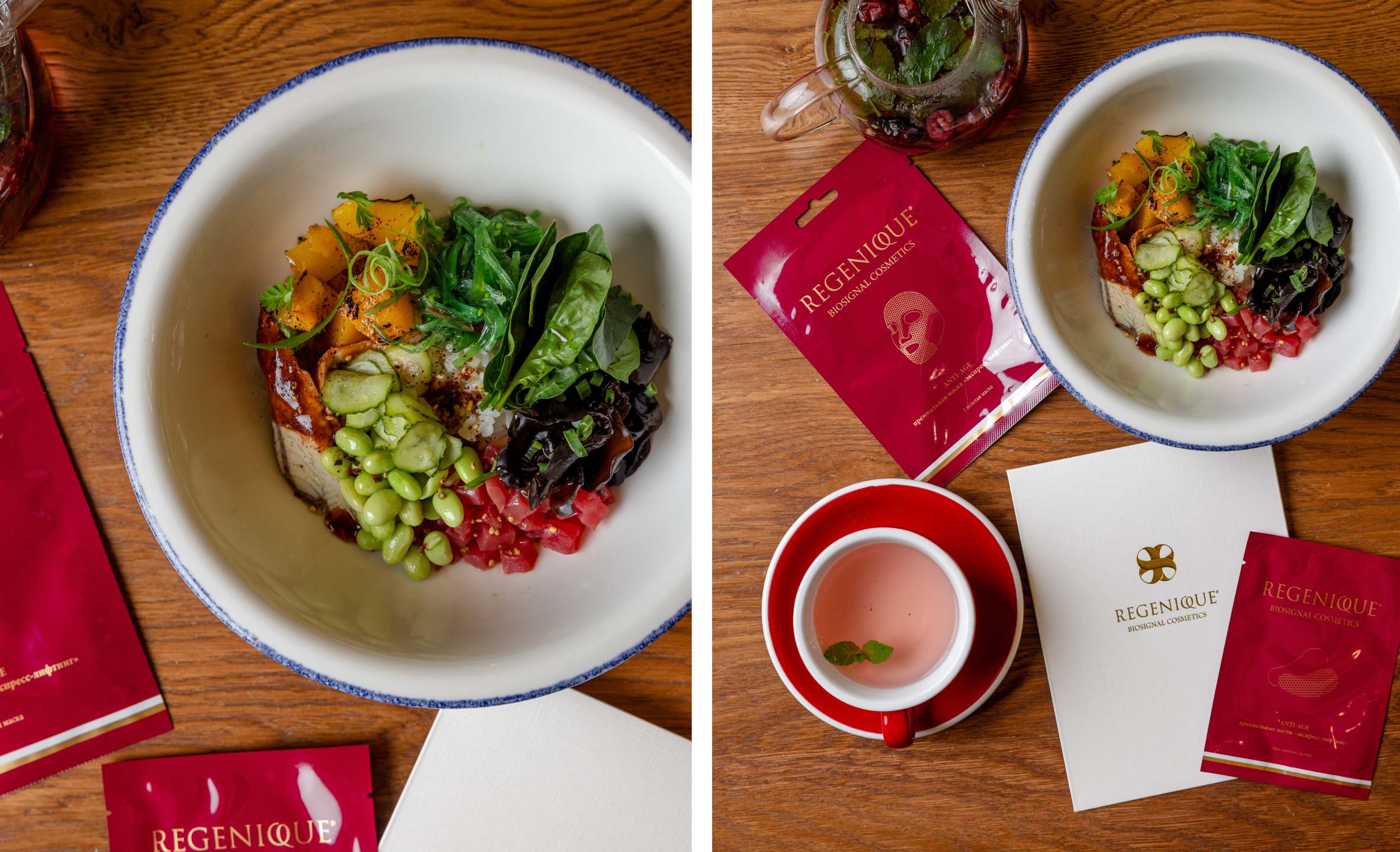 В ресторане Aquamarine (Лужнецкая наб., 24) стартует акция совместно с российским премиальным брендом космецевтики Regenique. На протяжении месяца в будет доступно специальное меню из двух позиций, заказывая которые гости получают подарки от бренда. Флагманом коллаборации стал боул с тунцом и угрем (1300 руб.) — сбалансированное блюдо с основой из риса, ферментированными и опаленными овощами, свежей зеленью, бобами и рыбой. С боулом гостям вручат 1 подарок: тканевую маску или патчи, пропитанные комплексом биосигнальных молекул (экзосом). Также в меню в рамках акции представлен горячий чай с шиповником, малиной и мятой.