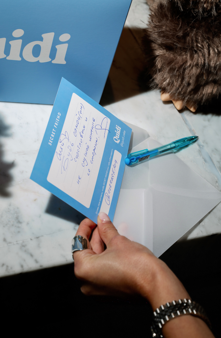 В кондитерский Quidi (Малая Бронная, 20) запустилась необычная акция Secret Friend. После заказа можно оставить пожелание для других гостей и взамен взять рукописное послание для себя. По желанию в конверт можно добавить подарок — оплатить любой десерт или напиток из меню, оставить свой номер или ник для обратной благодарности или знакомства. В конвертах также спрятаны подарки от кондитерской и ее сооснователя — инфлюенсера Дины Саевой.