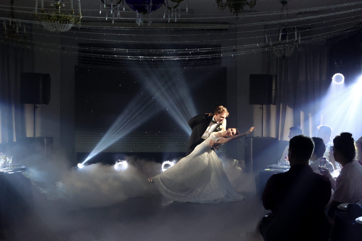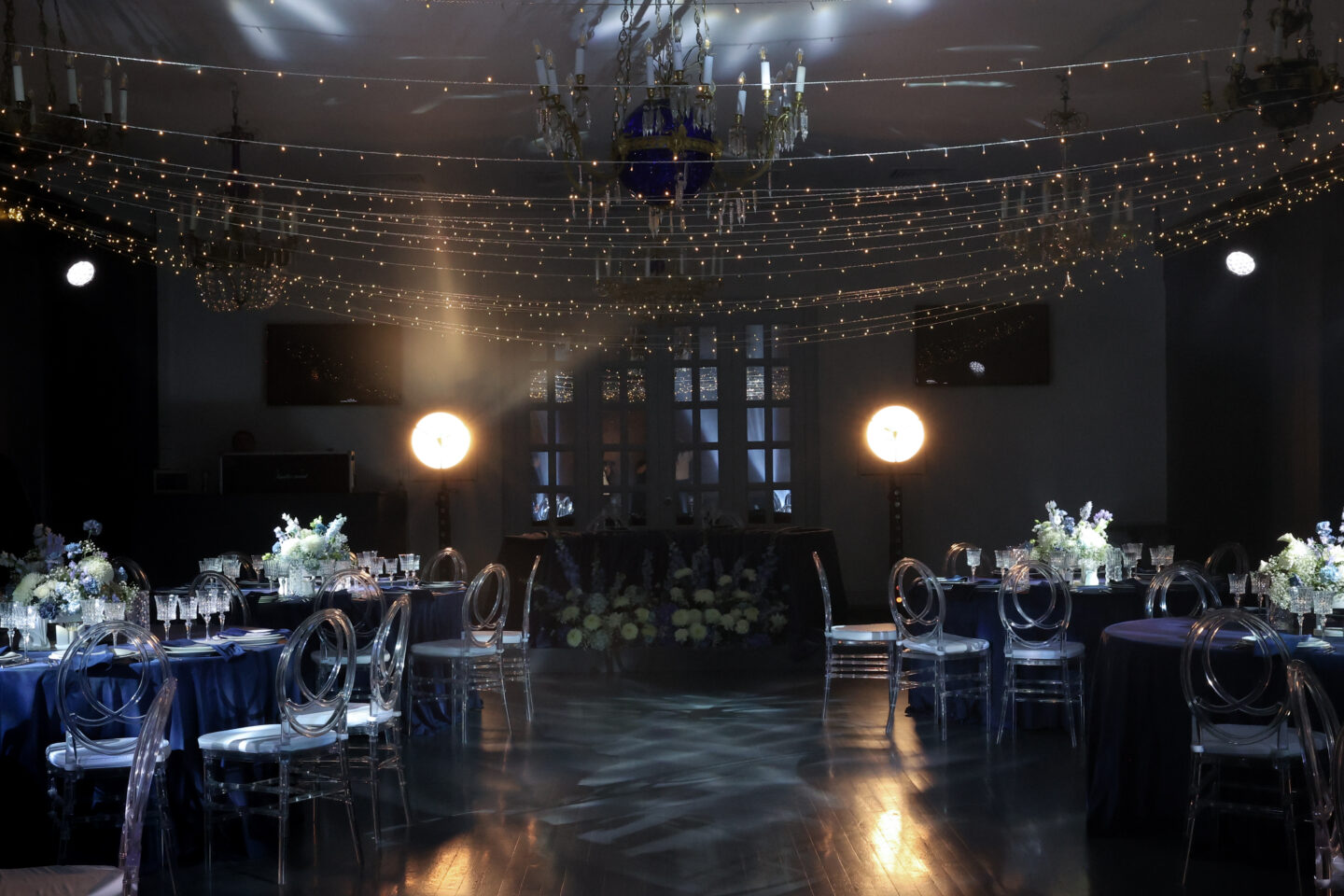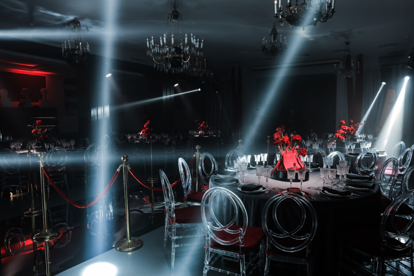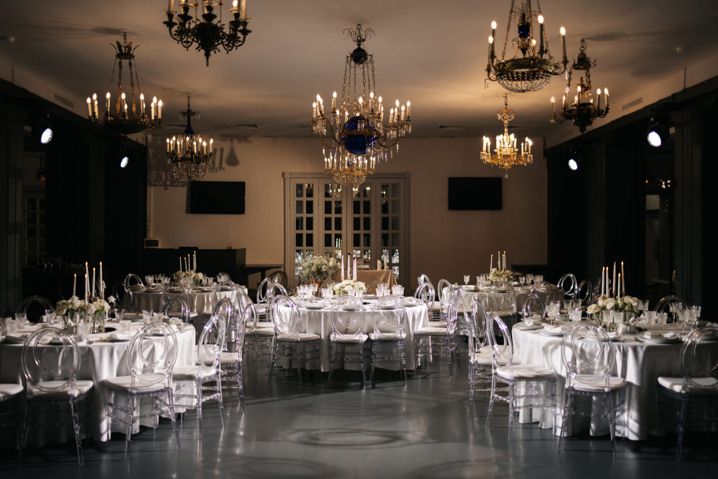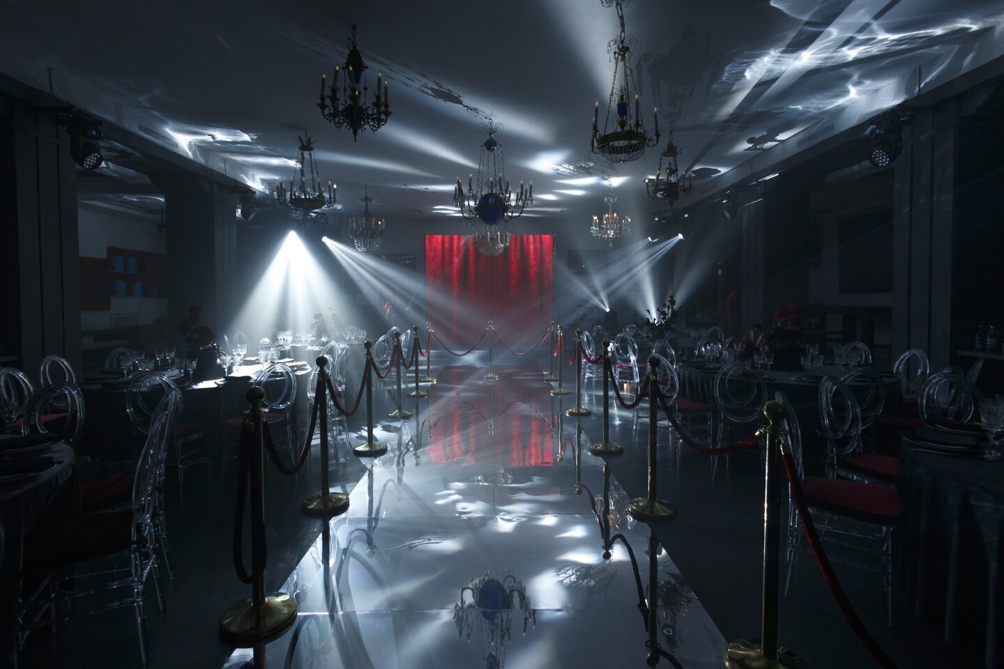 Интерьер выполнен в светло-серых тонах, что позволяет реализовать любую задумку. Изюминкой зала являются 10 антикарных люстр, украшающих потолок.