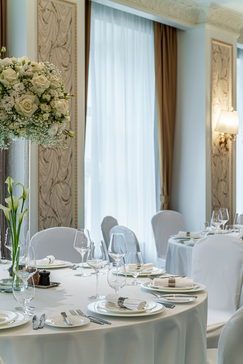 За величественным историческим фасадом отеля Lotte St. Petersburg скрывается банкетный зал «Пушкин», который становится идеальным местом для проведения камерной свадьбы. Он оформлен в классическом стиле: высокие потолки, светлые стены, утонченные детали. Здесь нет кричащей роскоши, только гармония и легкость, что делает зал универсальной сценой для свадебного торжества.
