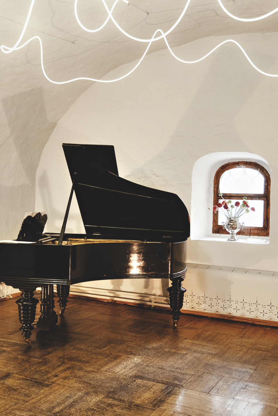При восстановлении и ремонте внутренних помещений основателям проекта было важно сохранить историческую ценность здания, но при этом наполнить его новыми, актуальными смыслами. Таким образом появились интерьеры, в которых веяния ушедших эпох перекликаются с предметами современного дизайна. Многие из них напрямую отсылают к ткацкому прошлому здания — например, напоминающие скатерти экраны для батарей или люстра, созданная из километра зеленой нити.