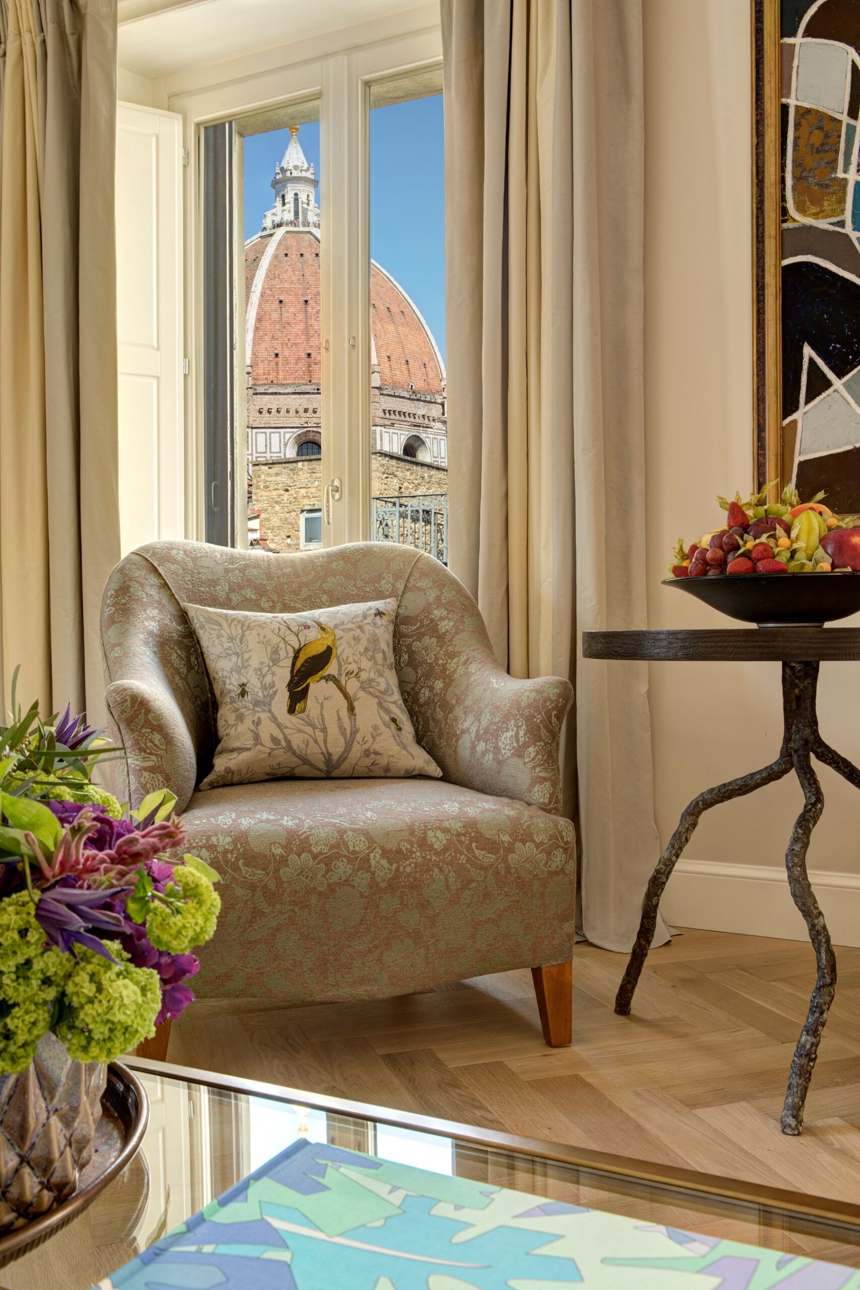 Интерьеры, созданные Ольгой Полицци совместно с модным домом Emilio Pucci, излучают утонченную энергию древнего города: мрамор, паркет, авторская мебель и акценты яркого итальянского декора. Из семидесяти девяти номеров и люксов открываются виды на Дуомо и старинные улицы, а для романтики с настоящим размахом подойдет роскошный Duomo Presidential Suite площадью 152 м².