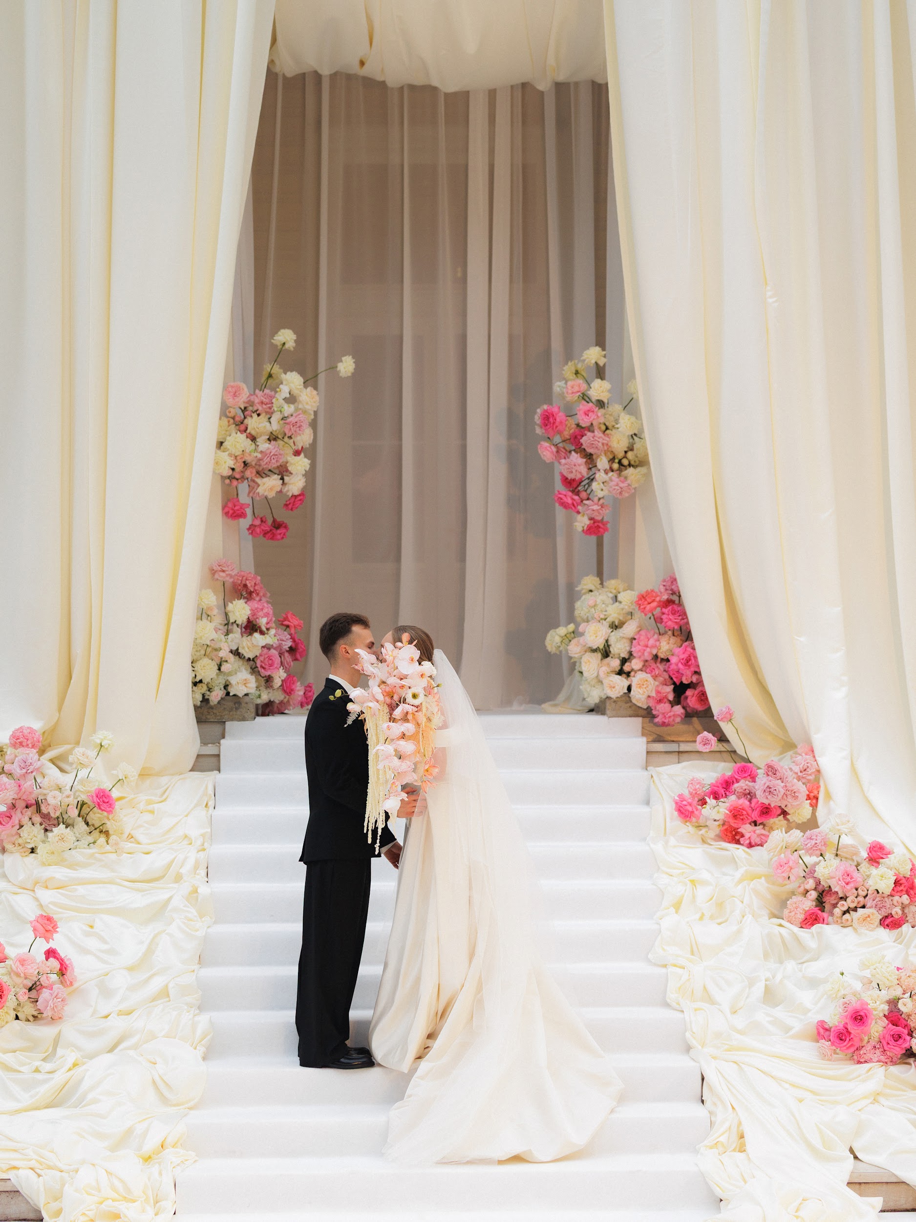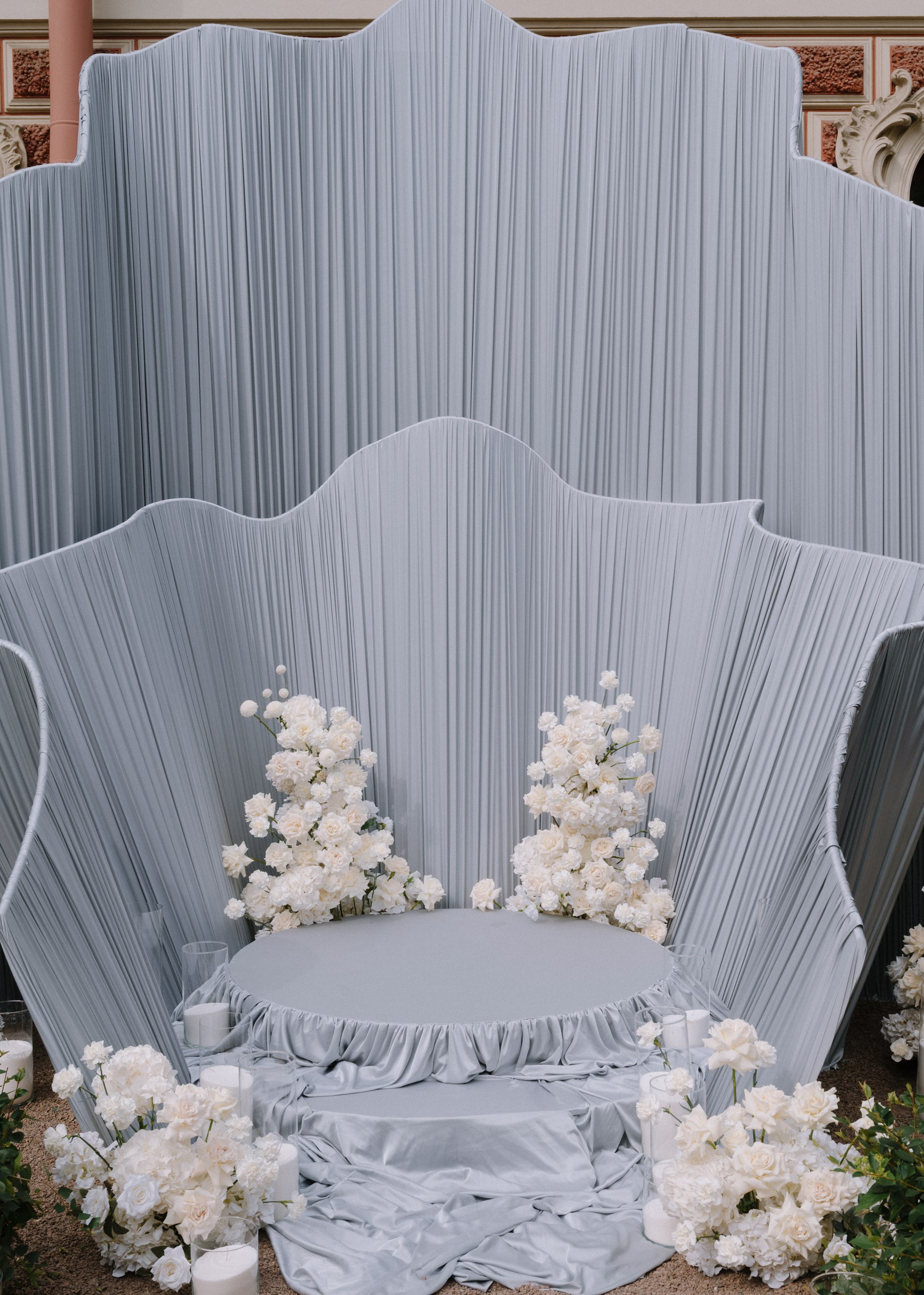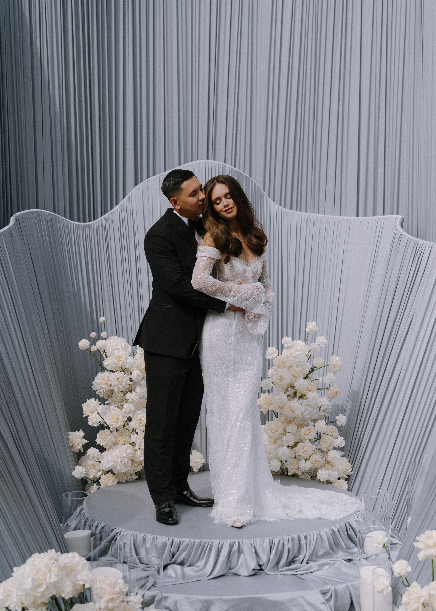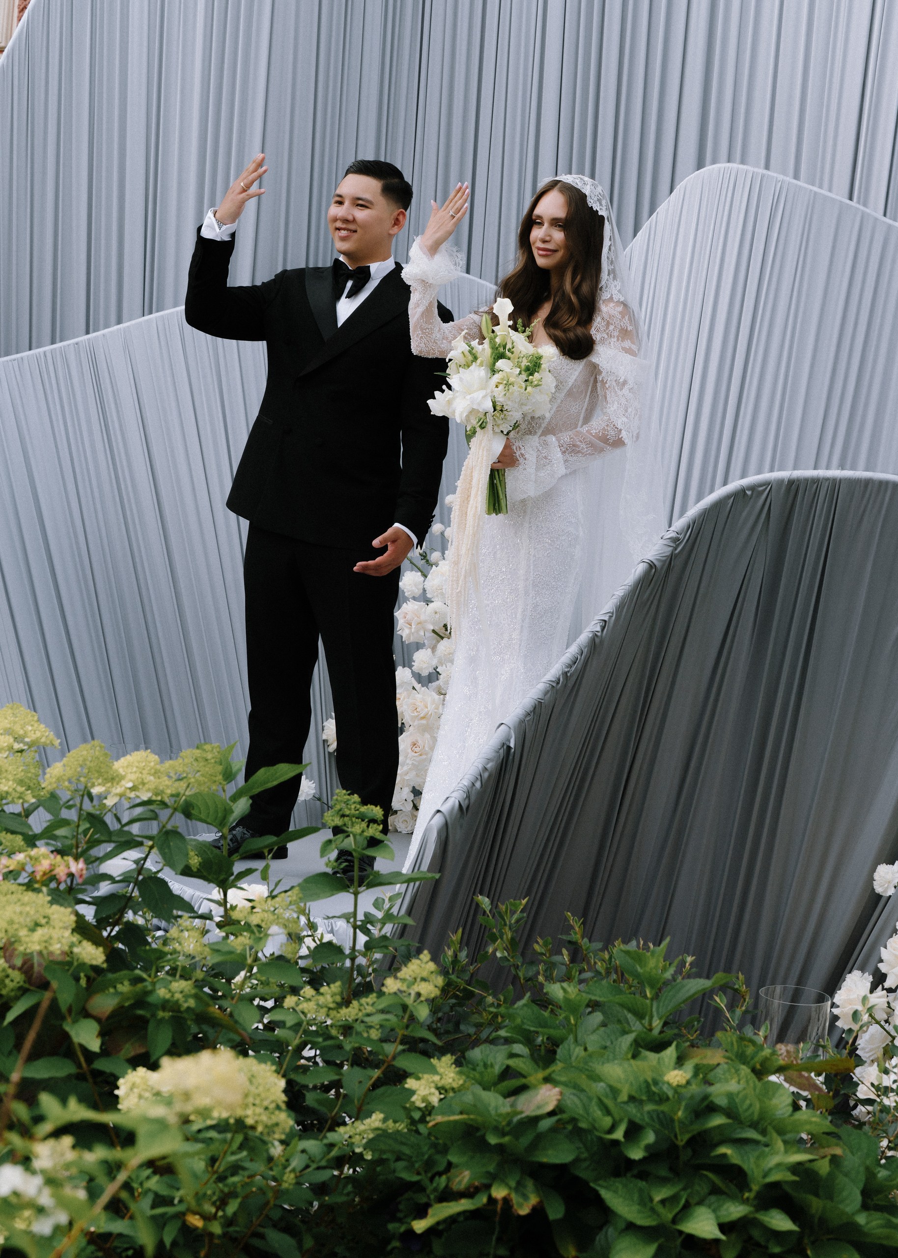 Вдохновившись соединением двух богатых культур нашей пары — русской и китайской, мы выстроили пространство таким образом, чтобы деликатно отразить обе традиции. Внутри передали атмосферу Петербурга, а снаружи погрузили гостей в китайскую философию гармонии моря и цветка, которую выразили в визуальном решении церемонии.