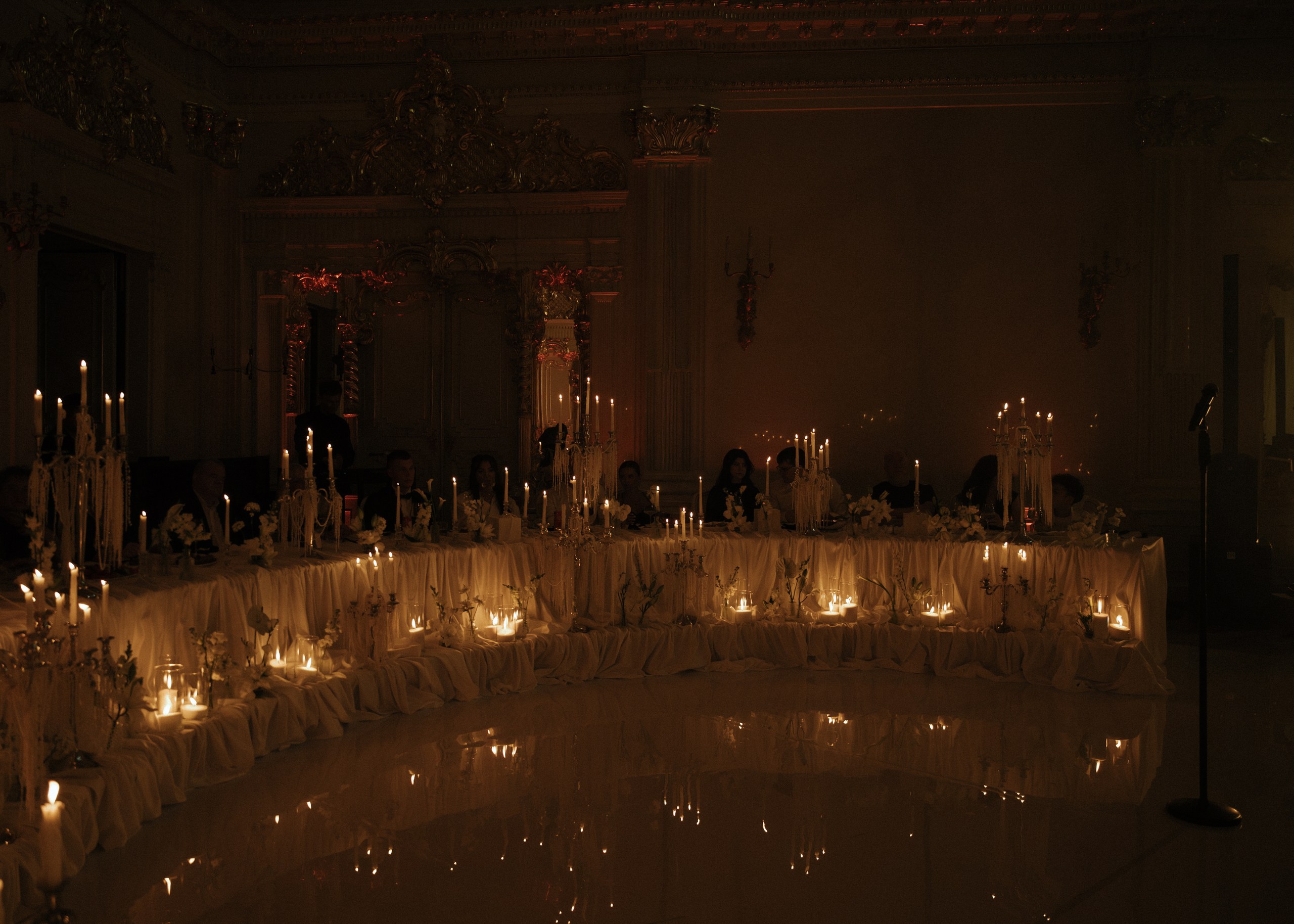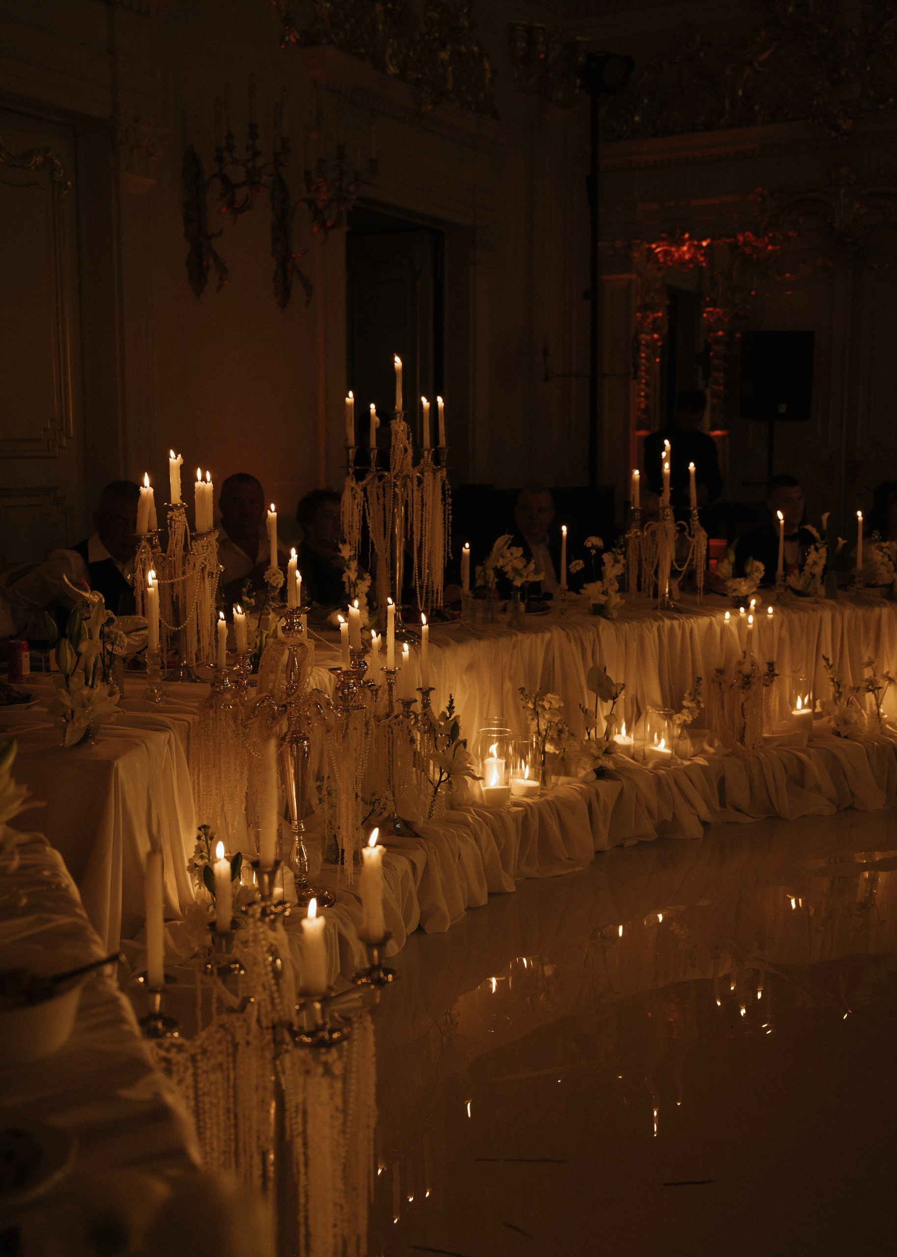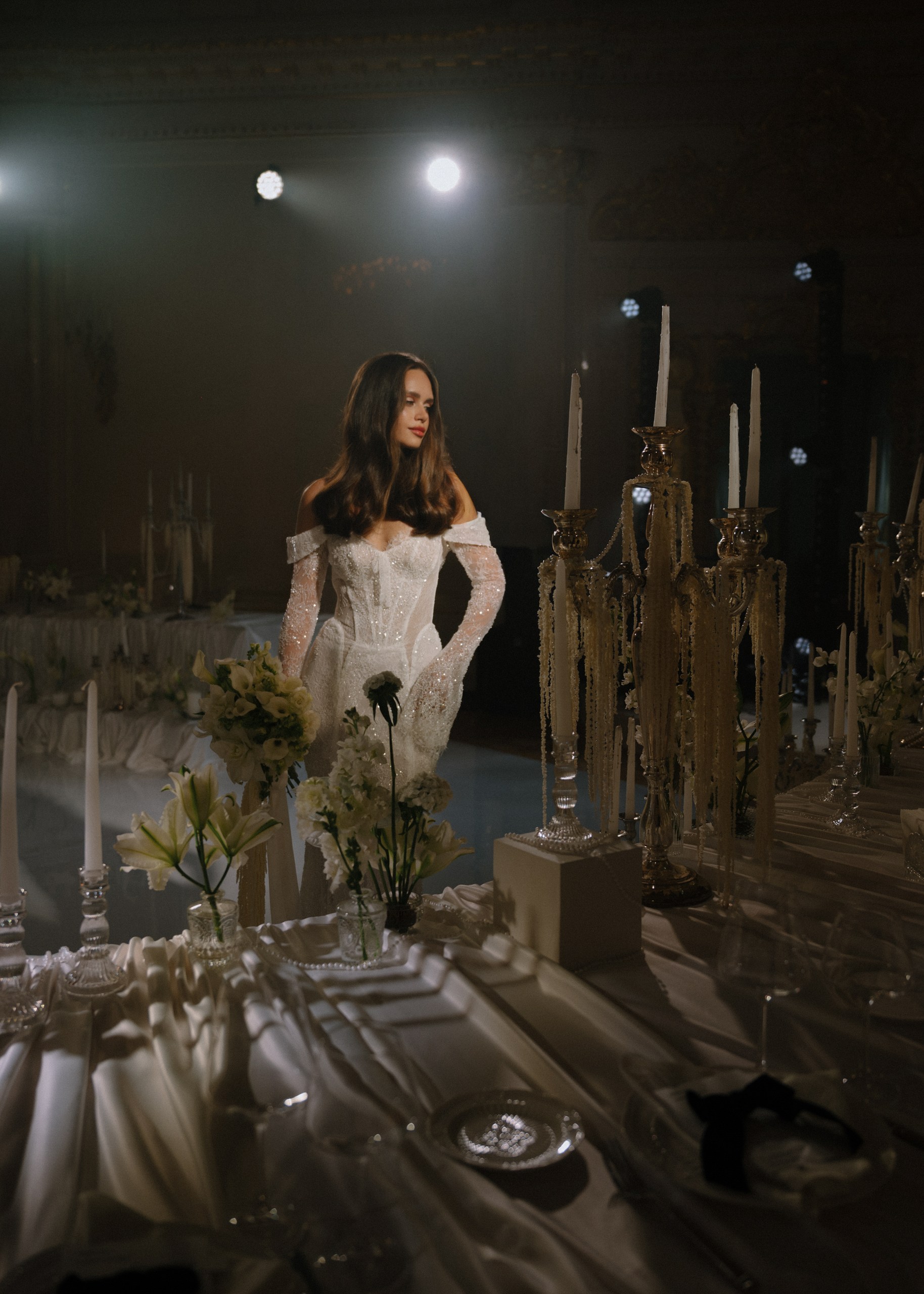 Мы придумали не просто стол, а центр притяжения. Круглая форма была выбрана не случайно: она символизирует бесконечность, равенство и объединение двух семей в одно целое. Здесь царит атмосфера уюта, которую мы усилили множеством свечей и канделябрами.