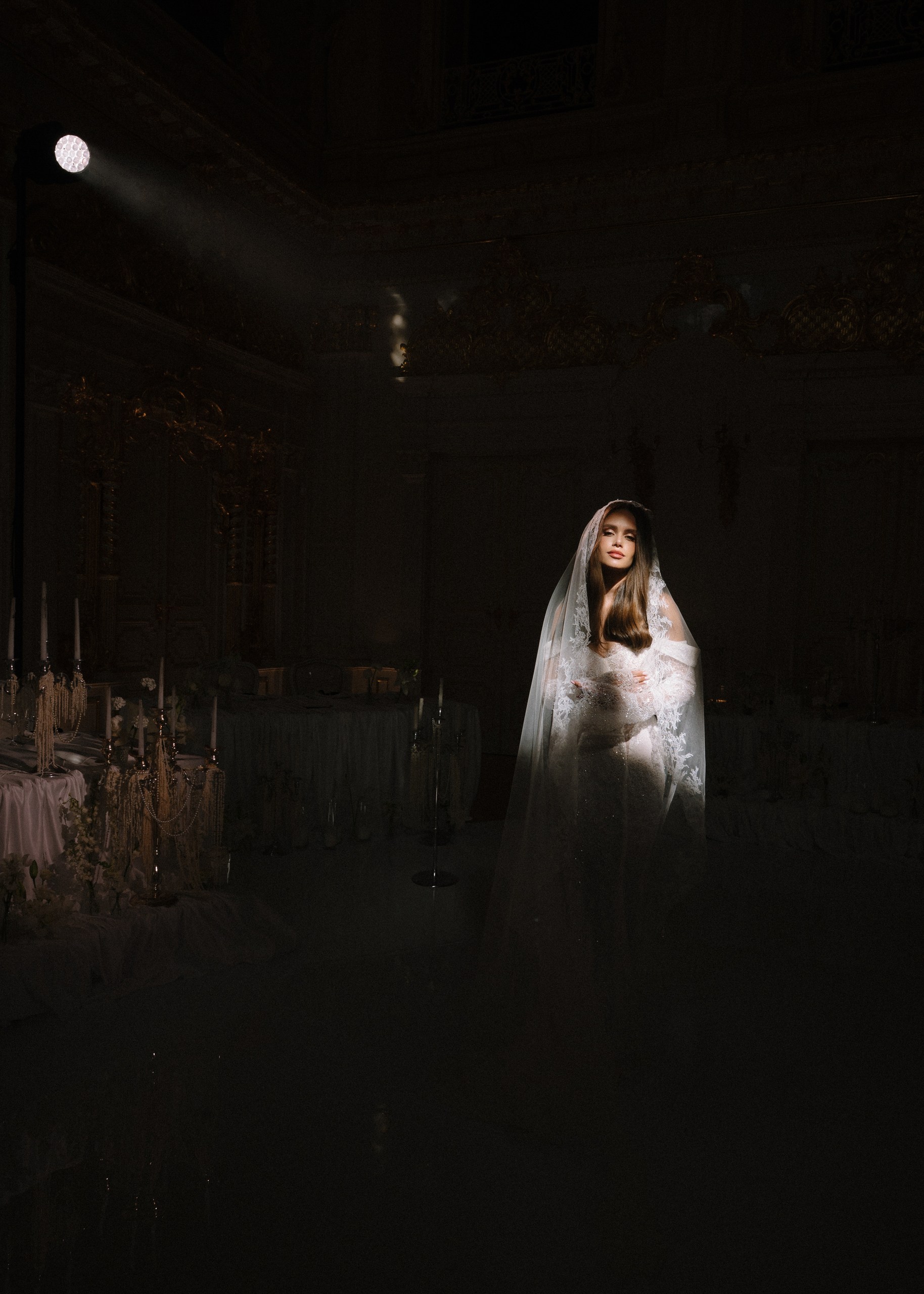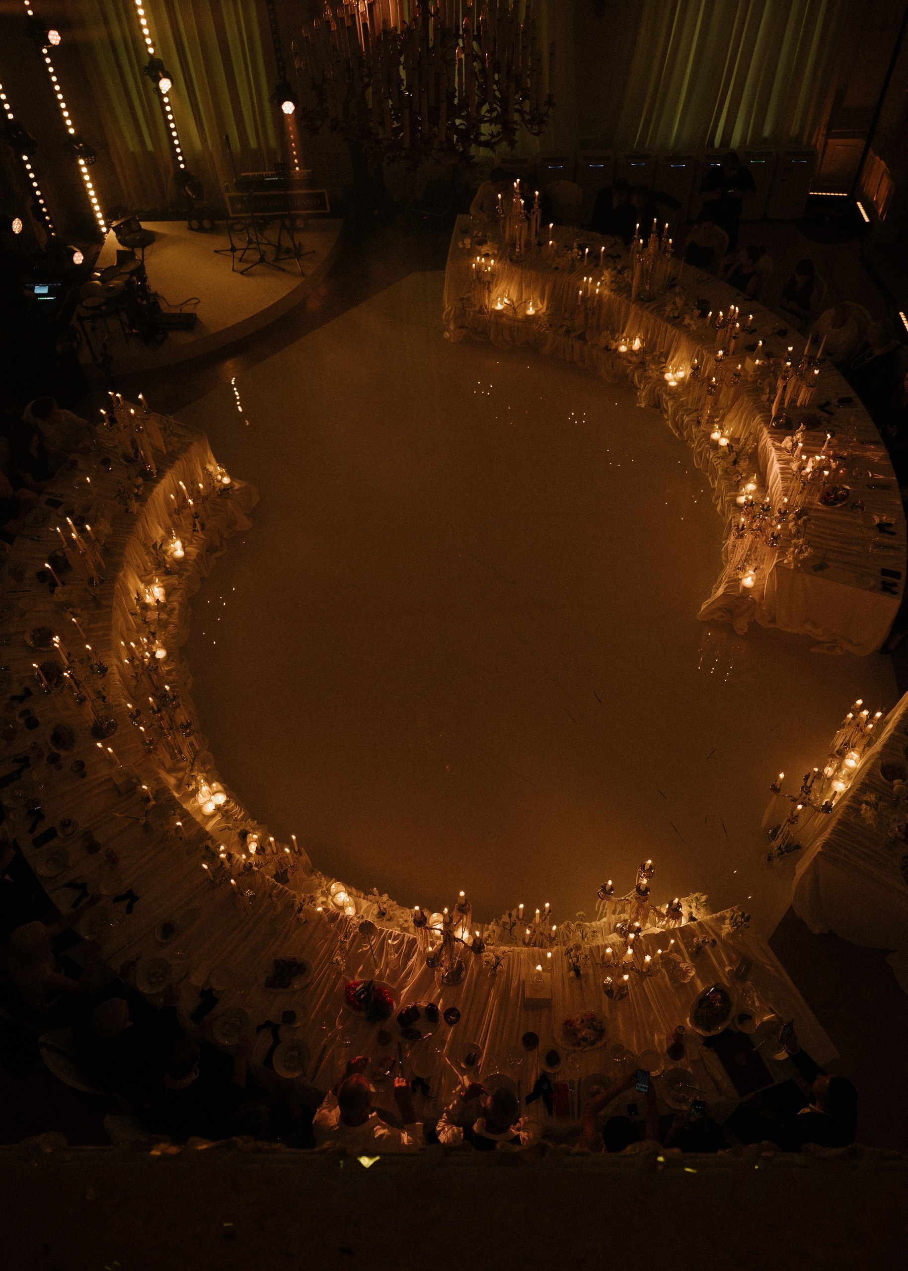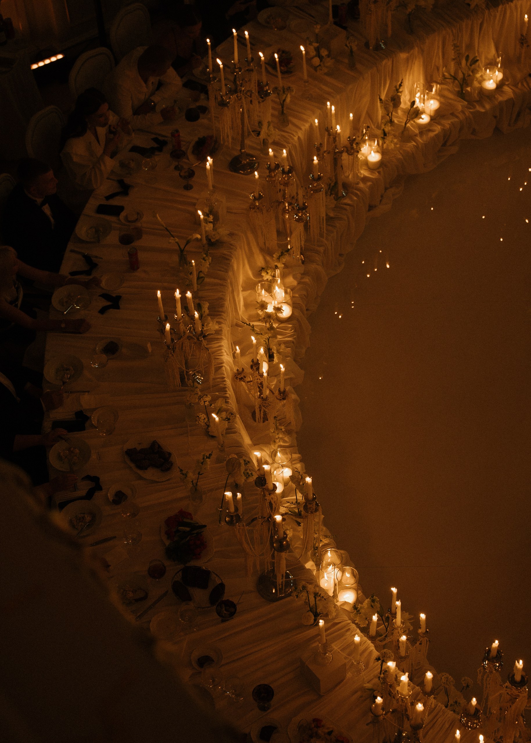 Мы придумали не просто стол, а центр притяжения. Круглая форма была выбрана не случайно: она символизирует бесконечность, равенство и объединение двух семей в одно целое. Здесь царит атмосфера уюта, которую мы усилили множеством свечей и канделябрами.
