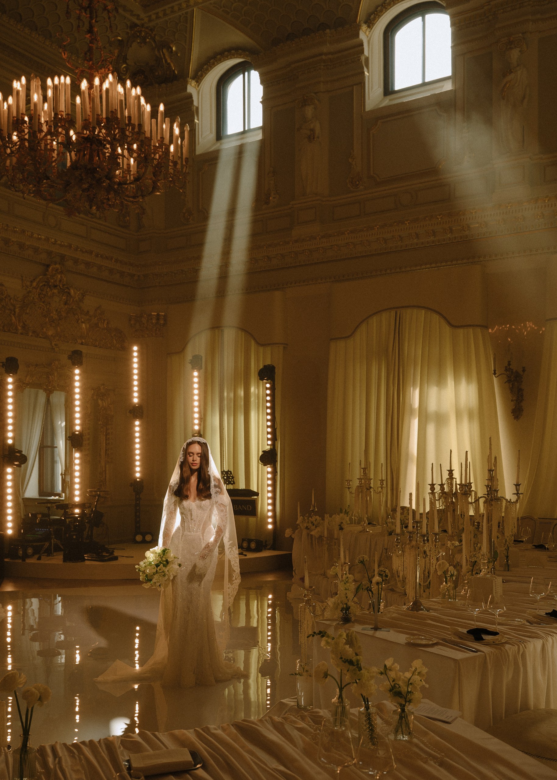Двухдневный монтаж декора, а также репетиции двух групп и артиста проходили накануне свадьбы, ввиду ограничения времени на подготовку. Пропускная система дворца имеет свои особенности: в критические моменты ключевые подрядчики получали отказ в доступе, что требовало от нас мгновенной перегруппировки сил и личного вмешательства на всех уровнях управления. Несмотря на все сложности, мы доказали, что можем создать красивую сказку для пары, оставив все сложности за кулисами.