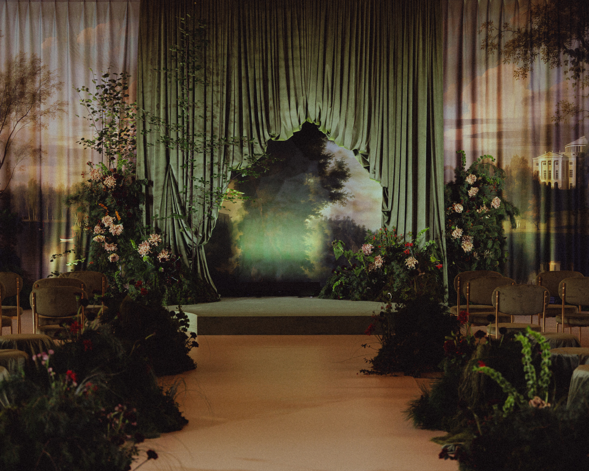 Зона церемонии. Образ Павловска стал центральным мотивом свадьбы. В зоне церемонии мы разместили объединенный диптих Семена Щедрина, который сегодня хранится в Павловском дворце. Важной частью вдохновения выступили и павловские смешанные леса с их мягкими природными ландшафтами.