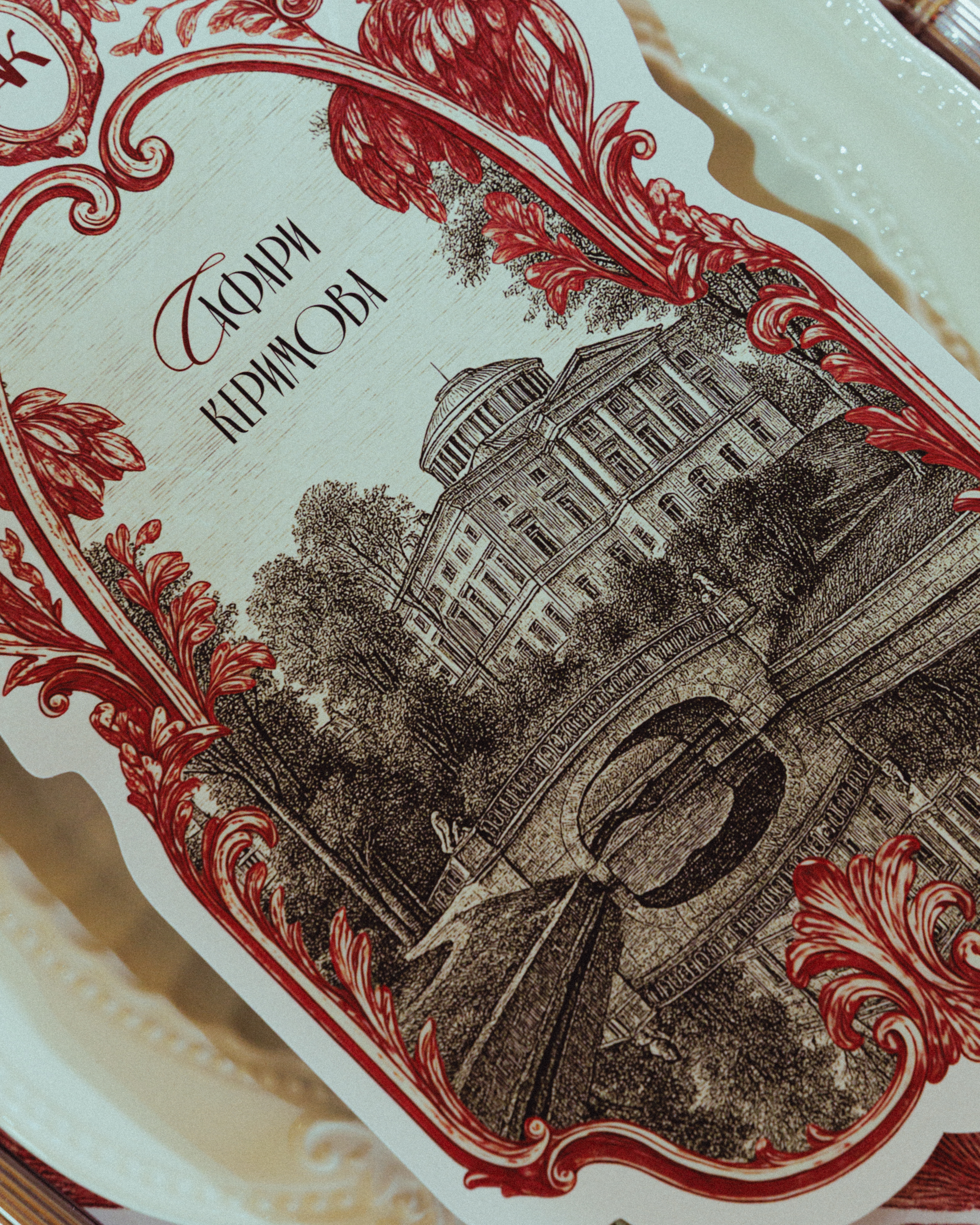 Зона ужина. На президиуме разместили репродукцию полотна Алексея Волоскова. В основе колористики — насыщенная контрастная гамма русской пейзажной живописи: зеленый, бордовый, оранжевый. Ужин начался с меню и карточки рассадки с гравюрой Павловского собора, а при смене блюд гостям открывалась еще одна «пасхалка» сервировочная салфетка с изображением вдохновляющего вида на собор Святого Петра.