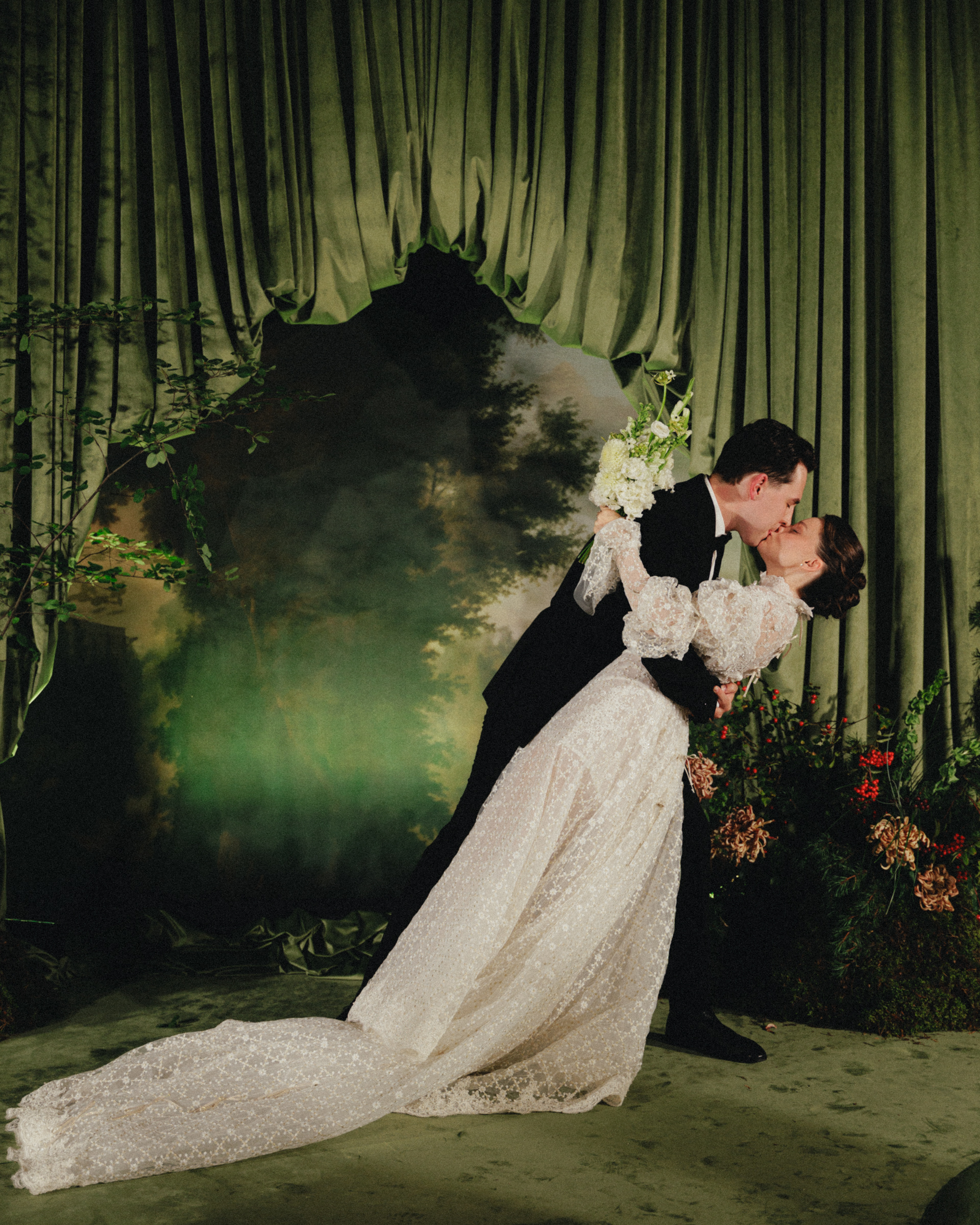 Этот мотив проявился и во флористике, где команда воссоздала ощущение «лесной глубины». Переосмыслили композицию картины: в оригинале полотна разделены, но для свадебной церемонии их объединили в одно полотно. Центральная — сосна, озеро и вид на дворец — символизировала союз Арсения и Ксении, а боковые части с пейзажами — их родные места и историю знакомства.