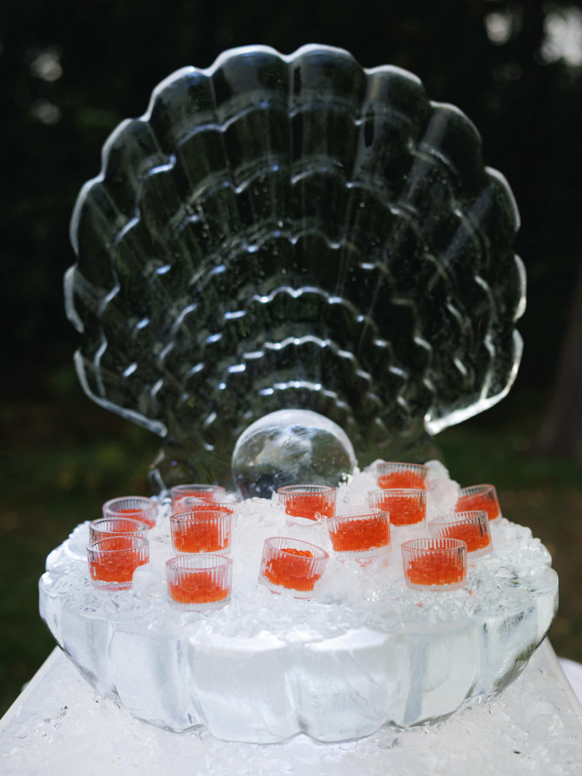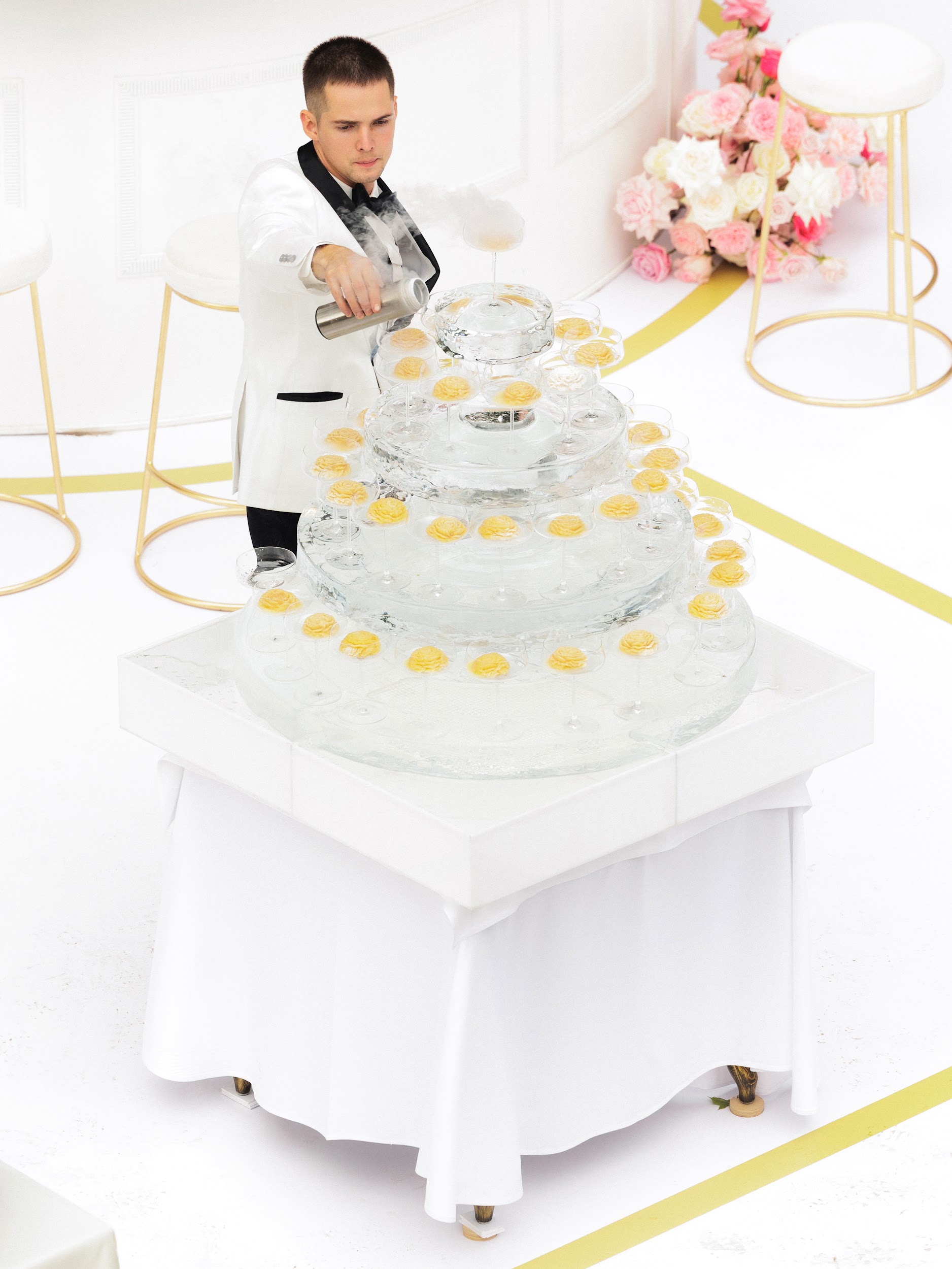 Лаундж-зона. Ледяные объекты стали важными элементами свадьбы. Кроме того, мы изготовили эксклюзивные шары из папье-маше в стиле бренда. В центре зоны разместили круглую барную стойку, где каждый гость мог насладиться напитком. Разработали эксклюзивную коктейльную карту с особенным акцентом — фотографиями пары в кубиках льда. Этот изящный штрих превращал каждый бокал в персональный арт-объект.