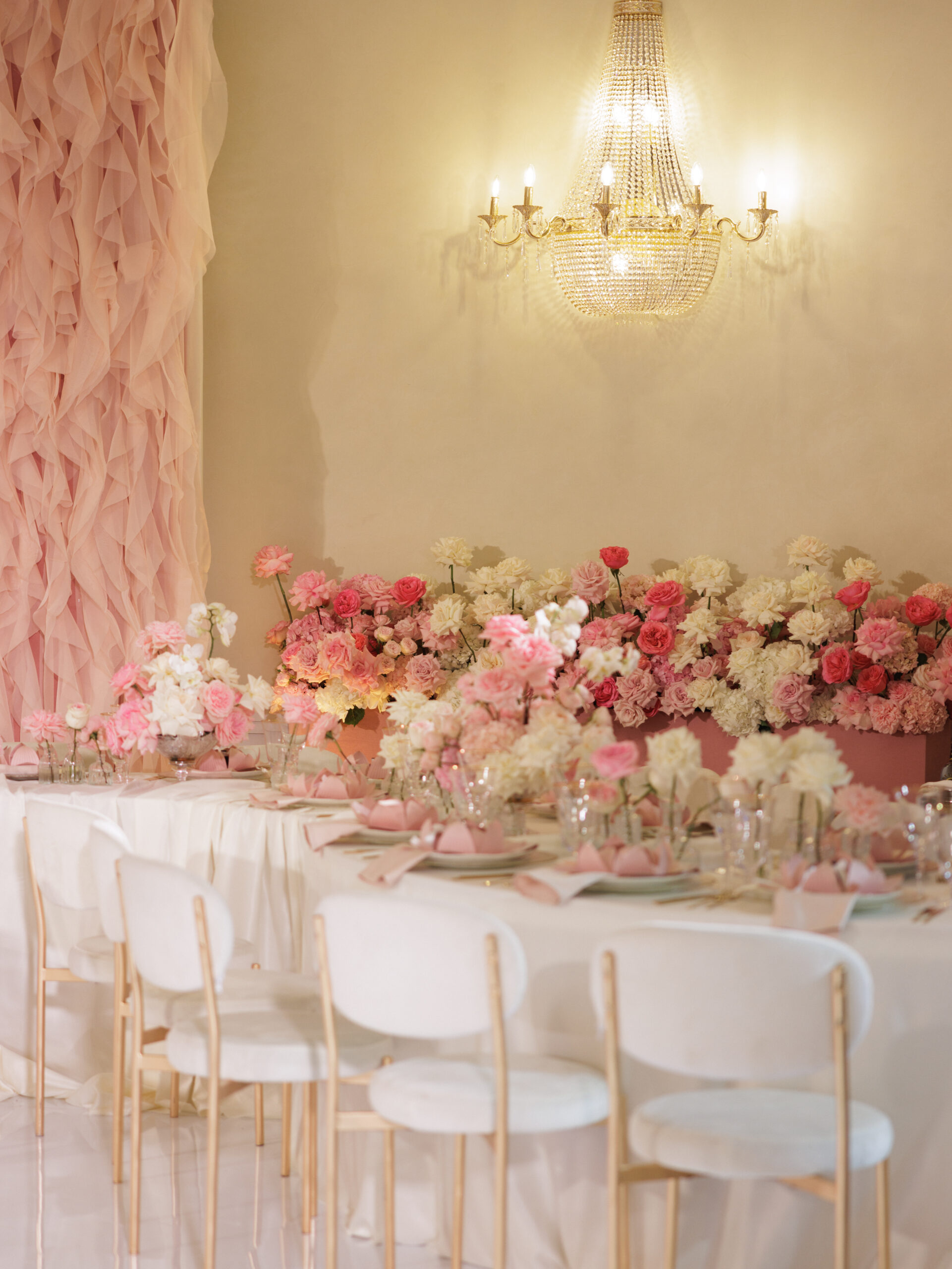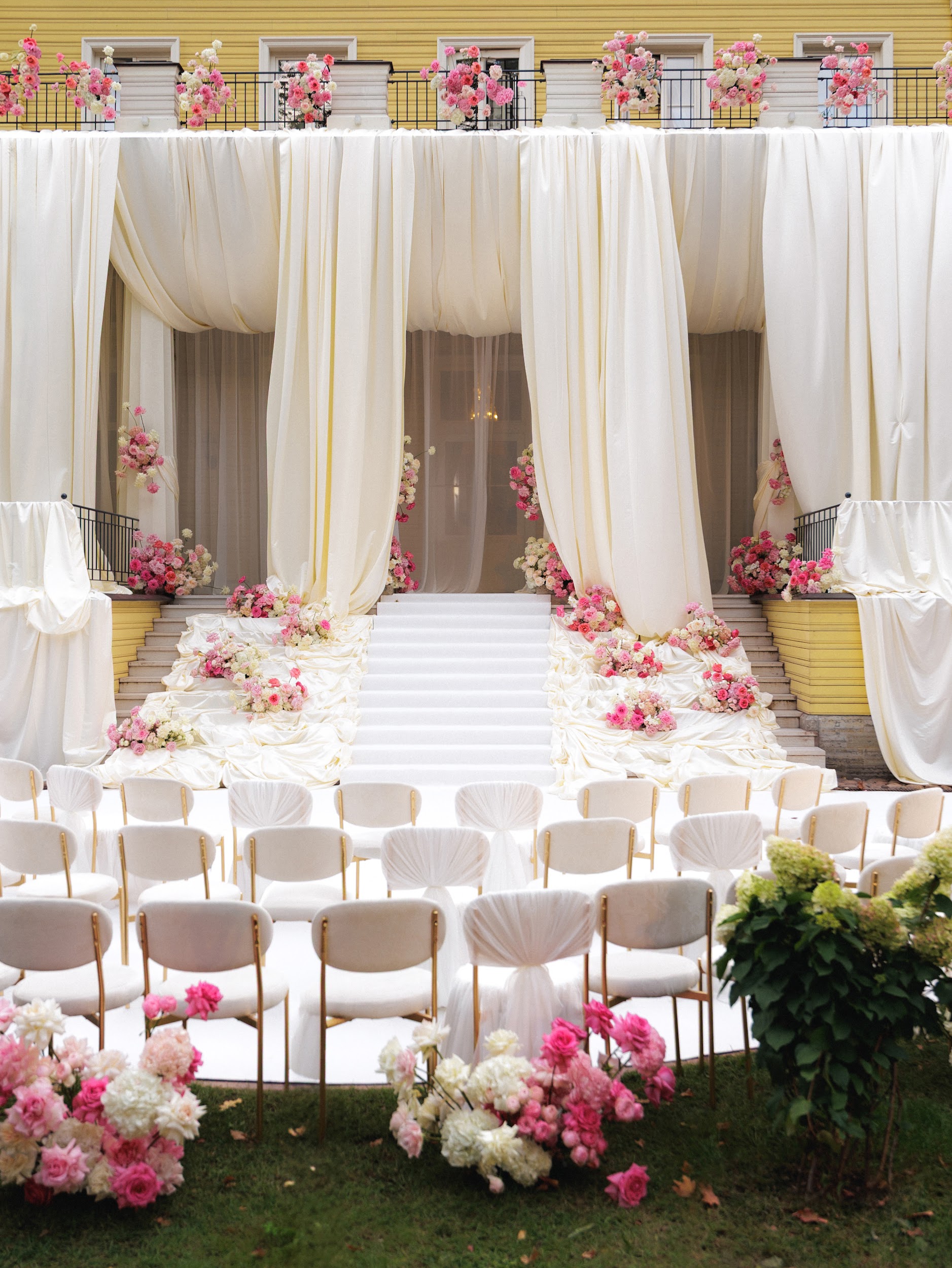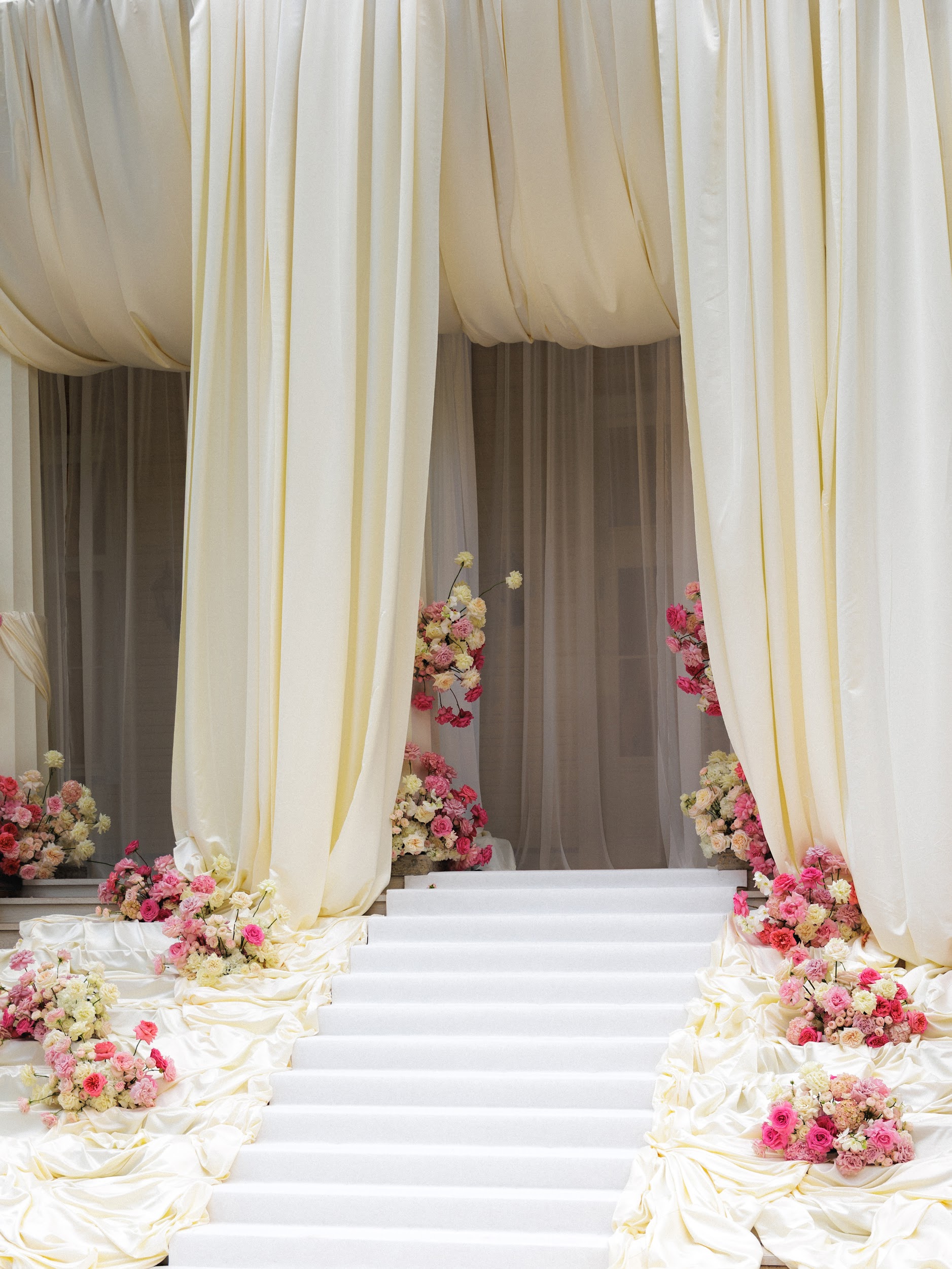 Зона церемонии. Для ее оформления было использовано 1000 метров ткани и 50 000 роз, потребовалось 24 часа монтажа.