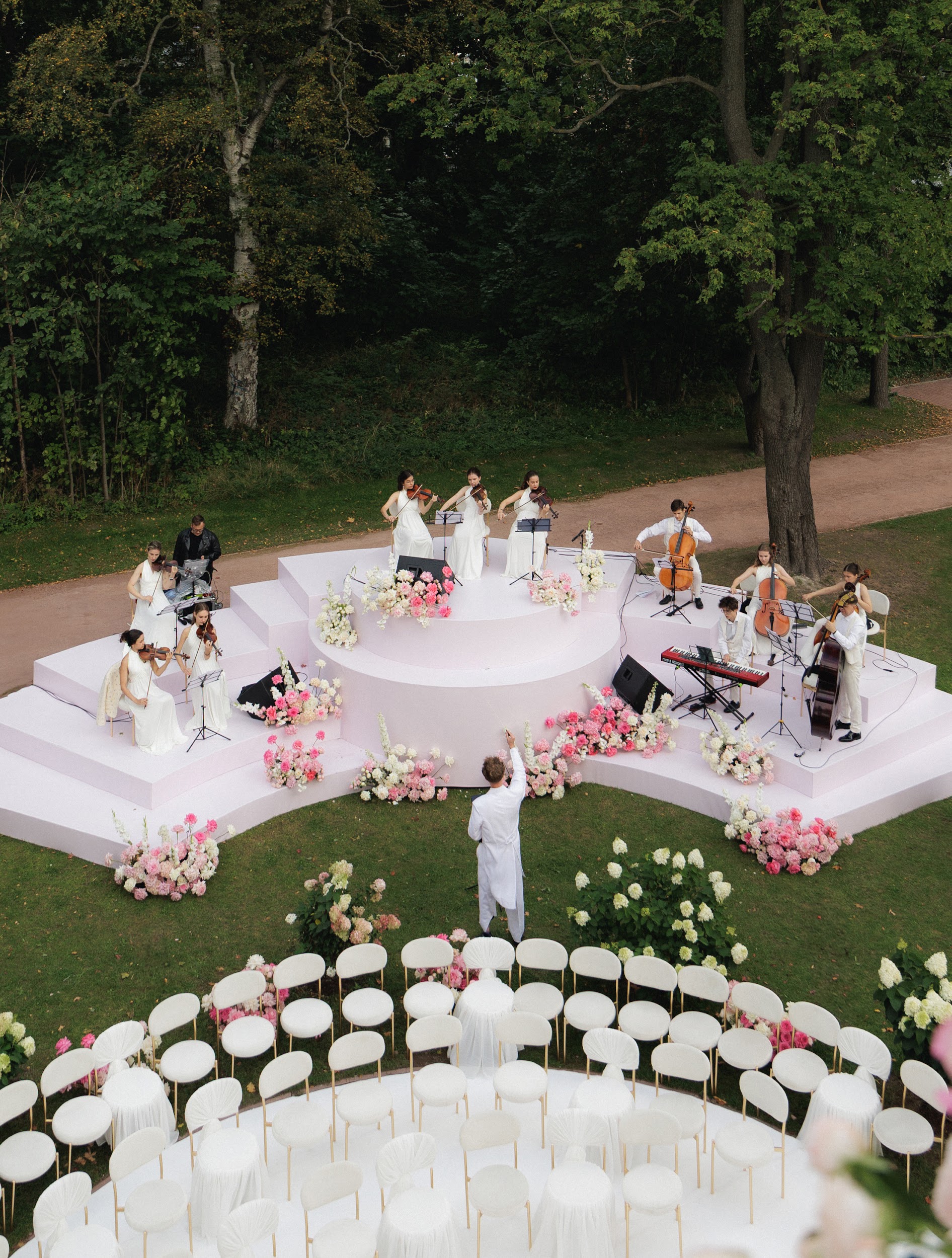 Зона с оркестром. Мы разработали и реализовали проект многоярусного подиума, объединившего эстетику и функциональность. Конструкция была создана специально для размещения оркестра, который сопровождал церемонию и создавал атмосферу во время фуршета, играя саундтреки из рекламы Dior.