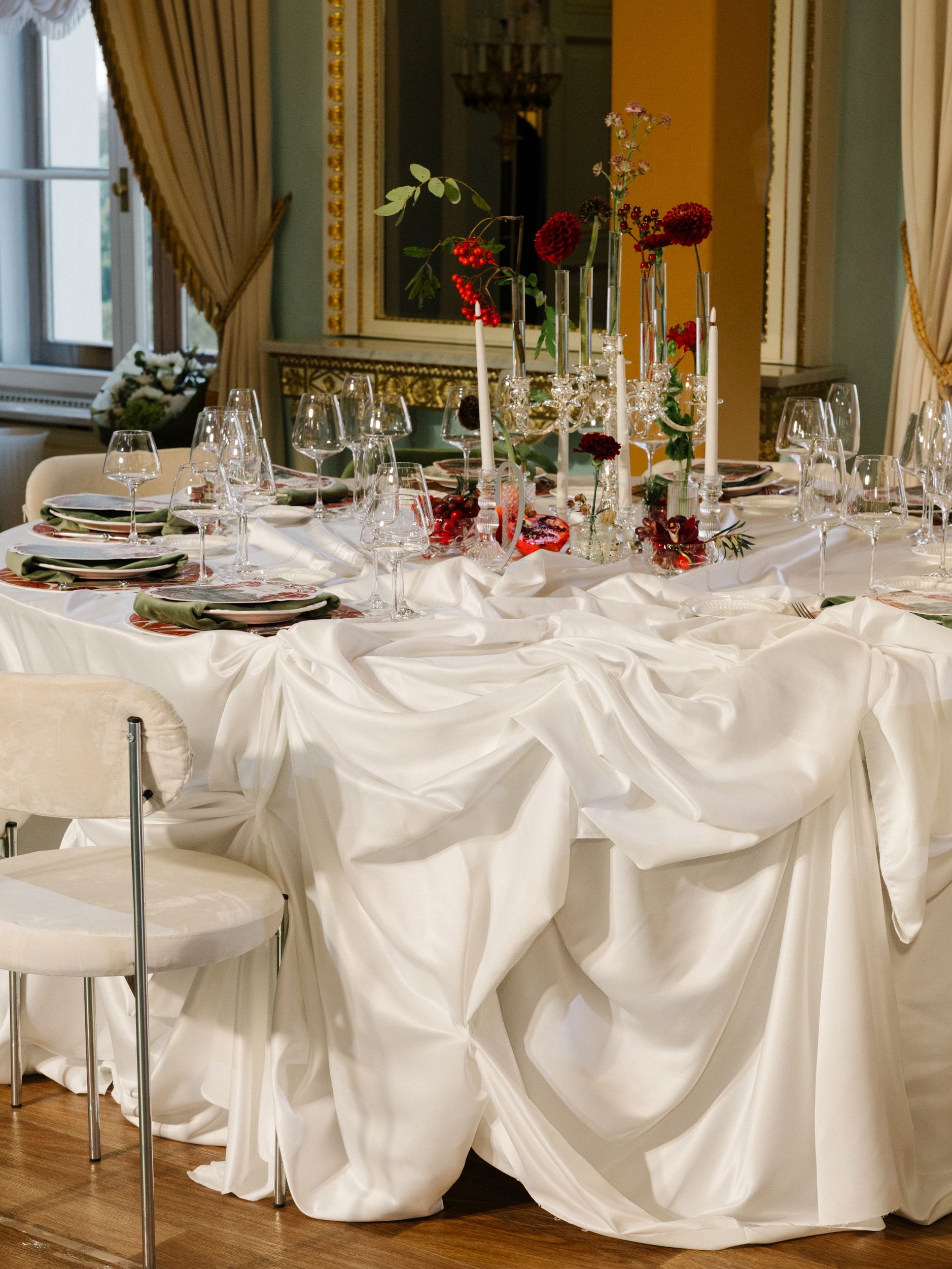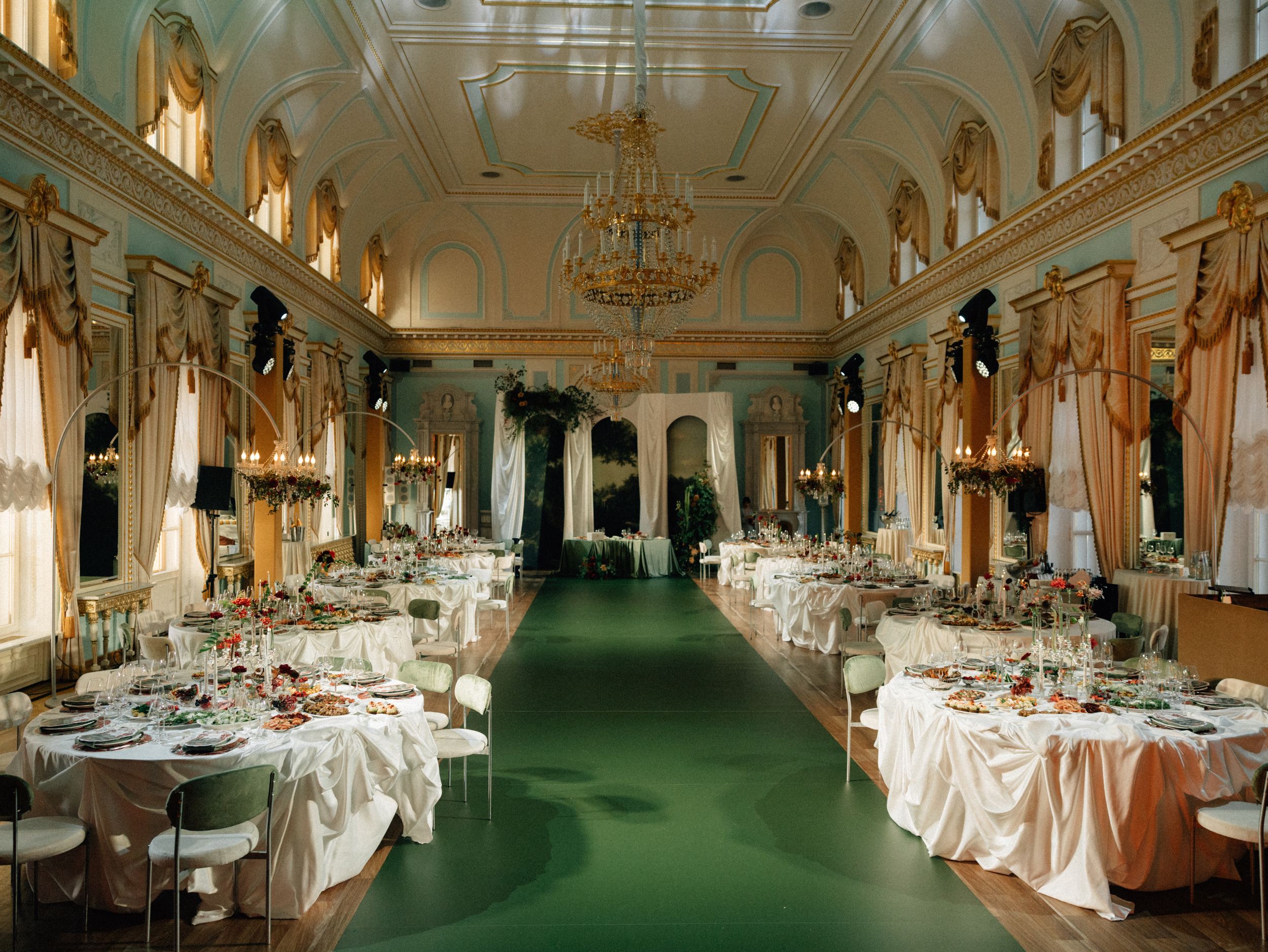 Константиновский дворец стал для них идеальным выбором: историческая локация с живописной усадебной эстетикой, созвучной духу павловских пейзажей. Задача была сложной: сохранить элегантность и масштаб пространства, но избежать вычурности. В основе — эстетика «винтажной сказки»: без прямых сказочных цитат, но с ностальгической романтичностью и глубокими цветами старинных полотен.