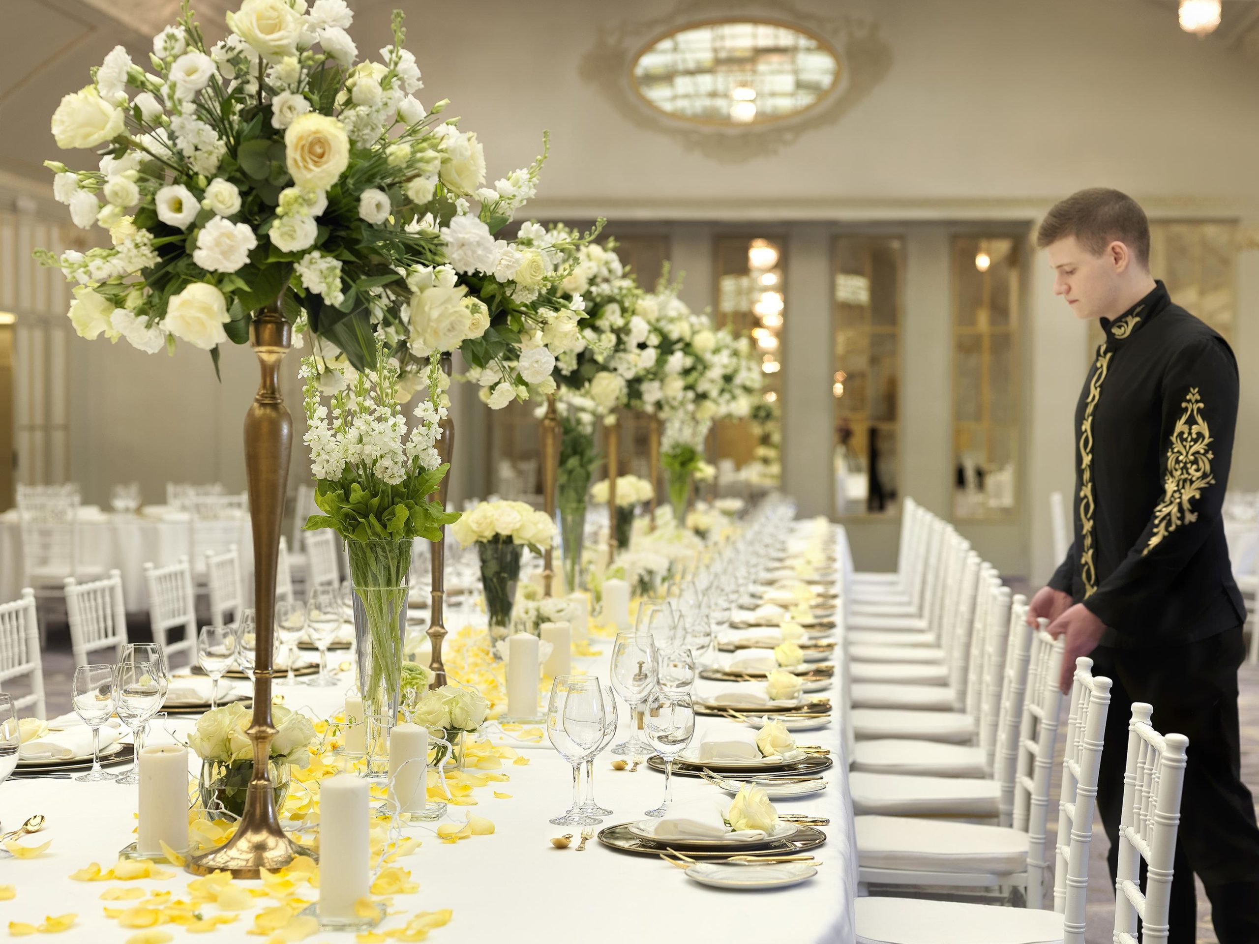 Благодаря изысканному интерьеру зал «Крыша» не нуждается в особом свадебном декоре — достаточно украсить столы цветочными композициями.