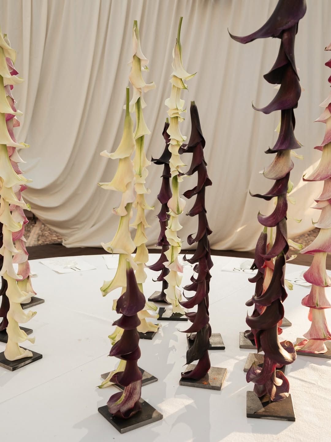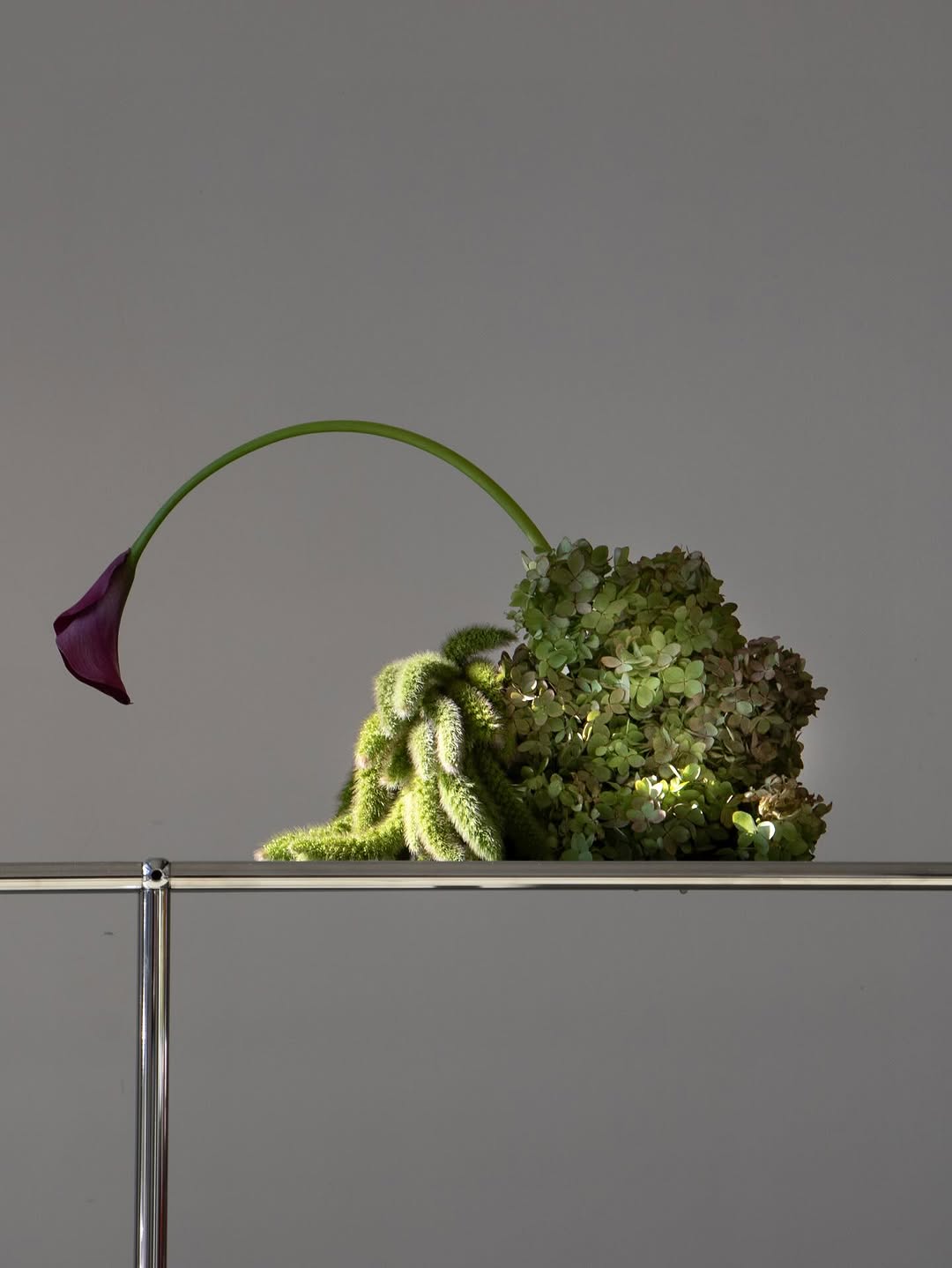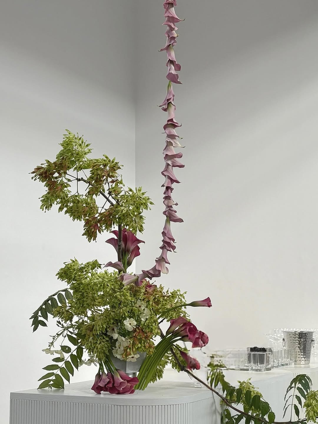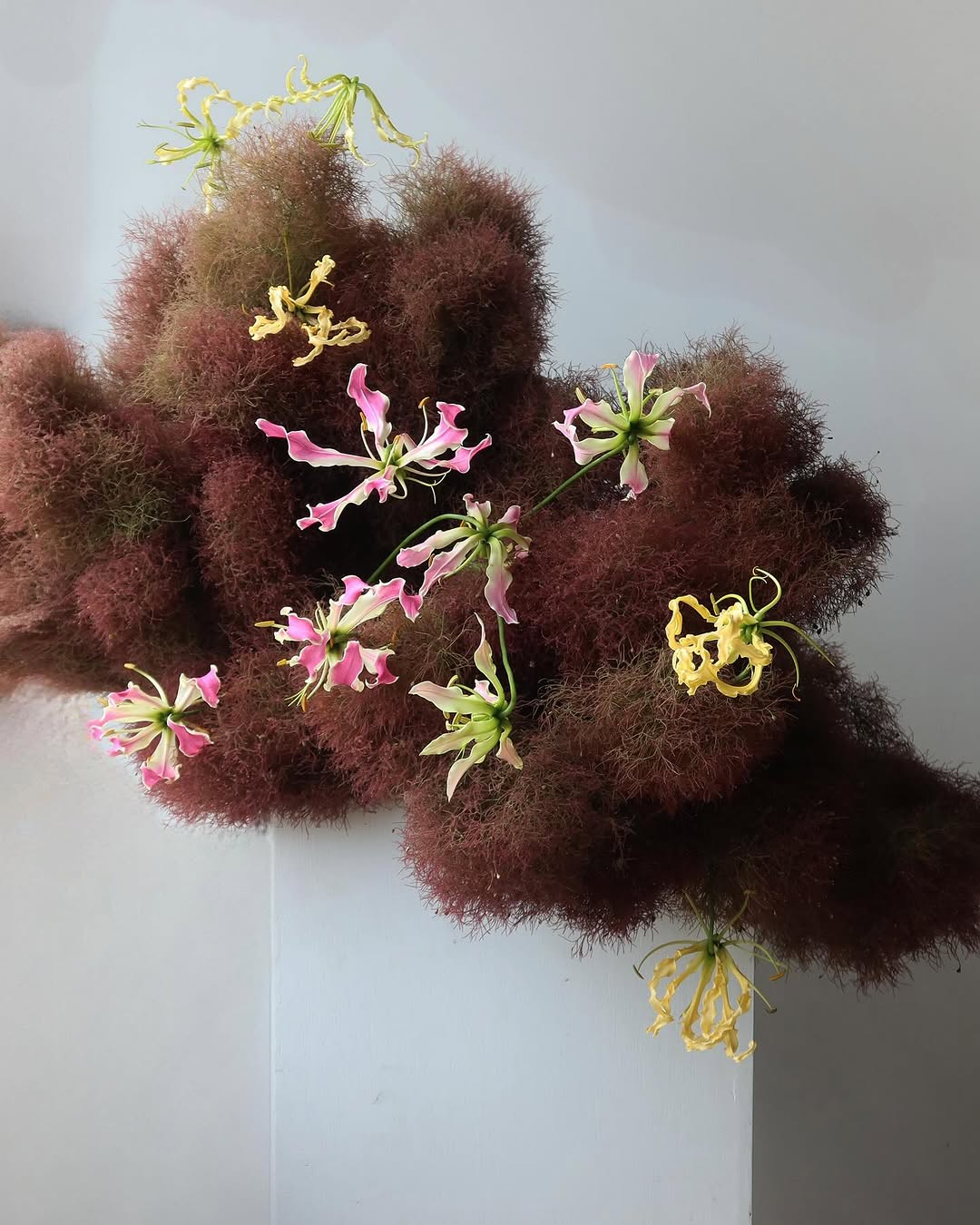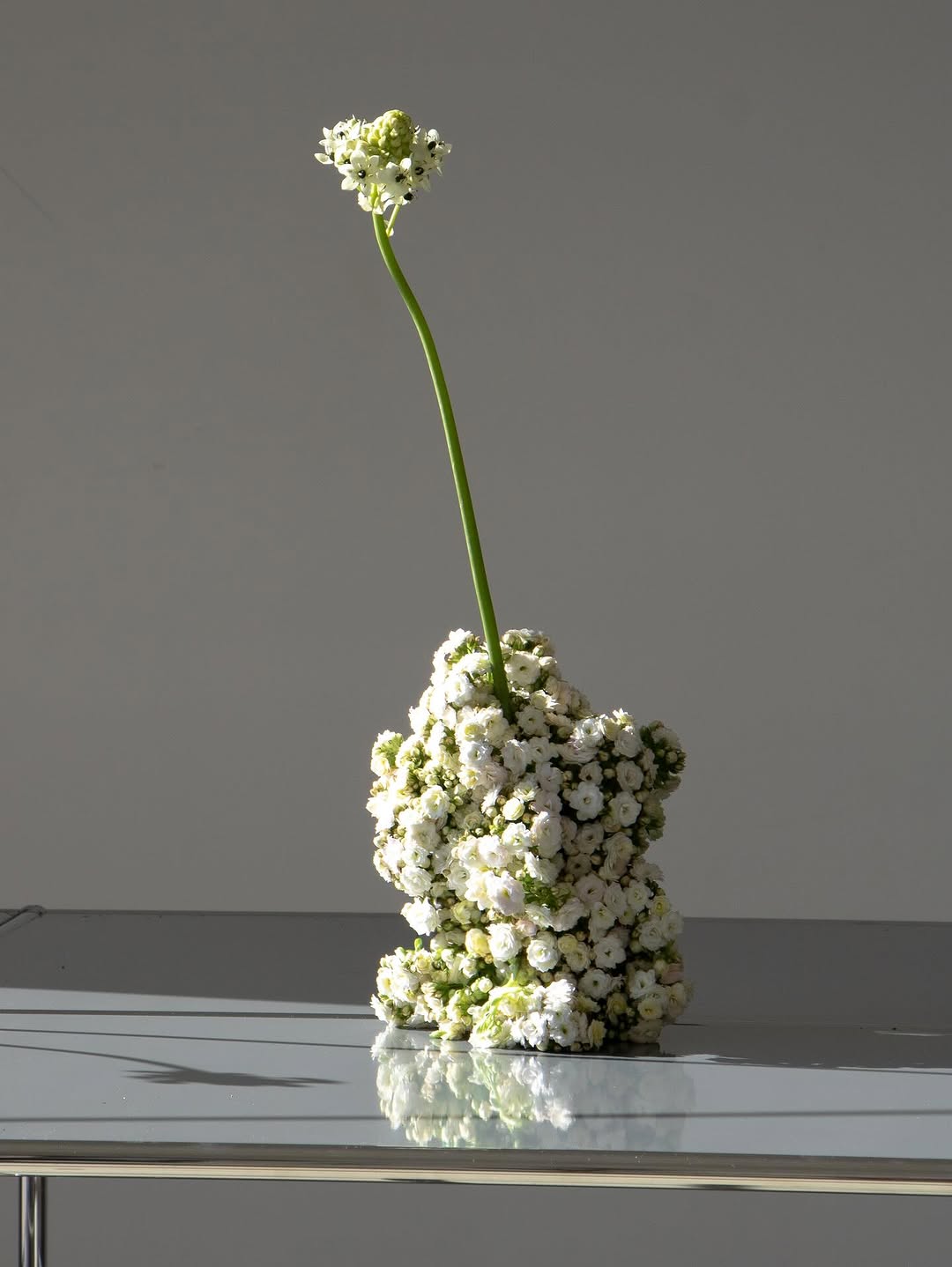 Цветы больше не «собирают» в букеты — их выстраивают. Стебли вытягиваются вверх, закручиваются по спирали, создаются линии и графичные формы. Композиции будто зависают в воздухе или вырастают из стола, нарушая привычное ощущение масштаба и гравитации.