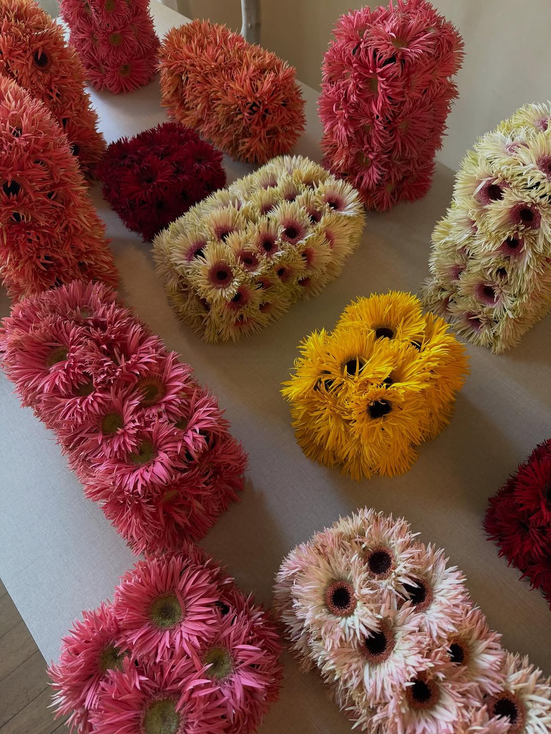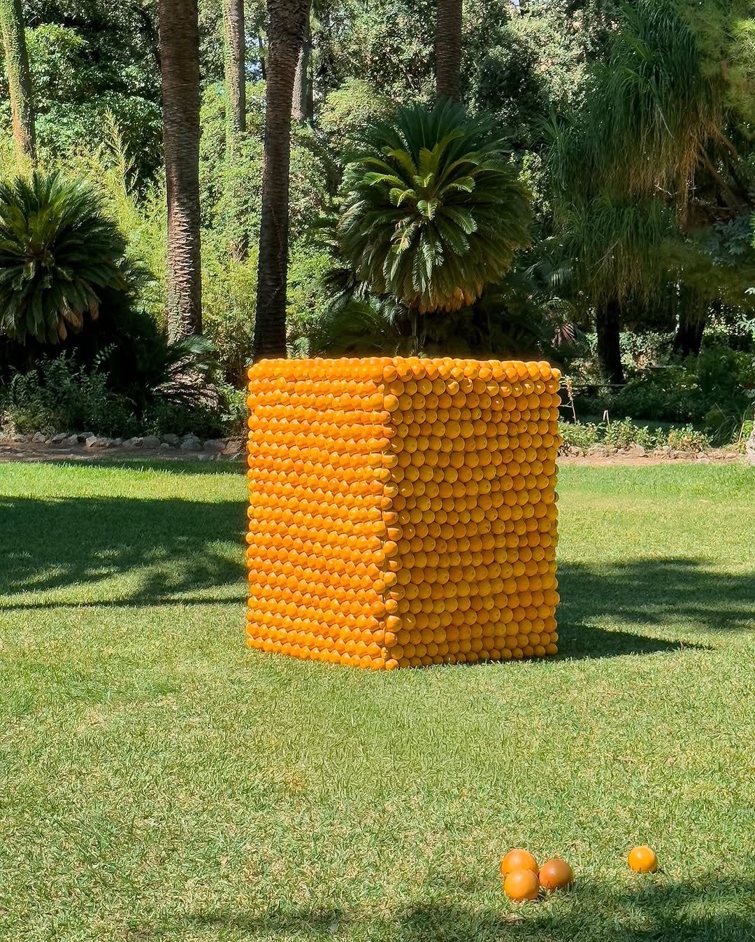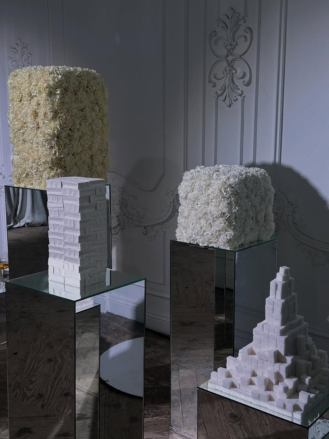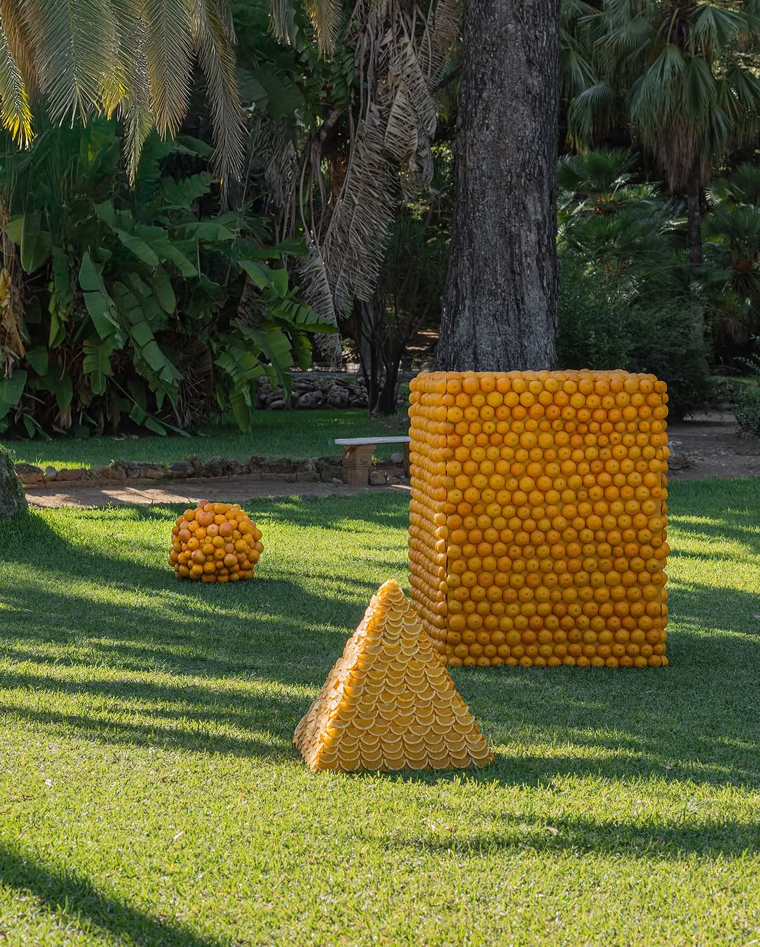 Цветы, фрукты и природные материалы превращаются в четкие геометрические фигуры — кубы, шары, колонны, пирамиды. Это не флористика в привычном смысле, а объектные инсталляции, встроенные в ландшафт или архитектуру площадки. В цветочном варианте они формируются из цветков с плотной фактурой — хризантем, гвоздик, васильков, собранных в «массу».
