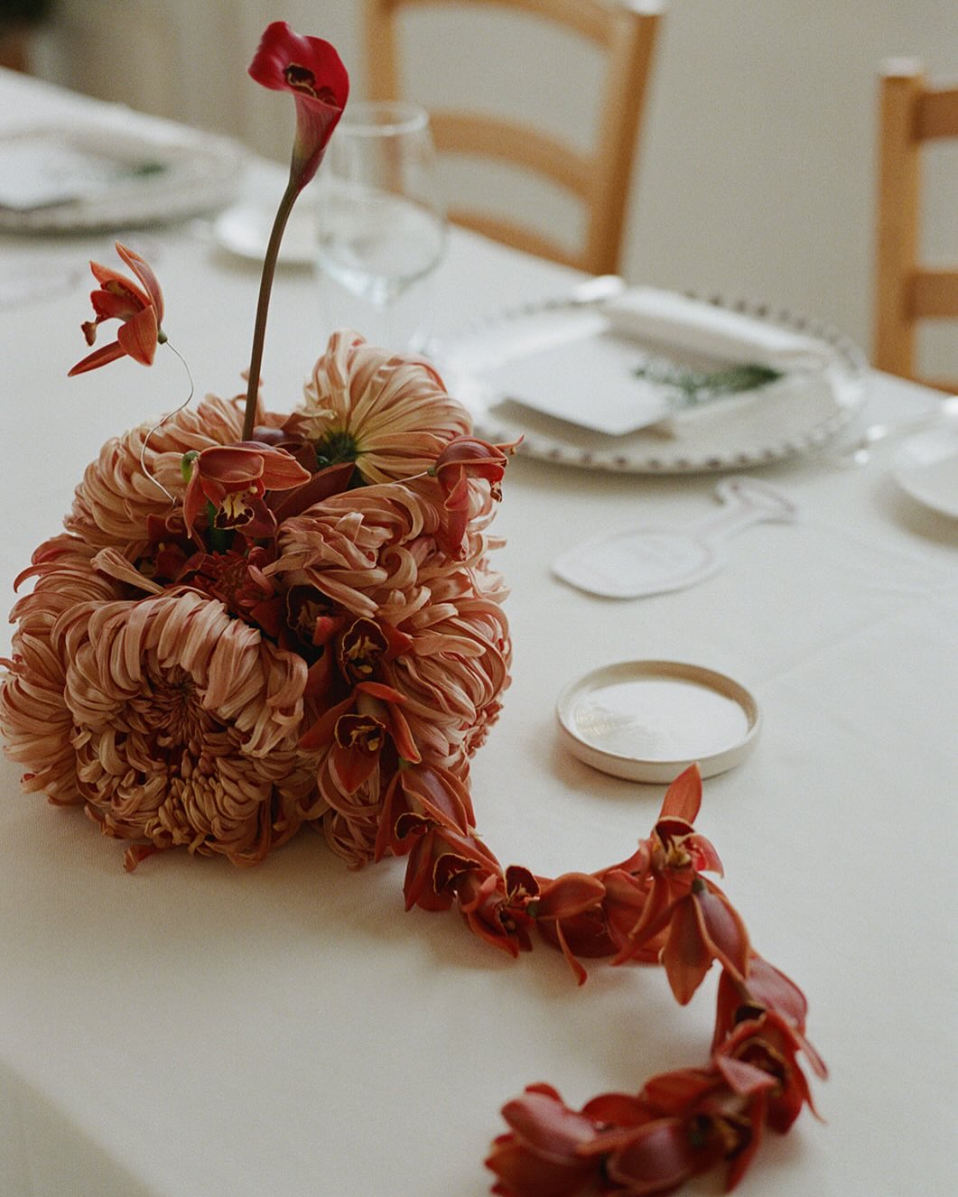 Такой декор не кричит о себе, но создает сильное визуальное напряжение, не заполняет собой стол и не конкурирует с сервировкой. А наоборот, «облегчает» визуальное восприятие оформления и подчеркивает архитектуру пространства. Главными героями тренда становятся каллы — за что большое спасибо их пластичности и скульптурности. На втором месте — лилии.