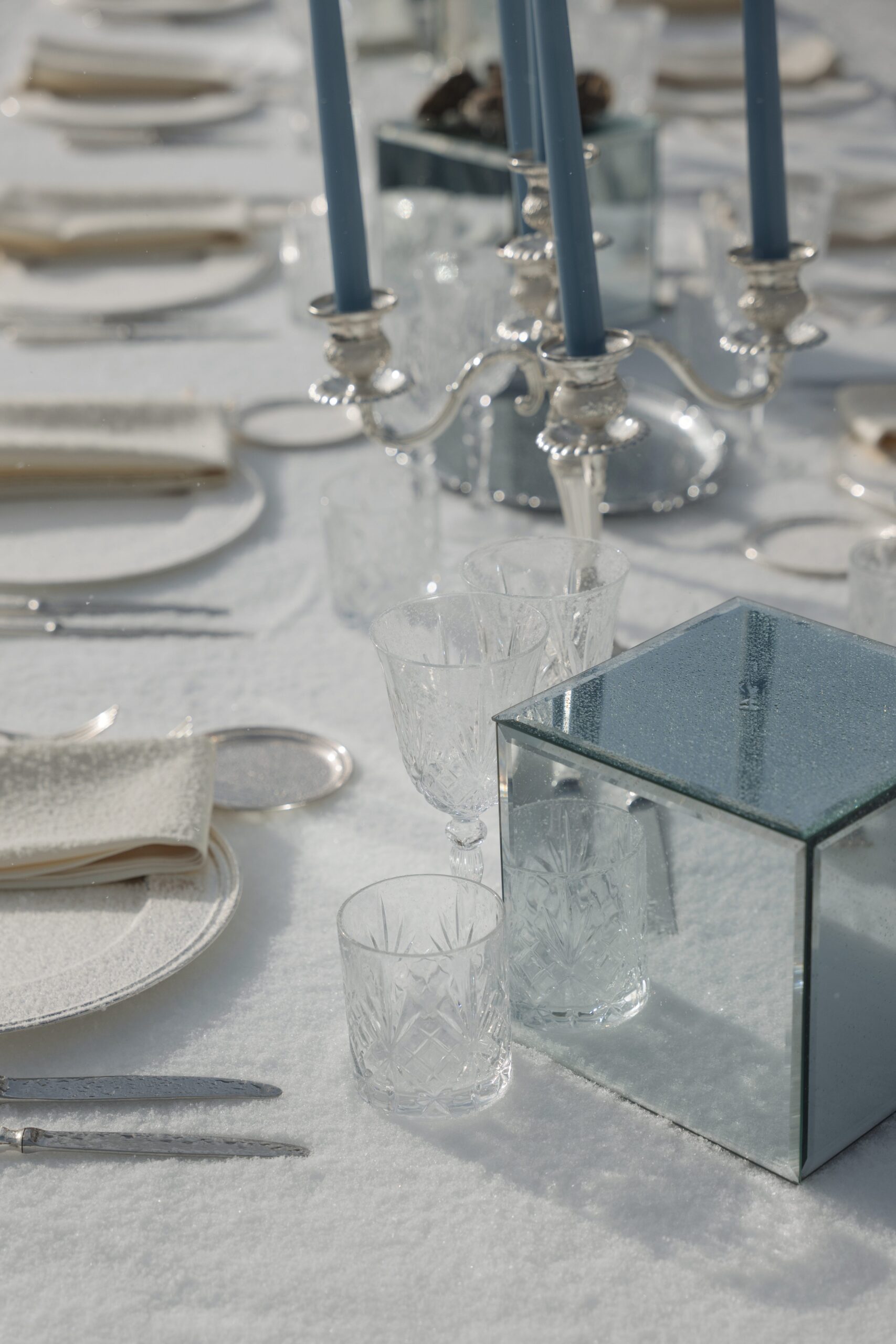 Ледяной декор, длинные свечи, тканевые драпировки и безупречные, продуманные до малейших деталей, образы пары, которая проявляется в свадьбе.