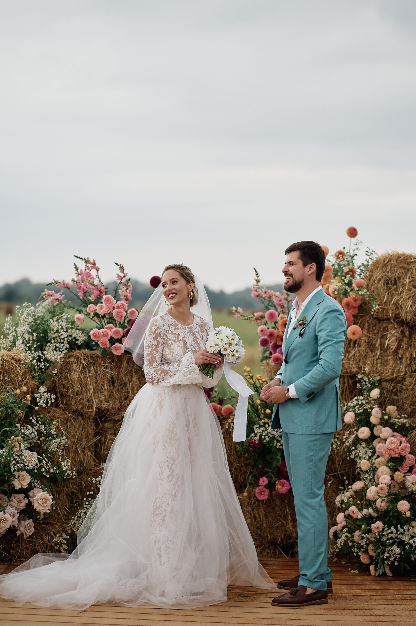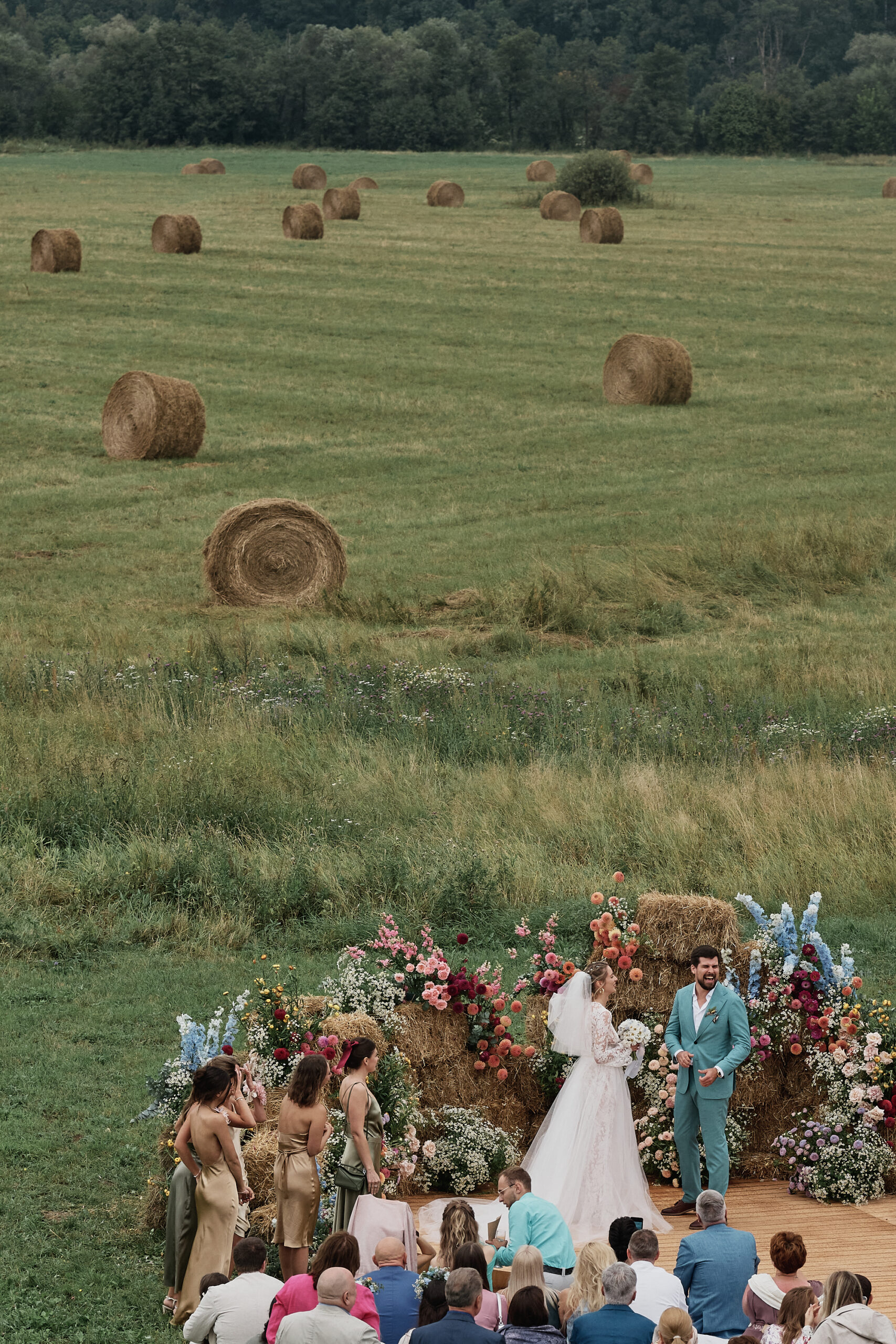 Одним из примеров современных проектов, где парам не интересны огромные декорации, а важны смыслы, стала свадьба «Просто любовь», организованная Wedding People в 2023 году. Паре необходимо было рассказать своим гостям о том, почему для них важны самые, казалось бы, простые вещи: ценности семьи, любви, дружбы, привязанность к месту, где живешь. И мы предложили им русское поле, очень простые и понятные образы и на церемонии, и в зале, но собранные как арт-инсталляция. А сам вечер был построен на базе 10 заповедей, которые стали кодексом их семьи. Режиссура вечера предполагала множество творческих номеров и от пары, и от гостей.