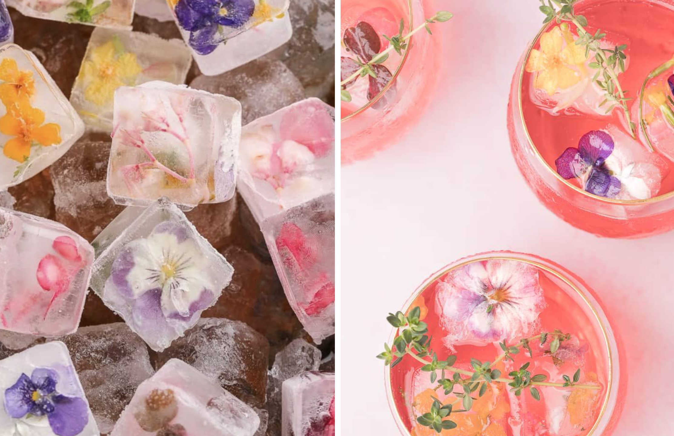 Лед с цветами или ягодами — это не только красивый, но и практичный элемент подачи напитков на свадьбе. Он не только охлаждает напитки, но и превращает каждую подачу в произведение искусства. Задумайтесь, как эффектно будет смотреться ваш коктейль с шикарными кусочками льда, в которых заморожены цветы или ягоды. Выберите цветы, которые подходят к вашему свадебного букету или к флористическому оформлению.