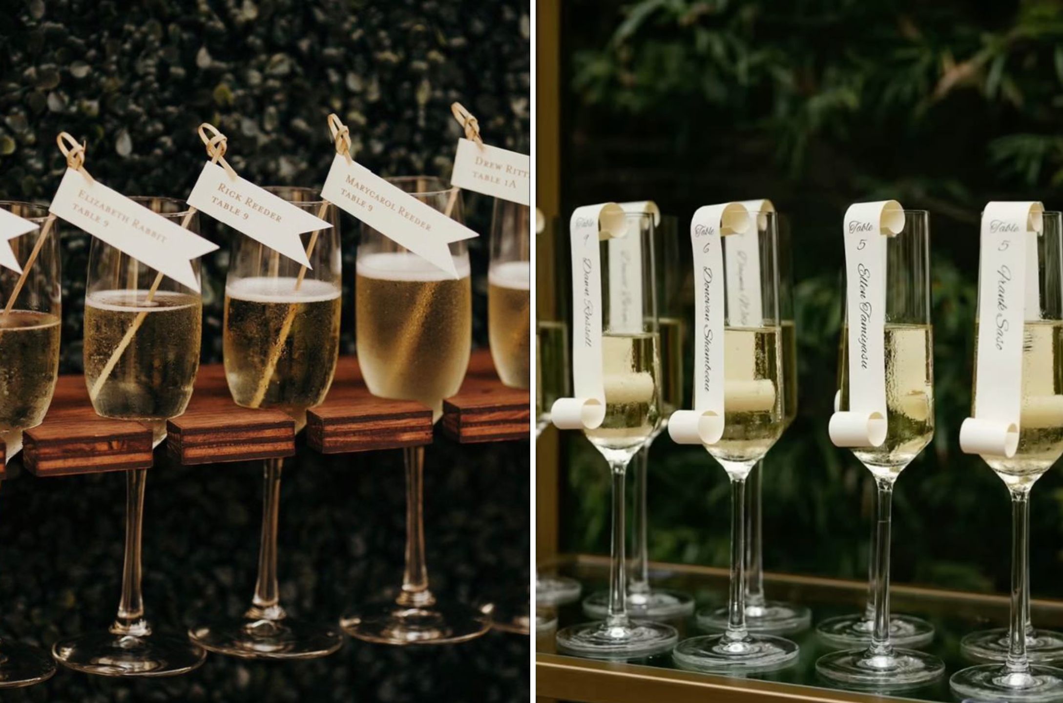 Записки с номерами столиков — это еще один способ сделать подачу напитков более персонализированной. Вместо обычных карточек вы можете использовать красивые бумажки, оформленные в едином с вашей свадьбой стиле. Например, вы можете выбрать экологически чистую бумагу с текстурой и цветами, подходящими к общей концепции вашего дизайна. На каждой записке можно указать имя и номер столика. Можно повесить на бокал миниатюрный папирус или закрепить бумажку деревянной прищепкой на краю.