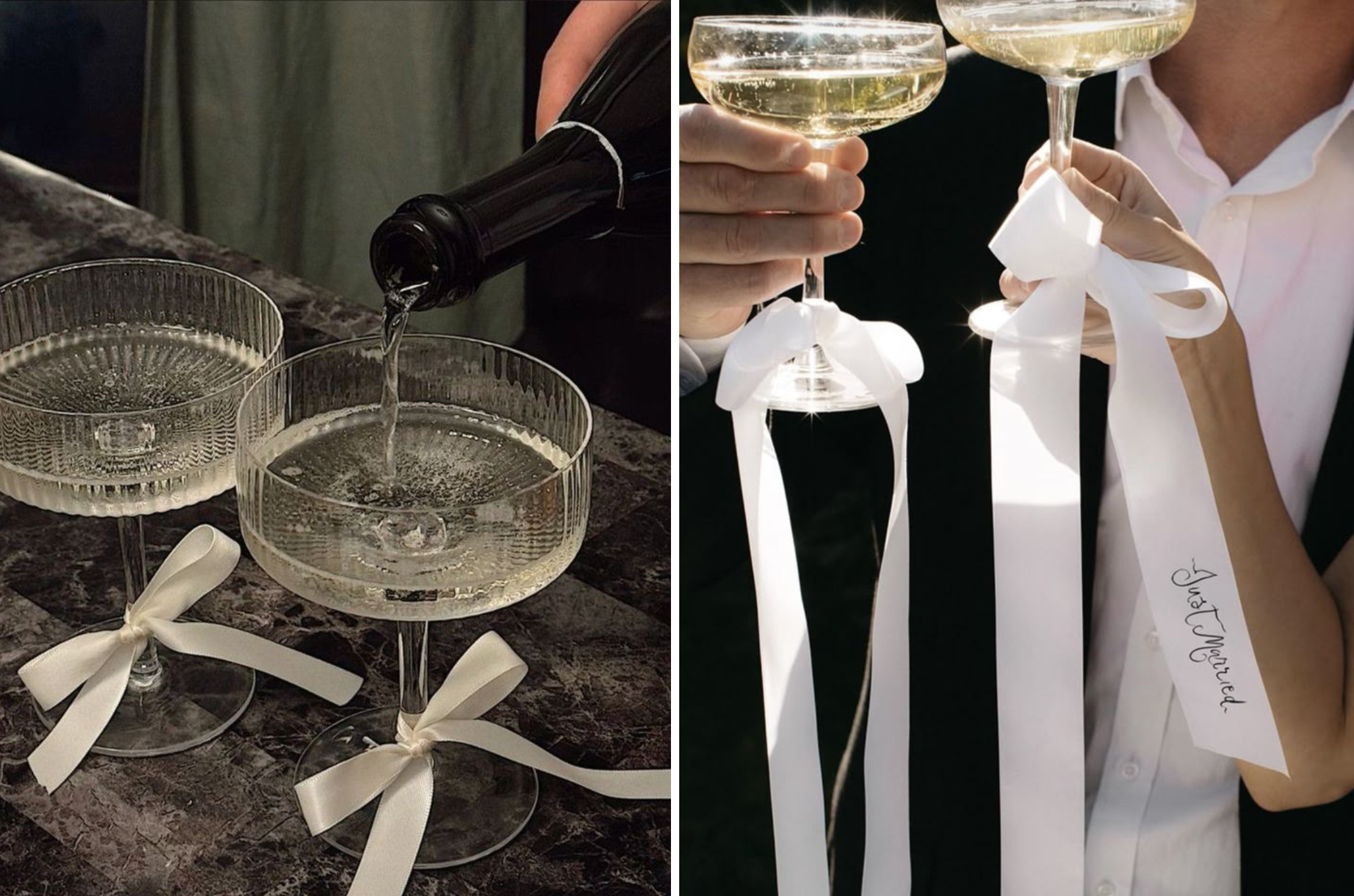 Одним из самых простых, но эффектных способов сделать подачу напитков на свадьбе запоминающейся могут стать атласные ленты. Яркие и нежные ленты отлично дополняют бокалы с коктейлями. шампанским и безалкогольными напитками. Вы можете выбрать ленты в палитре вашей свадьбы или даже с текстурой, которая подходит к общей концепции. Ленты можно повязать на ножках бокалов, тем самым придав им изысканный вид.