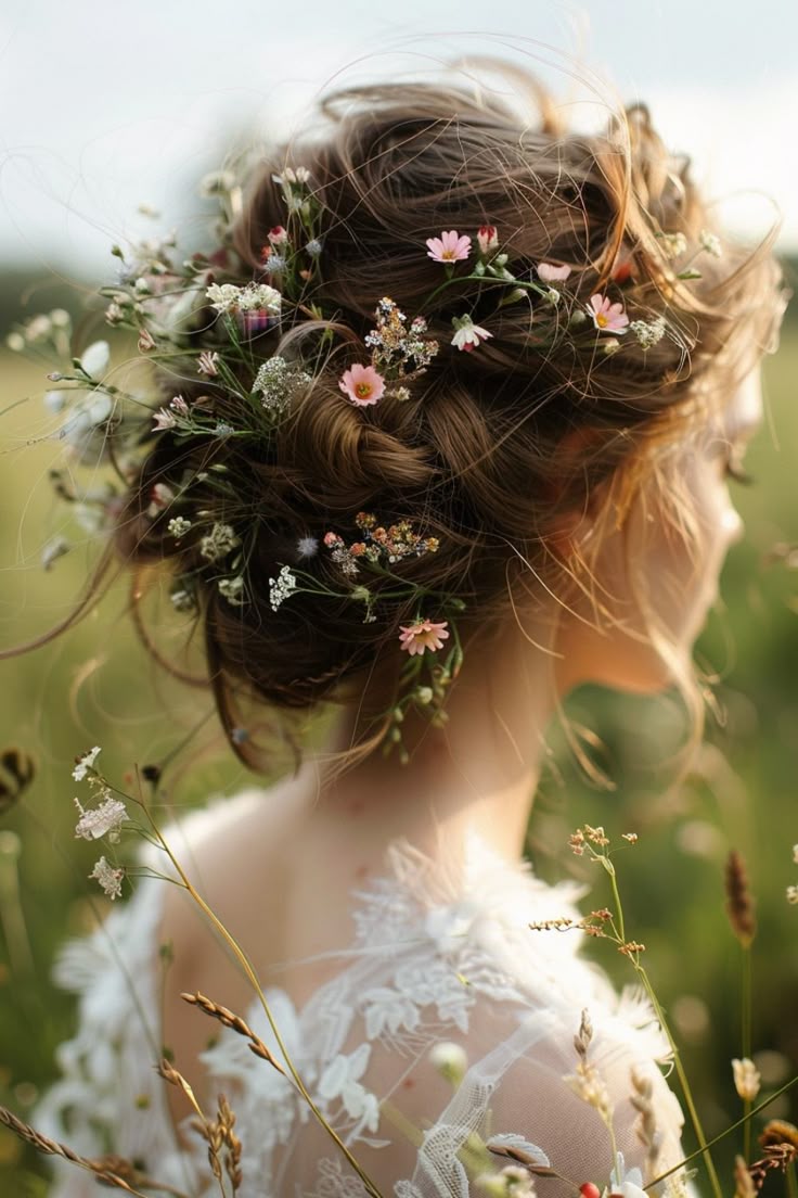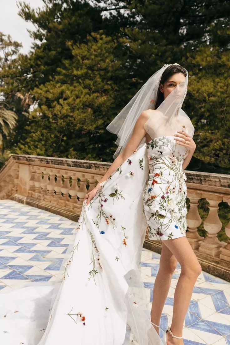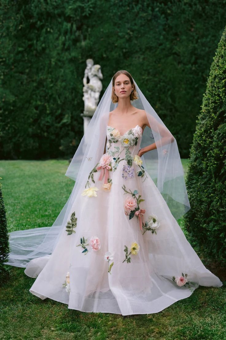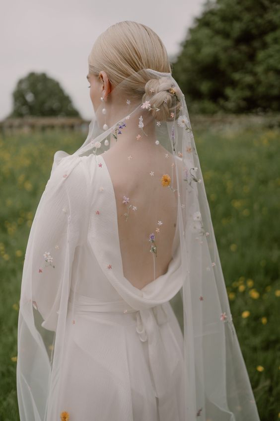 Для такой свадьбы отлично подойдет платье из кружева, из полупрозрачной ткани с вышивкой или же с цветочными мотивами. Платье можно выбрать и классическое и обыграть его аксессуарами — серьги с цветочными мотивами, венки, обувь или клатч с вышивкой. Фата с утонченной цветочной вышивкой — оригинальная и симпатичная идея для наряда невесты.