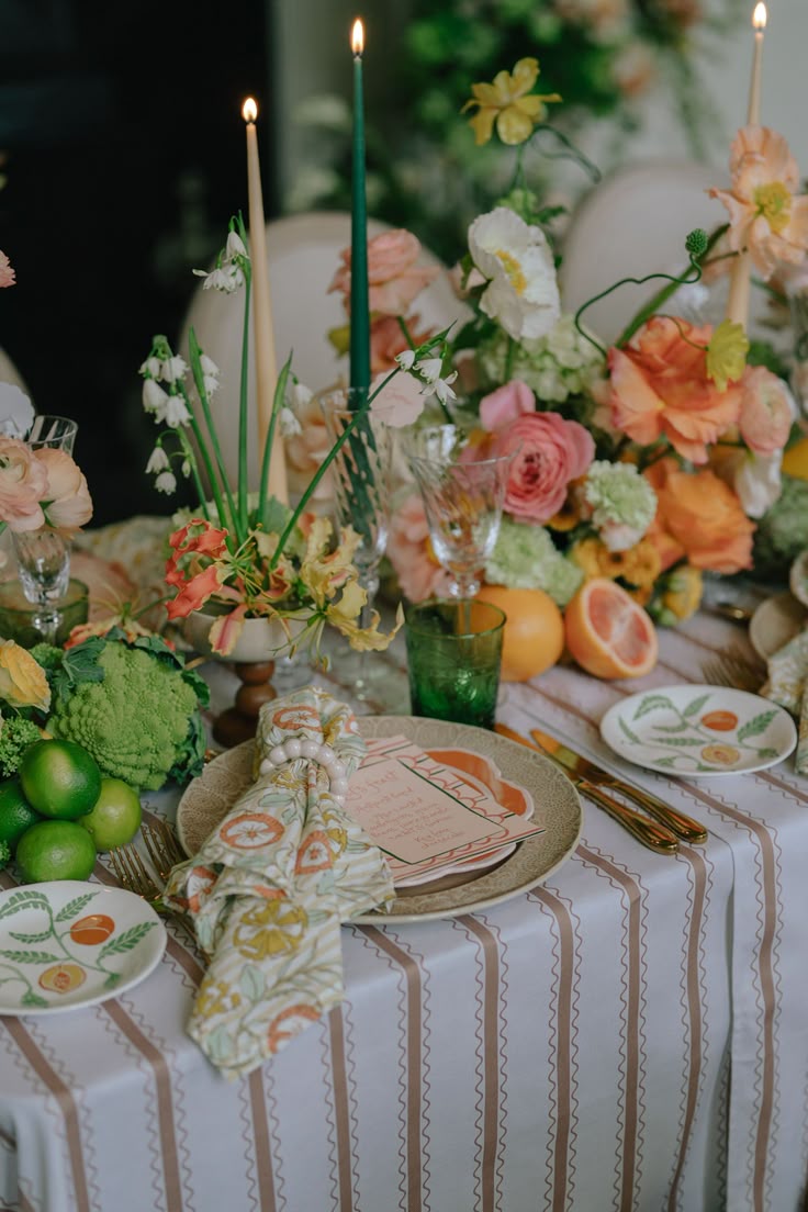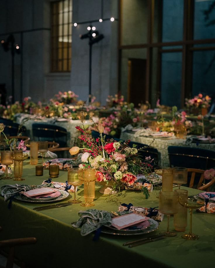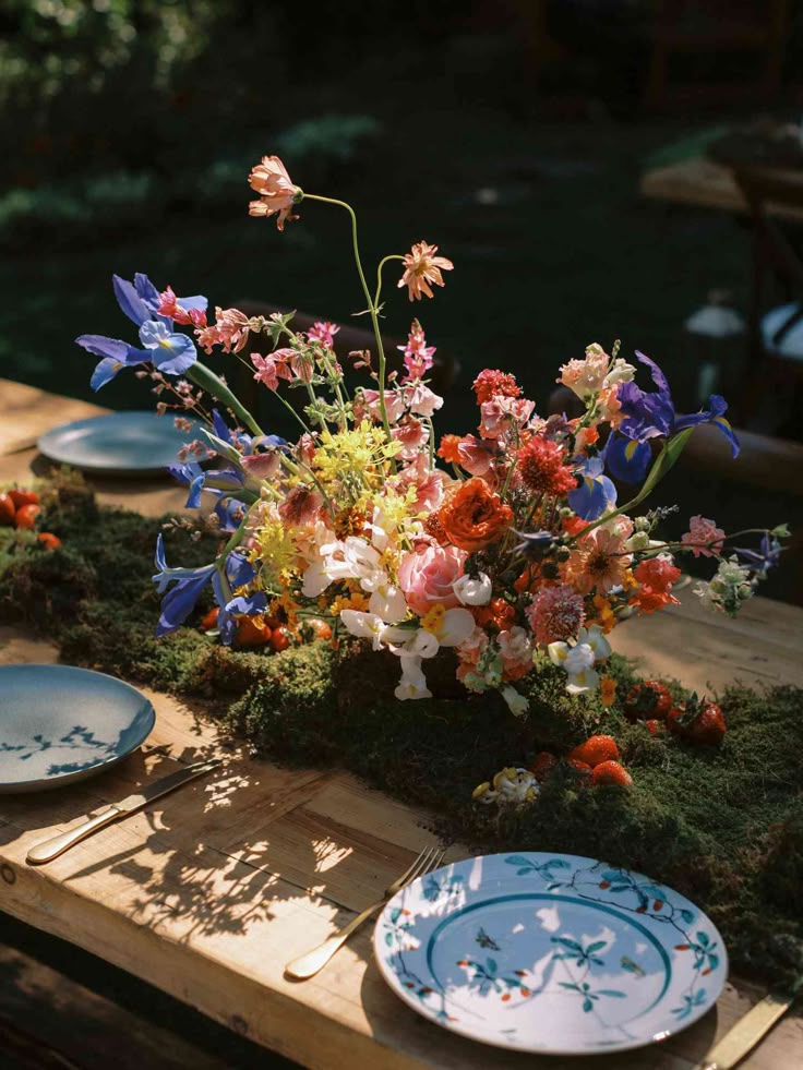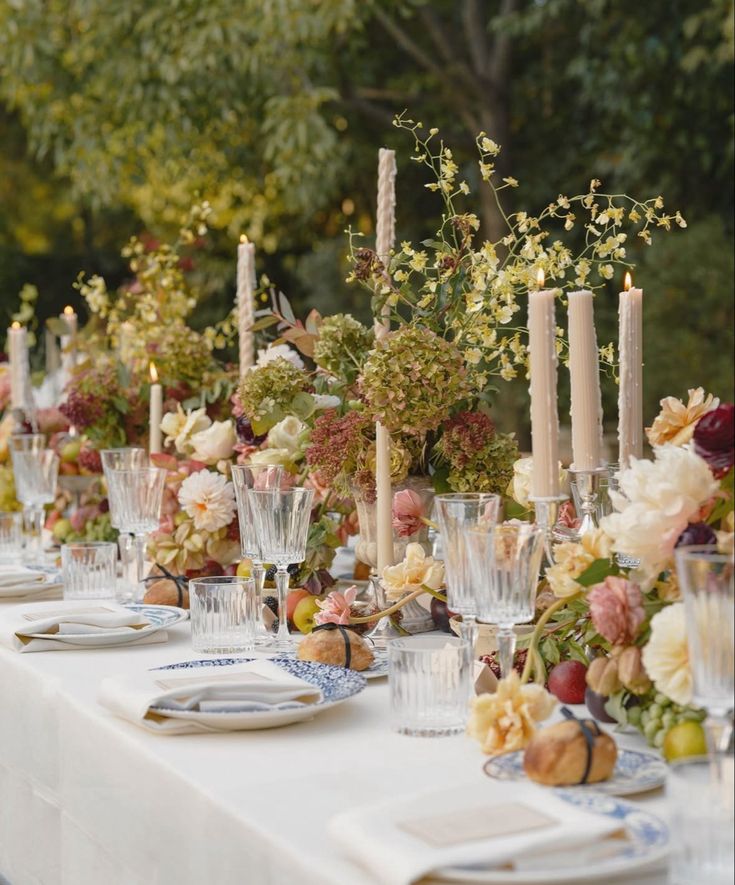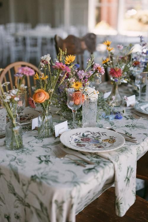В случае с сет-дизайном в стиле коттеджкор можно дать волю фантазии. Можно использовать скатерти изо льна или хлопковые варианты с принтами. Пестрая посуда, хрустальные бокалы и вазы, фарфоровый сервиз и цветочные элементы тоже будут выглядеть уместно. И не бойтесь переборщить, чем больше деталей, тем более полной выглядит вся картина.