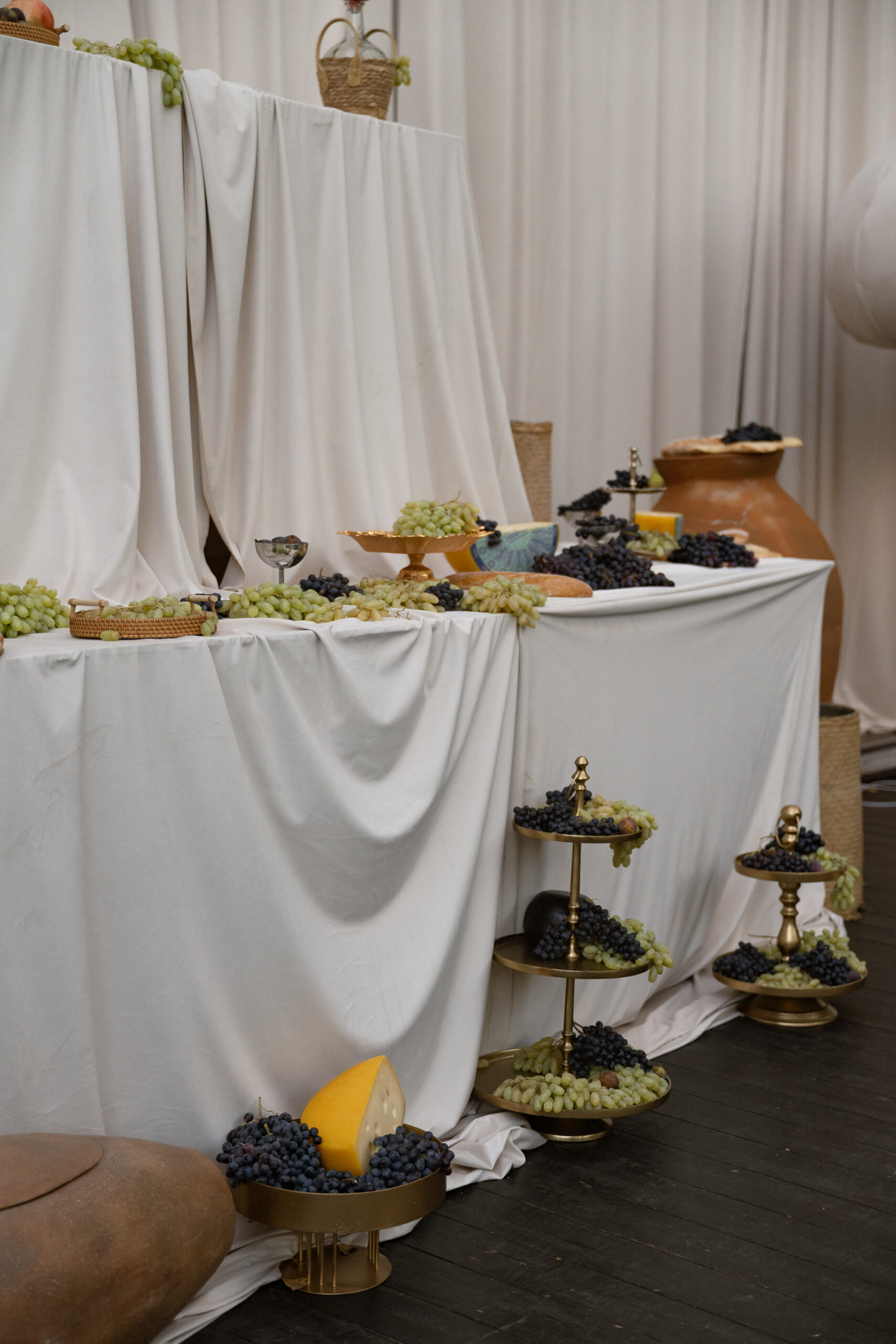 Первое касание гостя с тематикой свадьбы происходит именно в зоне welcome, поэтому так важно с помощью элементов декора, определенных интерактивов и активностей сразу погрузить в концепцию праздника, при этом сильно не перегружая. Дело в том, что первые минуты (даже первый час) любого мероприятия — это время, когда гости присматриваются друг к другу, изучают локацию, знакомятся и делятся первыми впечатлениями. Немного уставшие после дороги, они точно захотят стакан воды или бокал шампанского. Нужно предусмотреть и легкие закуски, так как от момента появления гостей до банкета проходит минимум два часа — не стоит оставлять их голодными. После гости точно будут готовы принимать участие в интерактивах, если те предусмотрены.