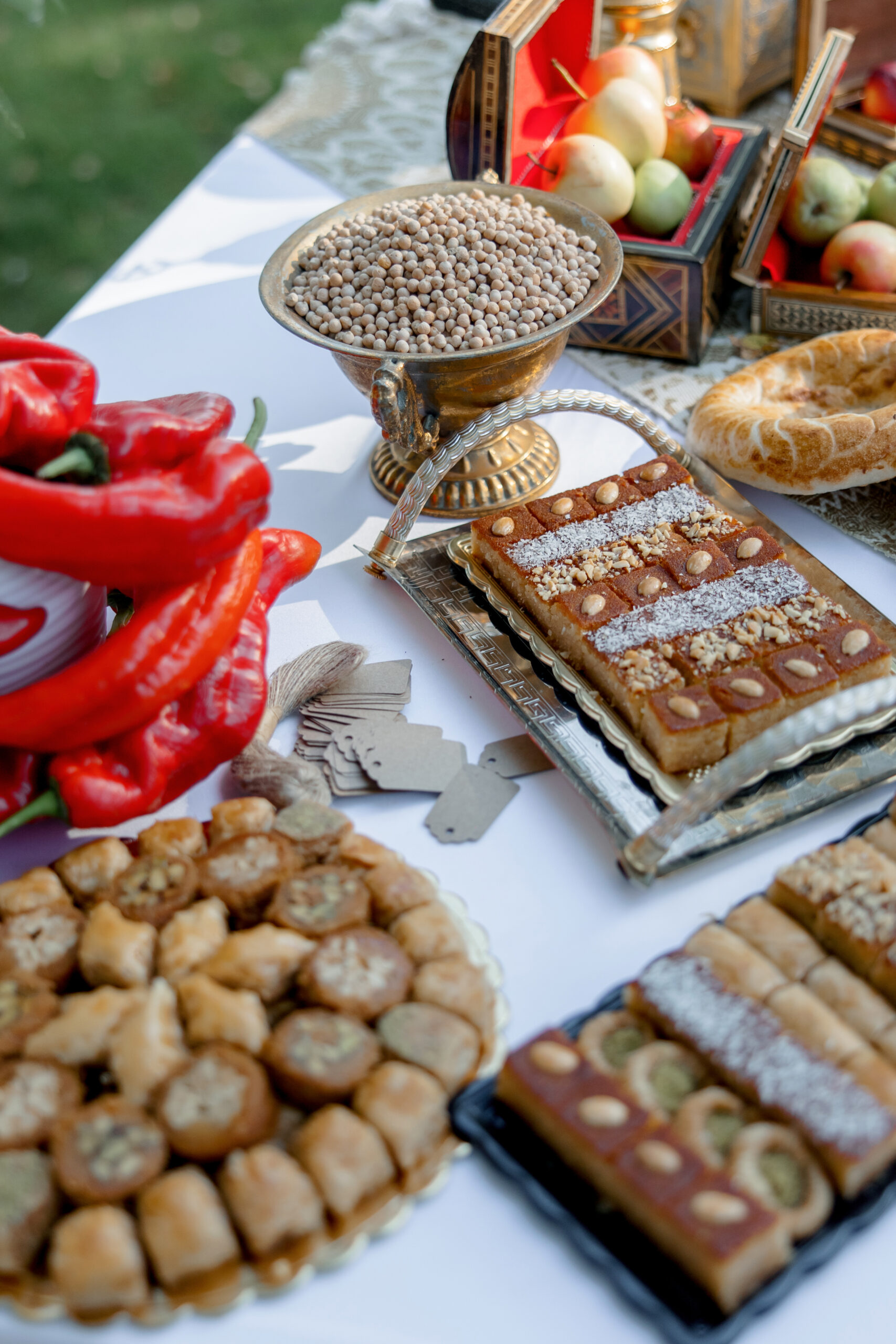 Для Алисы и Баселя мы оформили восточную историю. Лепешки, сладости, нут, лимоны, красные перцы и персики напоминали гостям о детстве жениха. В детстве он часто приезжал к бабушке в деревню Баата в Ливане, там, в ее саду, росли персики. Много лет спустя он с особой теплотой вспоминал детство и те самые персики. Это его нить памяти с любимой бабушкой. Поэтому коробка воспоминаний с персиками встречала гостей на welcome, они украшали и выездную церемонию. Если мы добавляем в декор личные моменты, всегда стараемся делать текстовые открытки, чтобы пояснять гостям смысл того, что они видят перед собой.